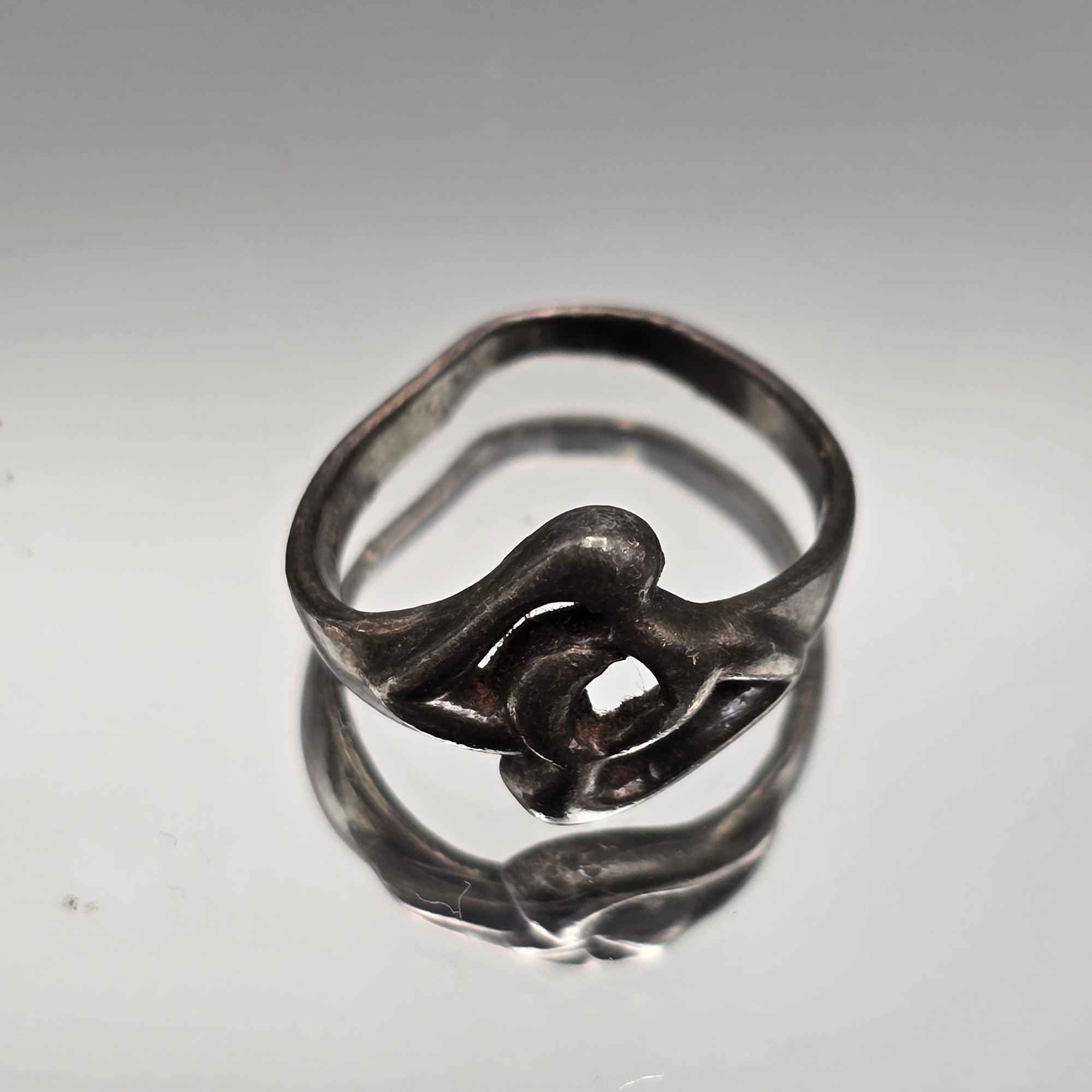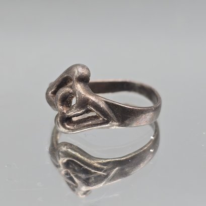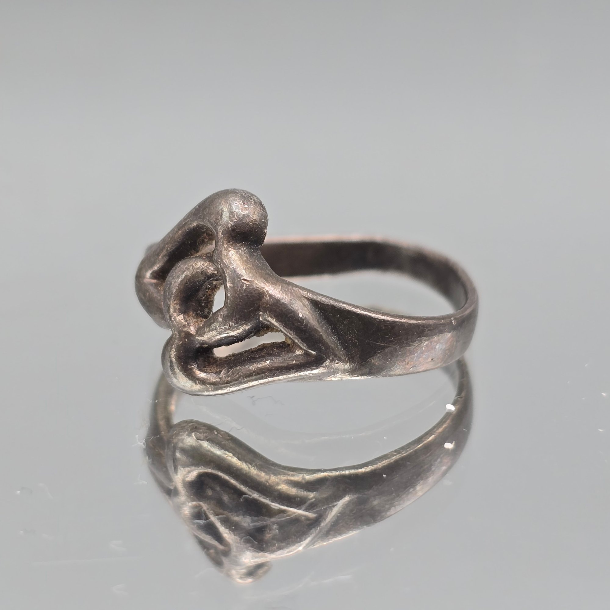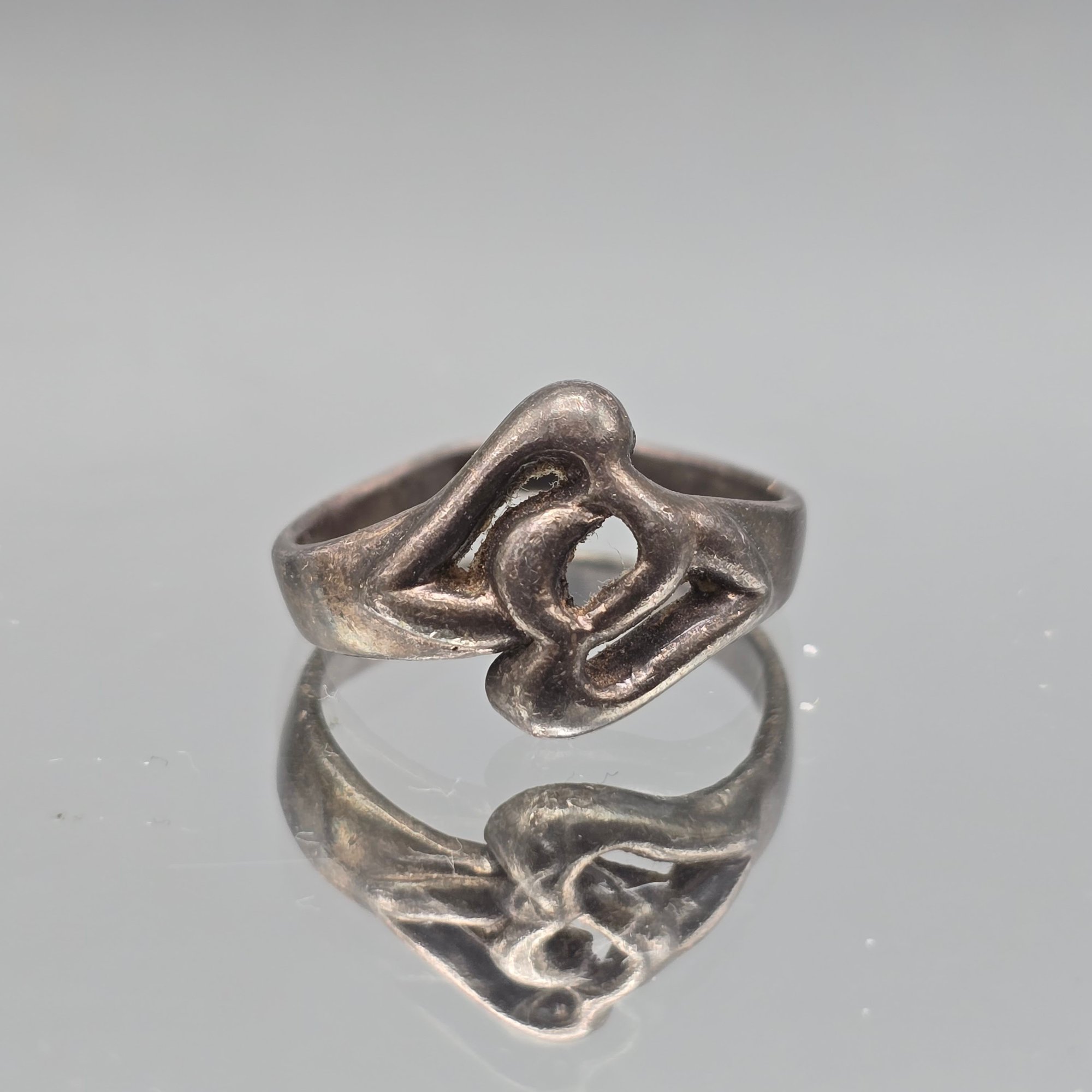 This vintage sterling silver ring features a unique, hand-crafted abstract design of interlocking open hearts and sits at a size 6.75 on a professional jeweler's mandrel
