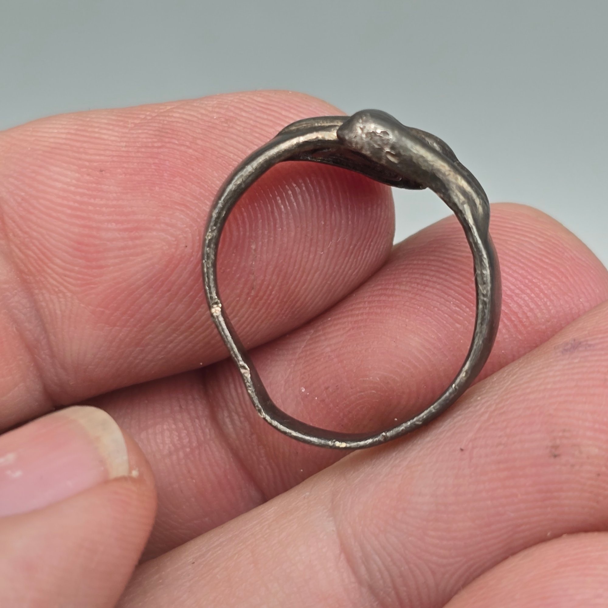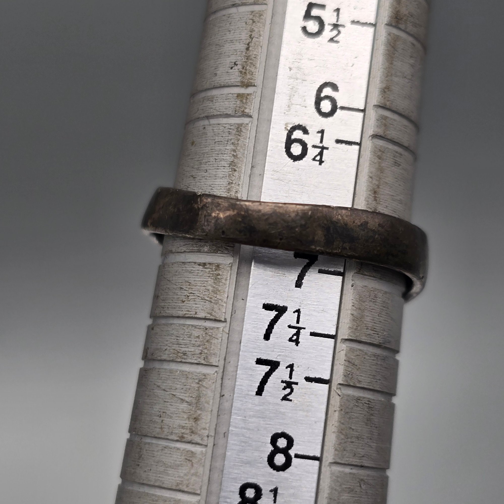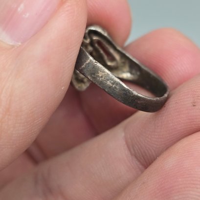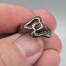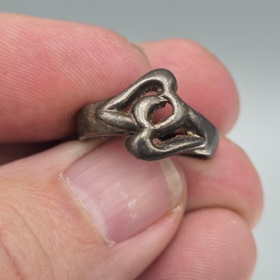 This vintage sterling silver ring features a unique, hand-crafted abstract design of interlocking open hearts and sits at a size 6.75 on a professional jeweler's mandrel