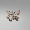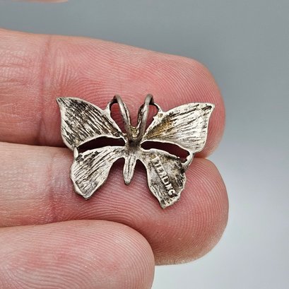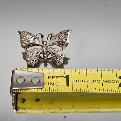This delicate sterling silver pendant features an intricate openwork filigree design across the wings, capturing a classic vintage aesthetic. Measuring approximately one inch in width, the reverse side is clearly hallmarked "STERLING" and includes dual loops for secure suspension on a chain.
