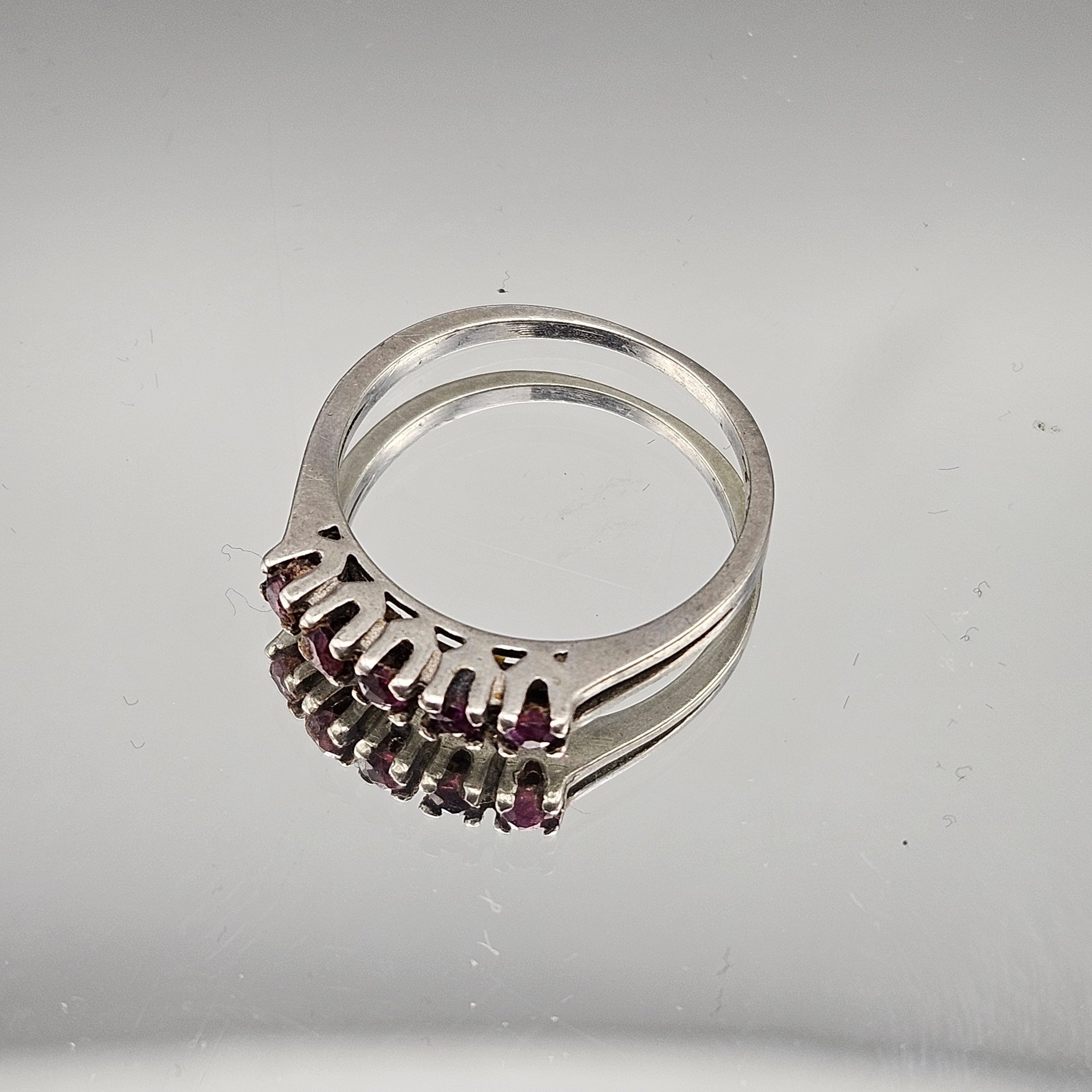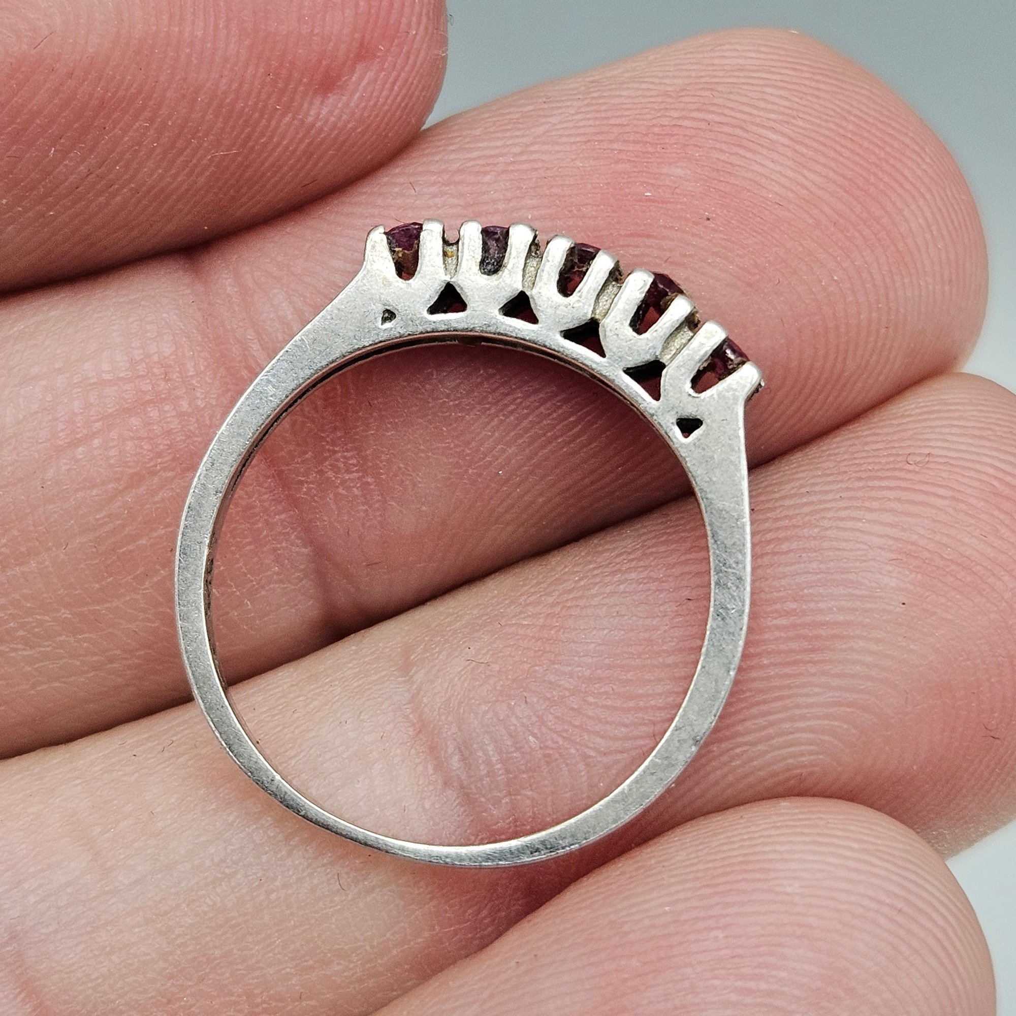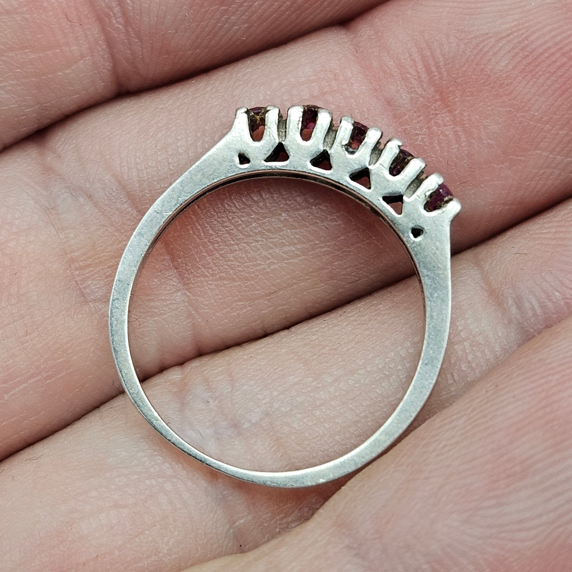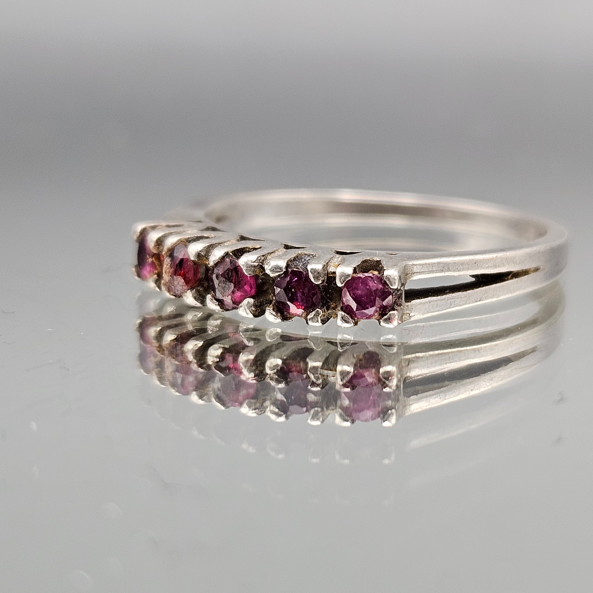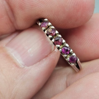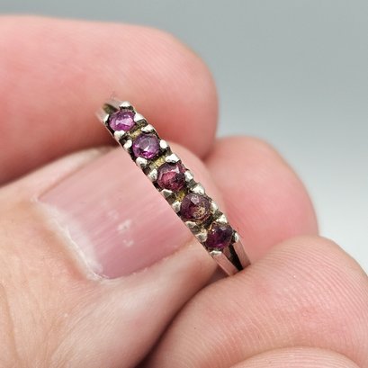 This elegant ring features five round-cut red stones securely held in a classic prong setting on a slender sterling silver band. The minimalist design showcases the rich pinkish-red hues of the gemstones