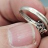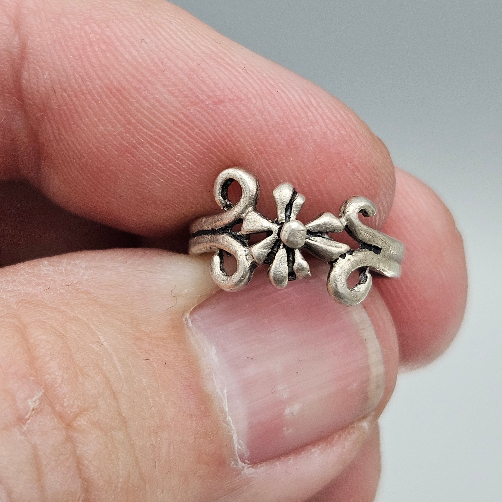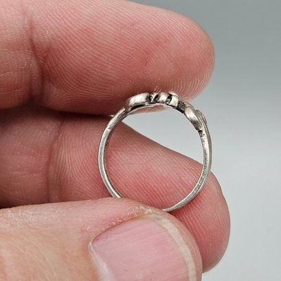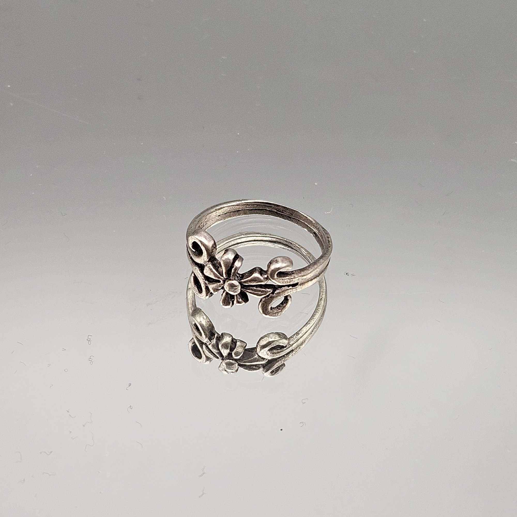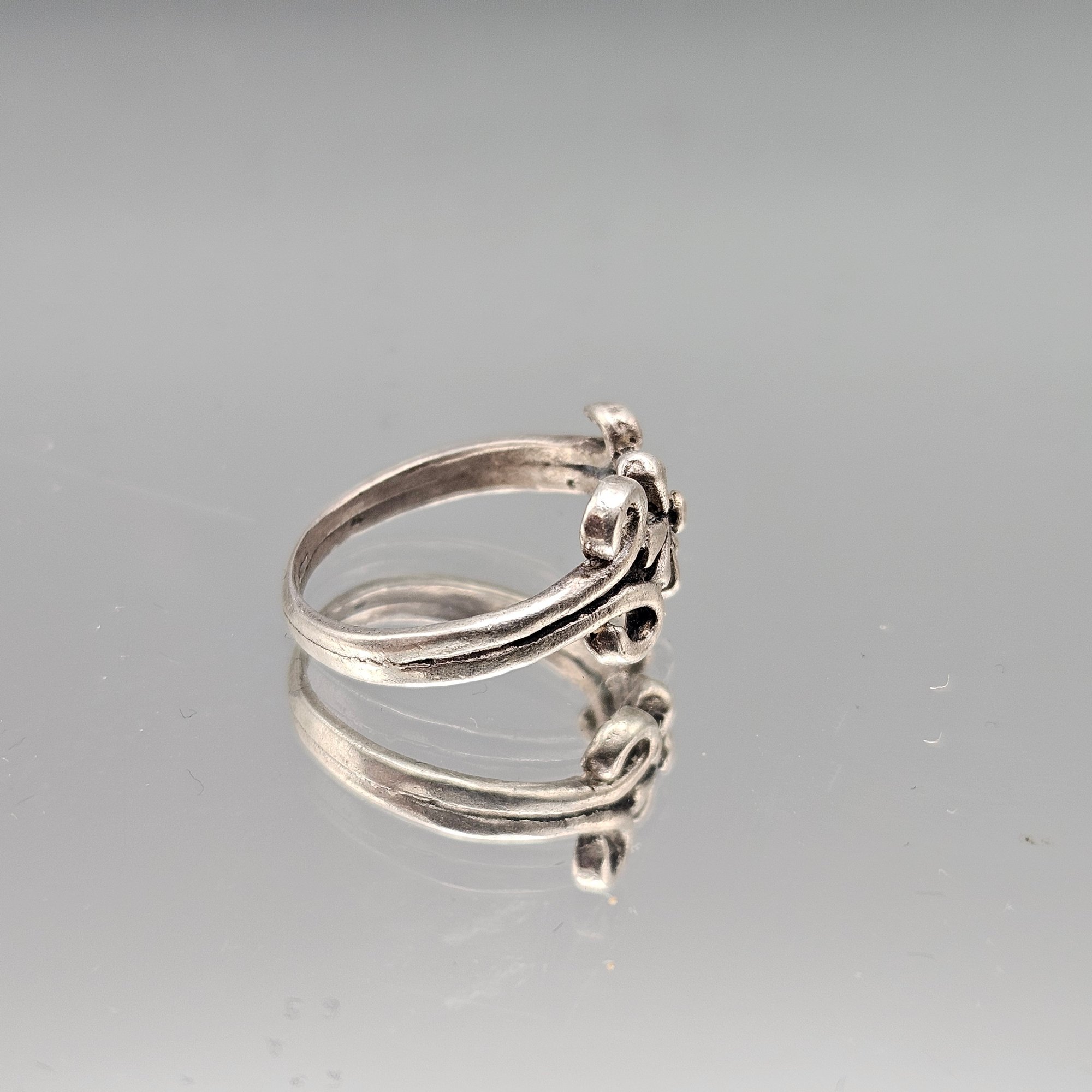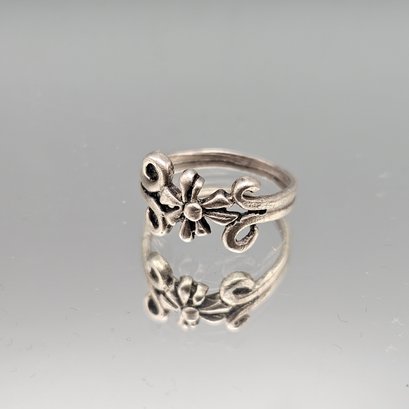 This dainty sterling silver ring features a central daisy motif flanked by elegant, openwork scrolling flourishes that create a romantic filigree aesthetic. The piece is finished with a deep antiqued patina to emphasize its intricate textures and currently measures as a size 4.