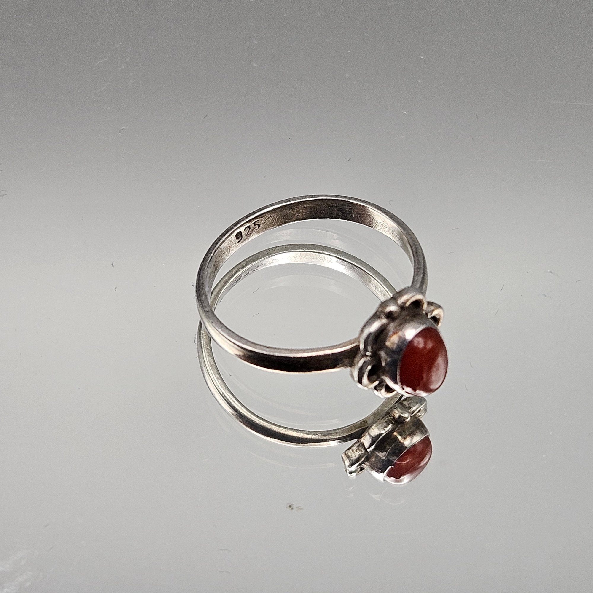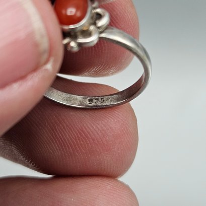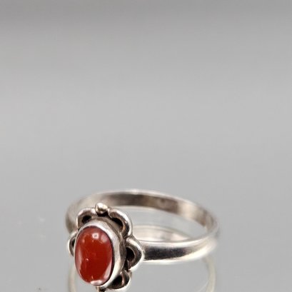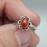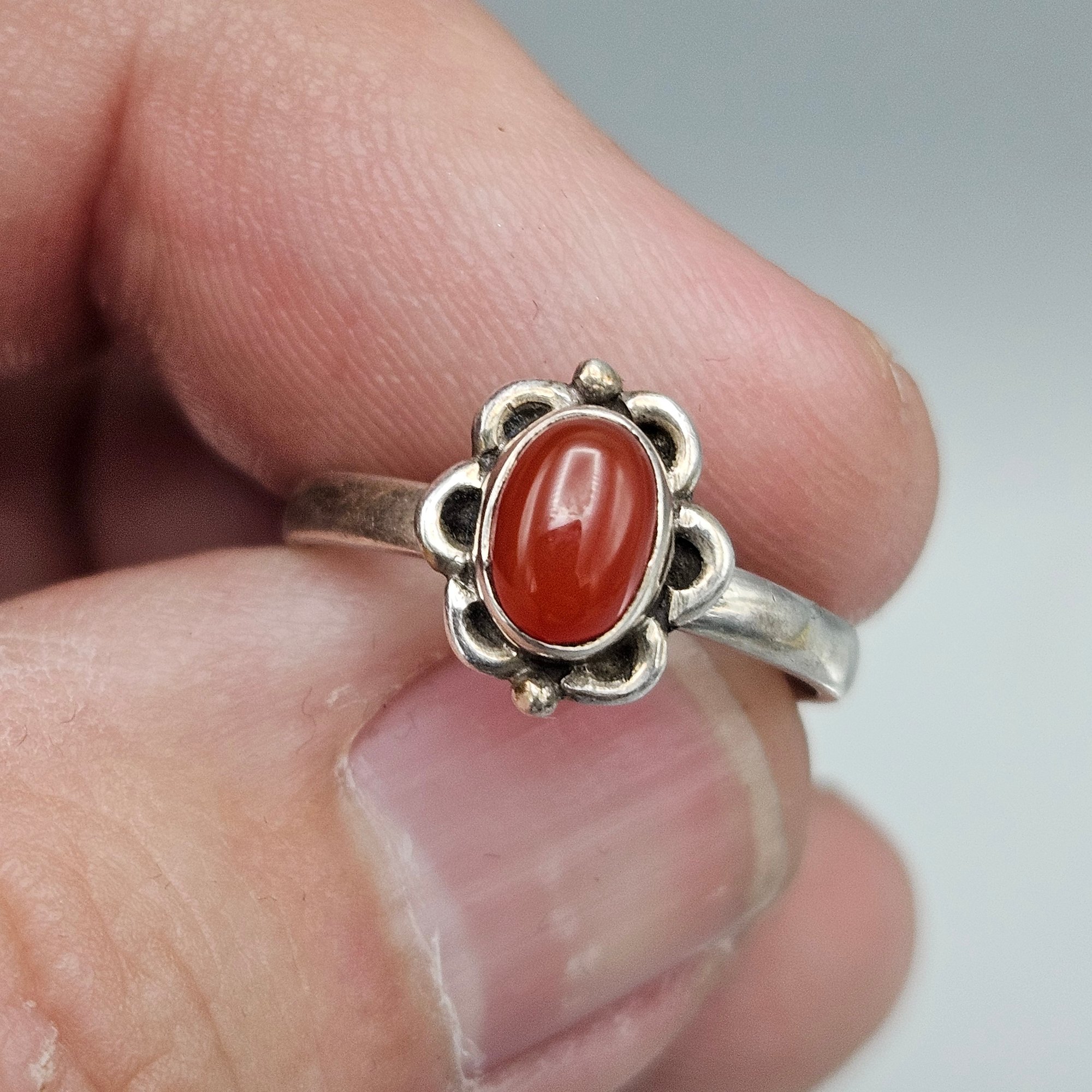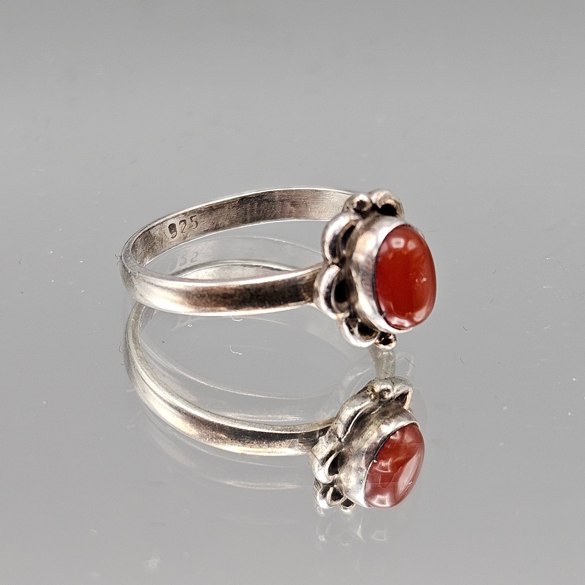 This elegant vintage ring features a vibrant, oval-cut carnelian cabochon set within a charming, scalloped sterling silver floral bezel. The polished band is stamped with a "925" hallmark and is currently a size 6.5.