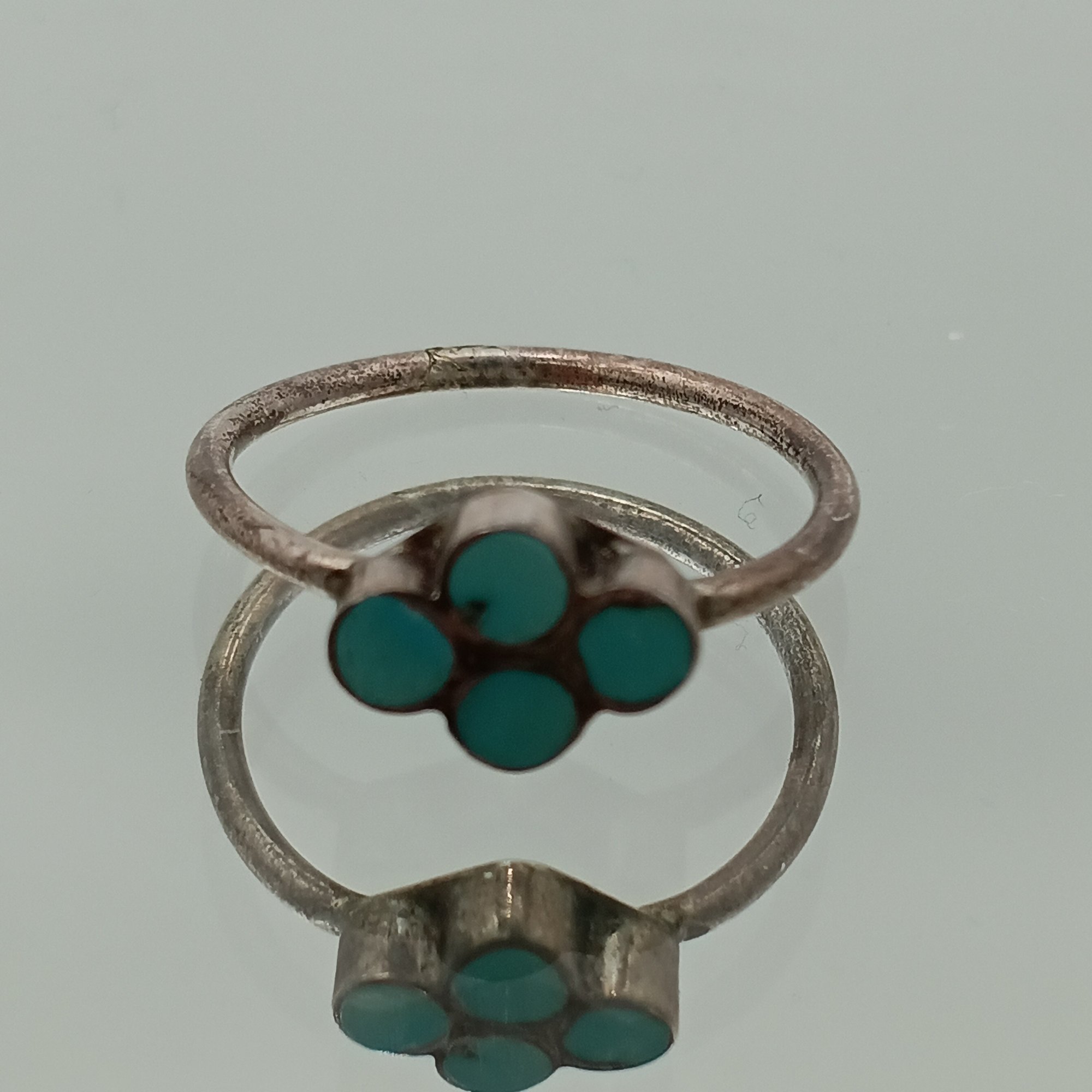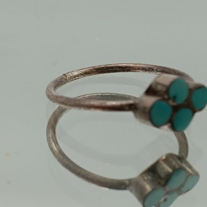 This delicate sterling silver ring features a four-leaf clover motif set with turquoise "petit point" stones