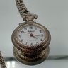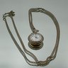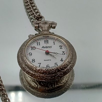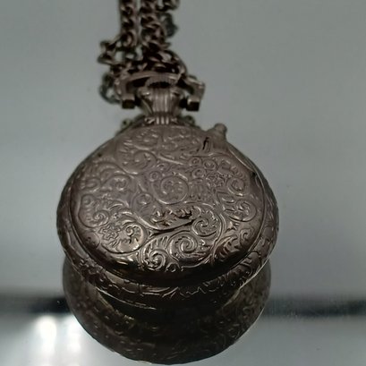 This elegant silver-tone pendant watch features a decorative floral-engraved case and a clean white dial with a Japanese quartz movement, suspended from a matching long-link chain.