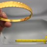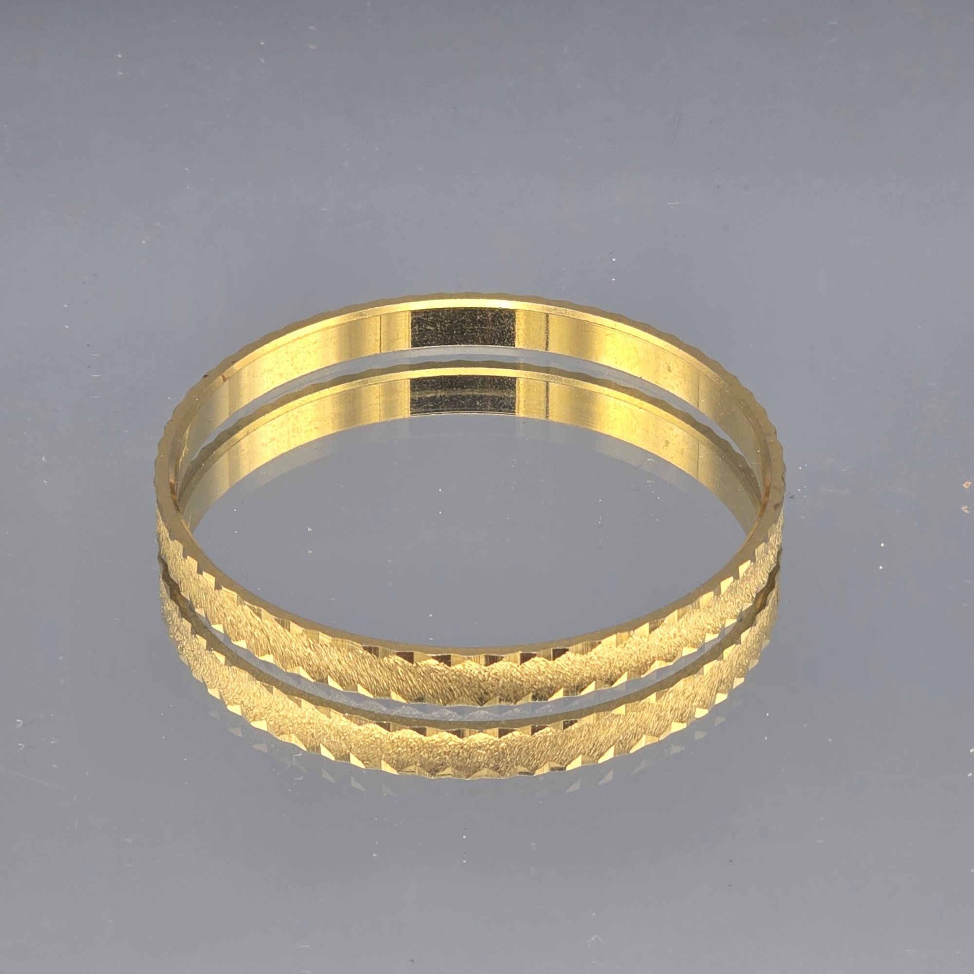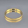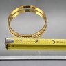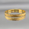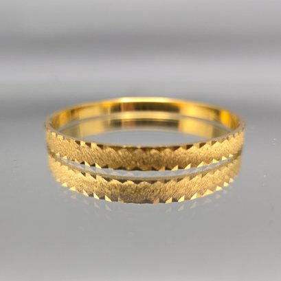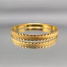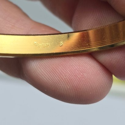This elegant vintage Trifari bangle features a sophisticated gold-tone finish with a distinctive textured, diamond-cut outer surface. Measuring approximately 2.5 inches in diameter, the interior of the band is clearly hallmarked with the "TRIFARI" signature and an "S" mark.