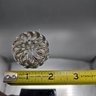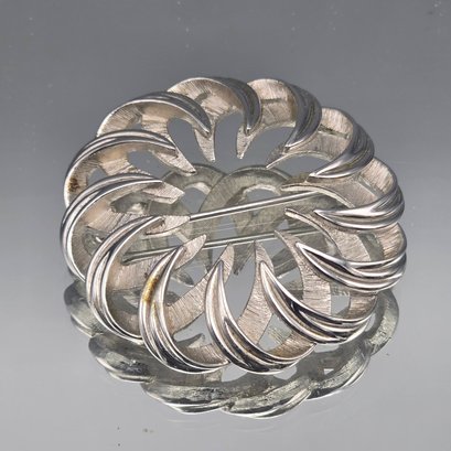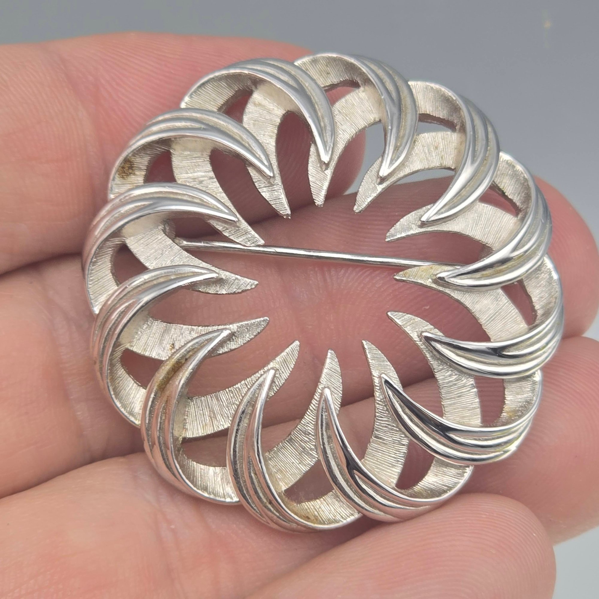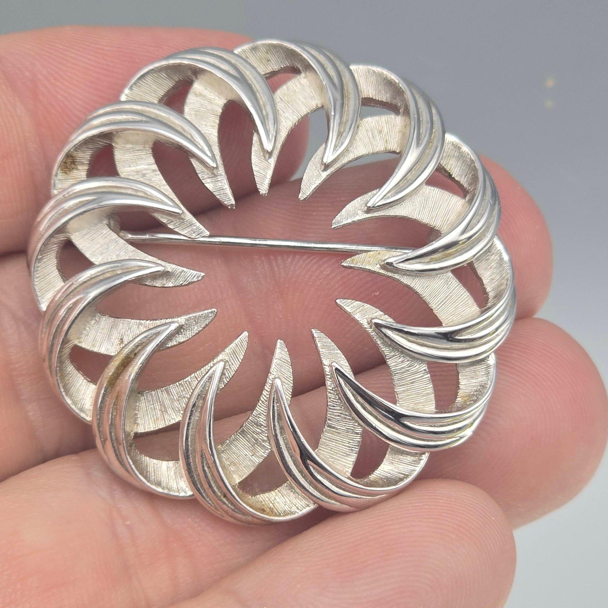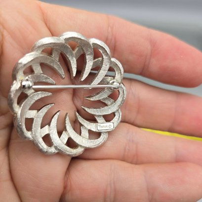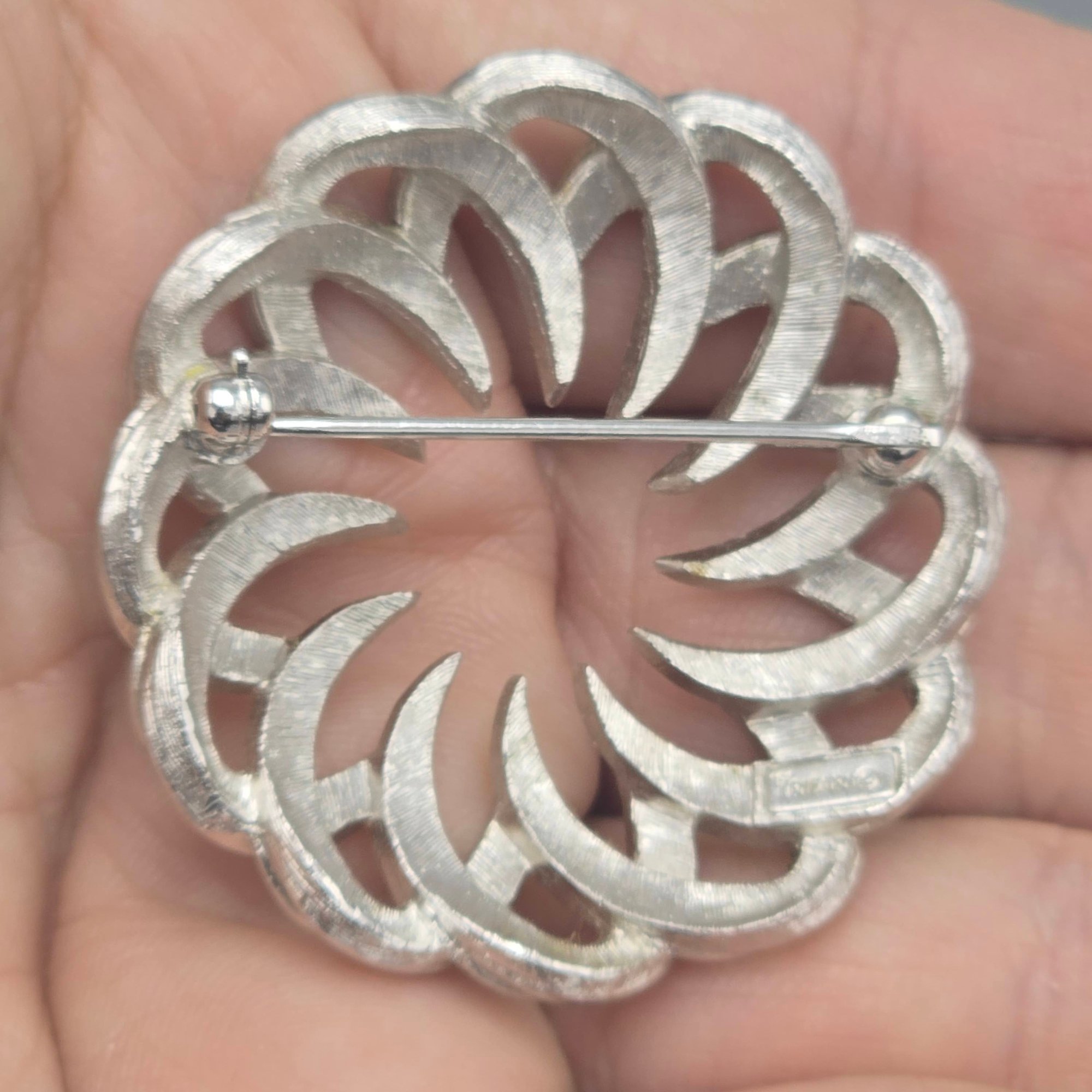 Elegant vintage Trifari brooch featuring an openwork circular design with layered swirling curves in a silver-tone finish. Measuring approximately 2 inches, this classic mid-century piece adds refined texture and movement to any jacket, dress, or scarf.