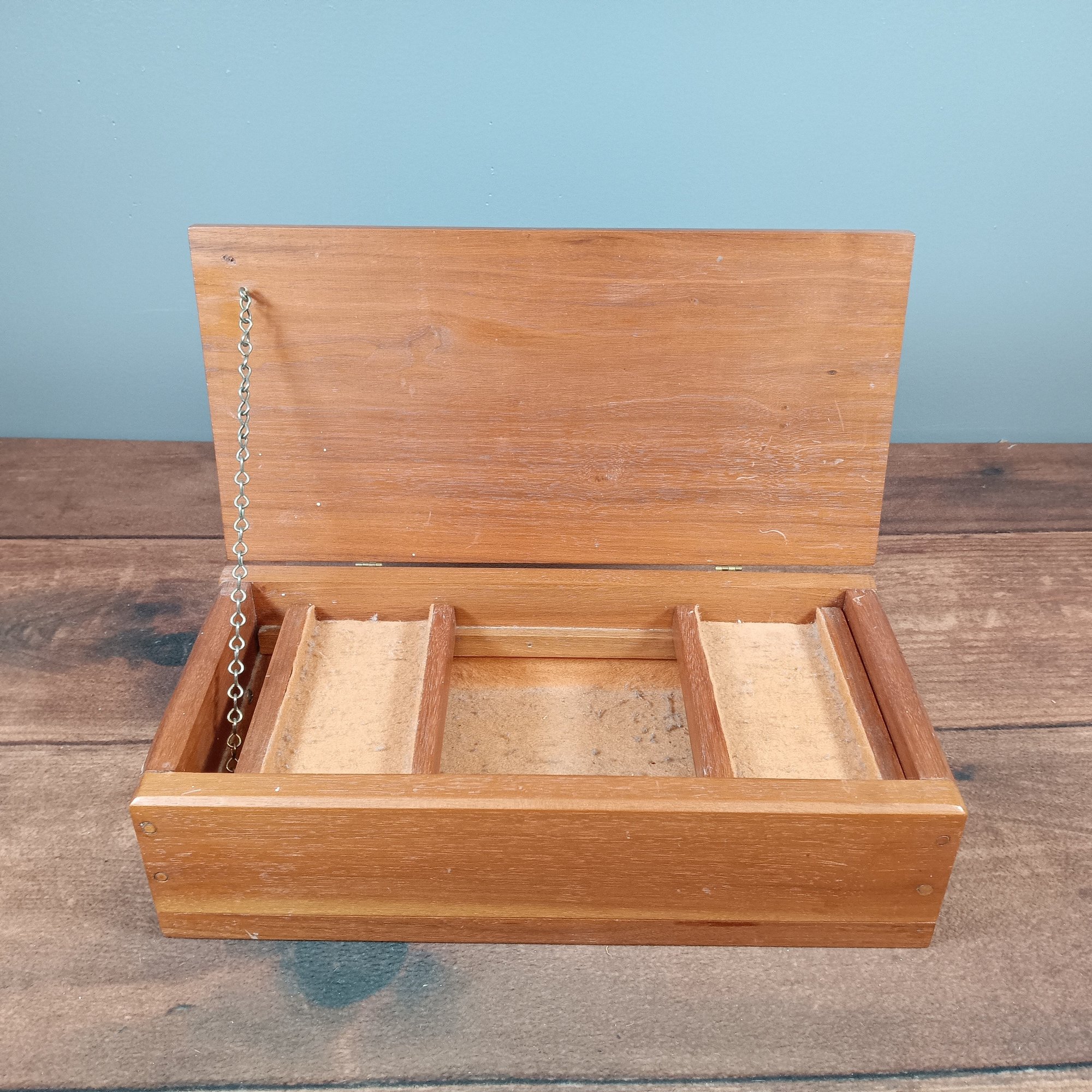 Wooden Jewelry/ trinket box with chain multi-layered 15" x 8"