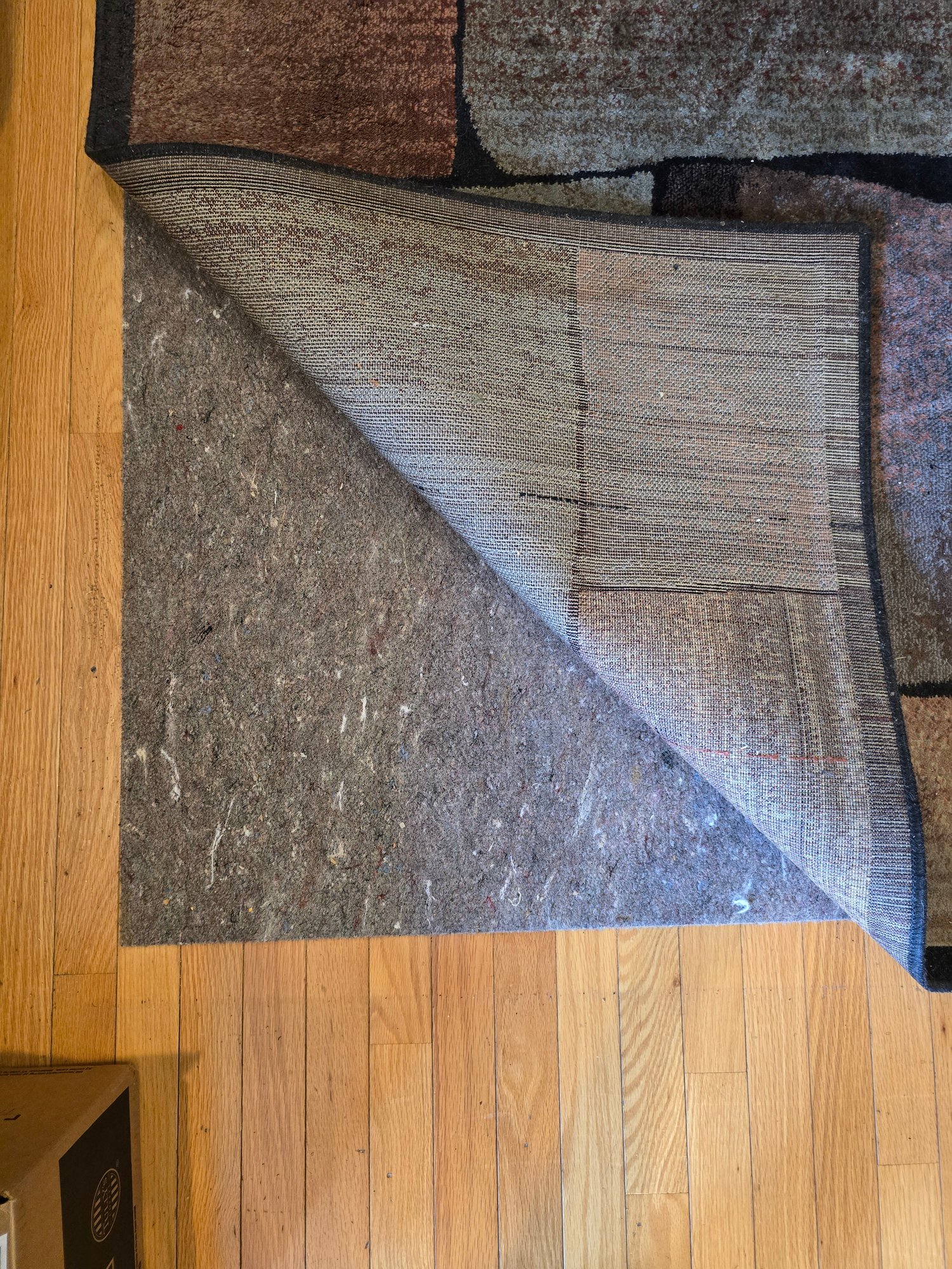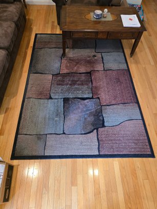 Notes: Machine-made area rug in a bold patchwork block design. Earth tones — gray, brown, mauve, and dusty blue — with a navy border. Rug pad included.