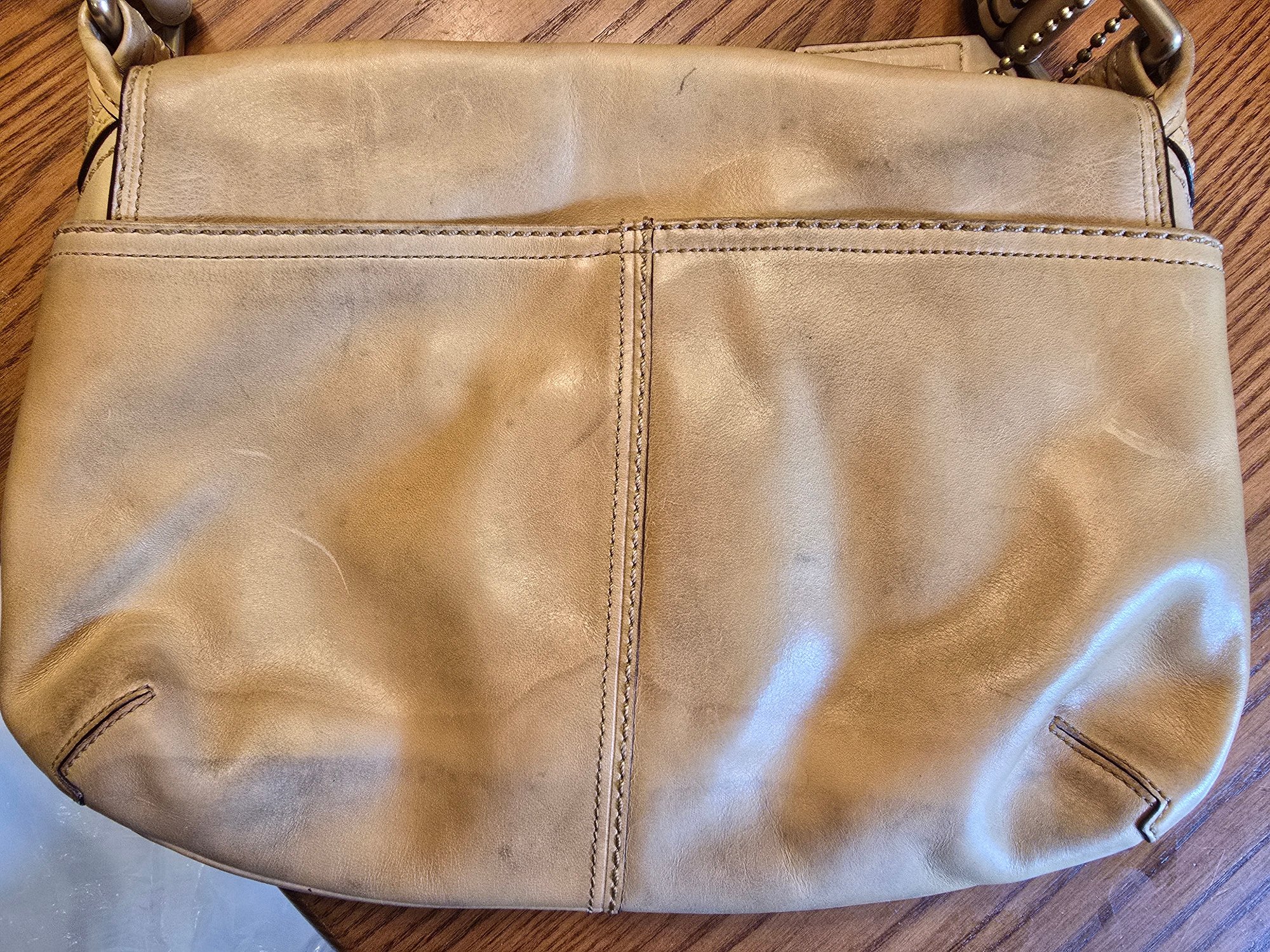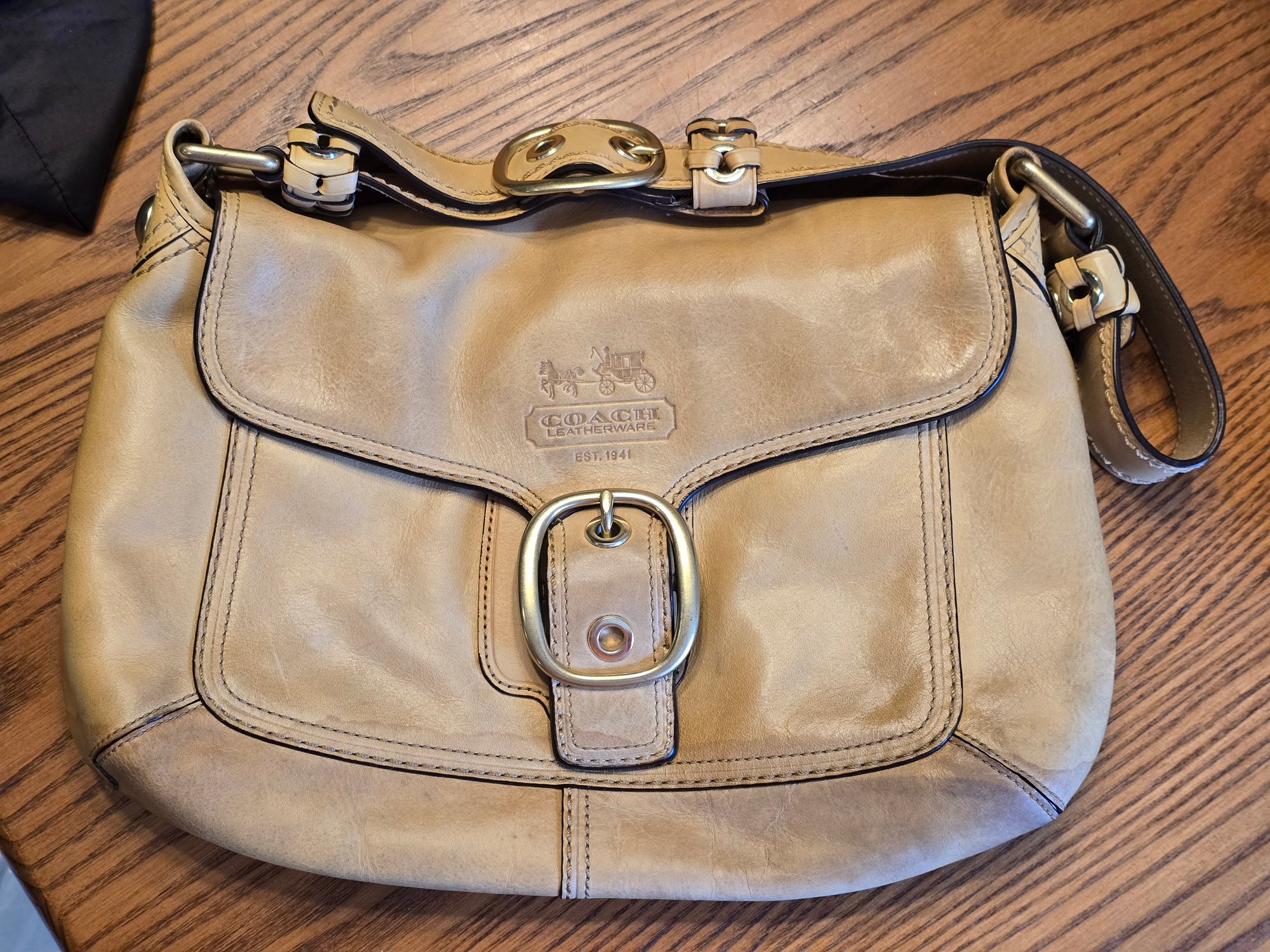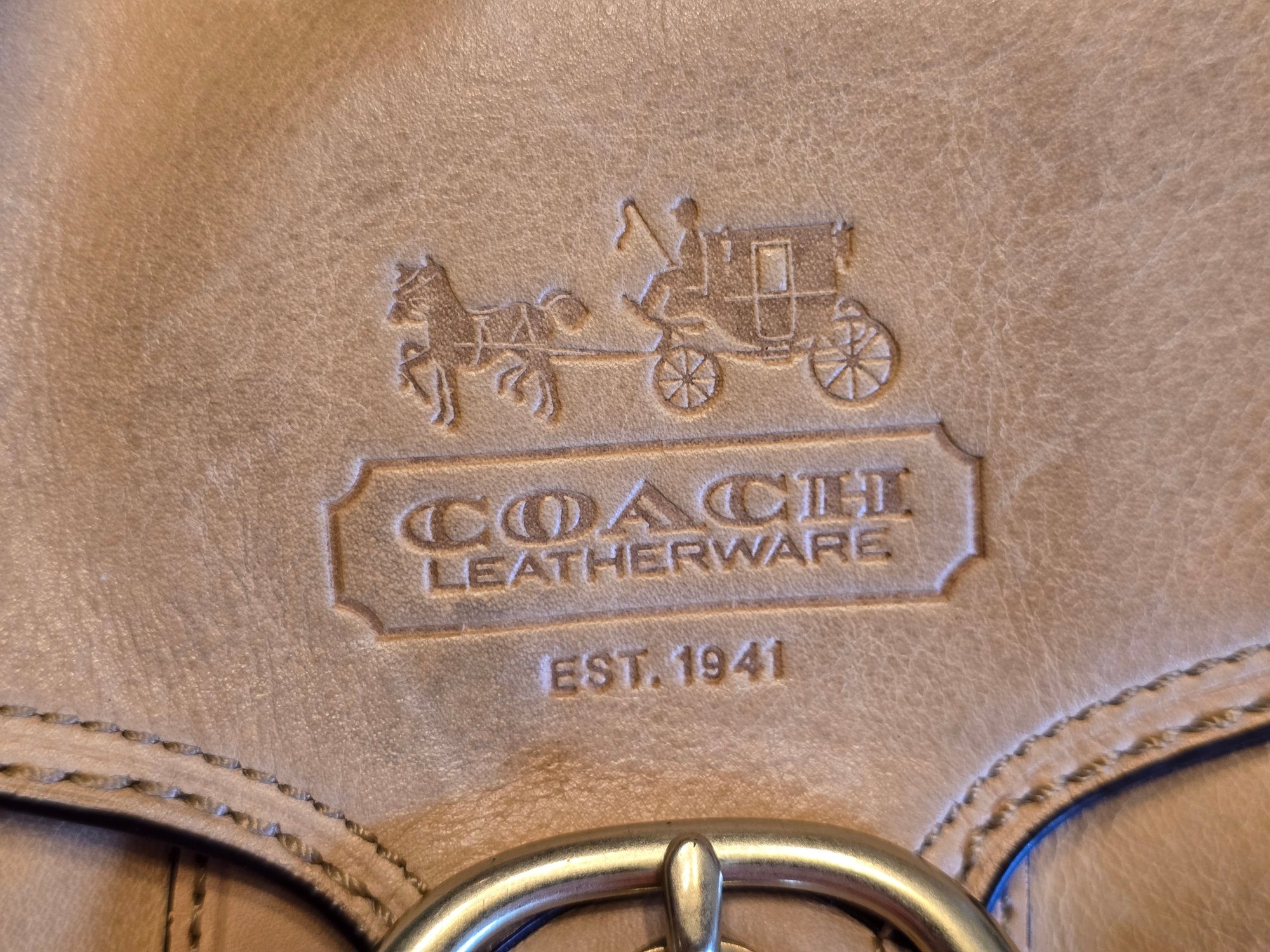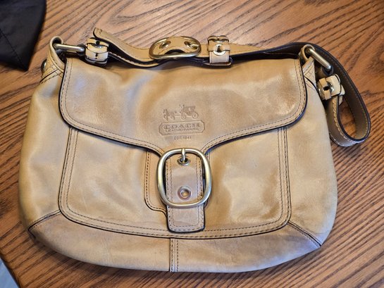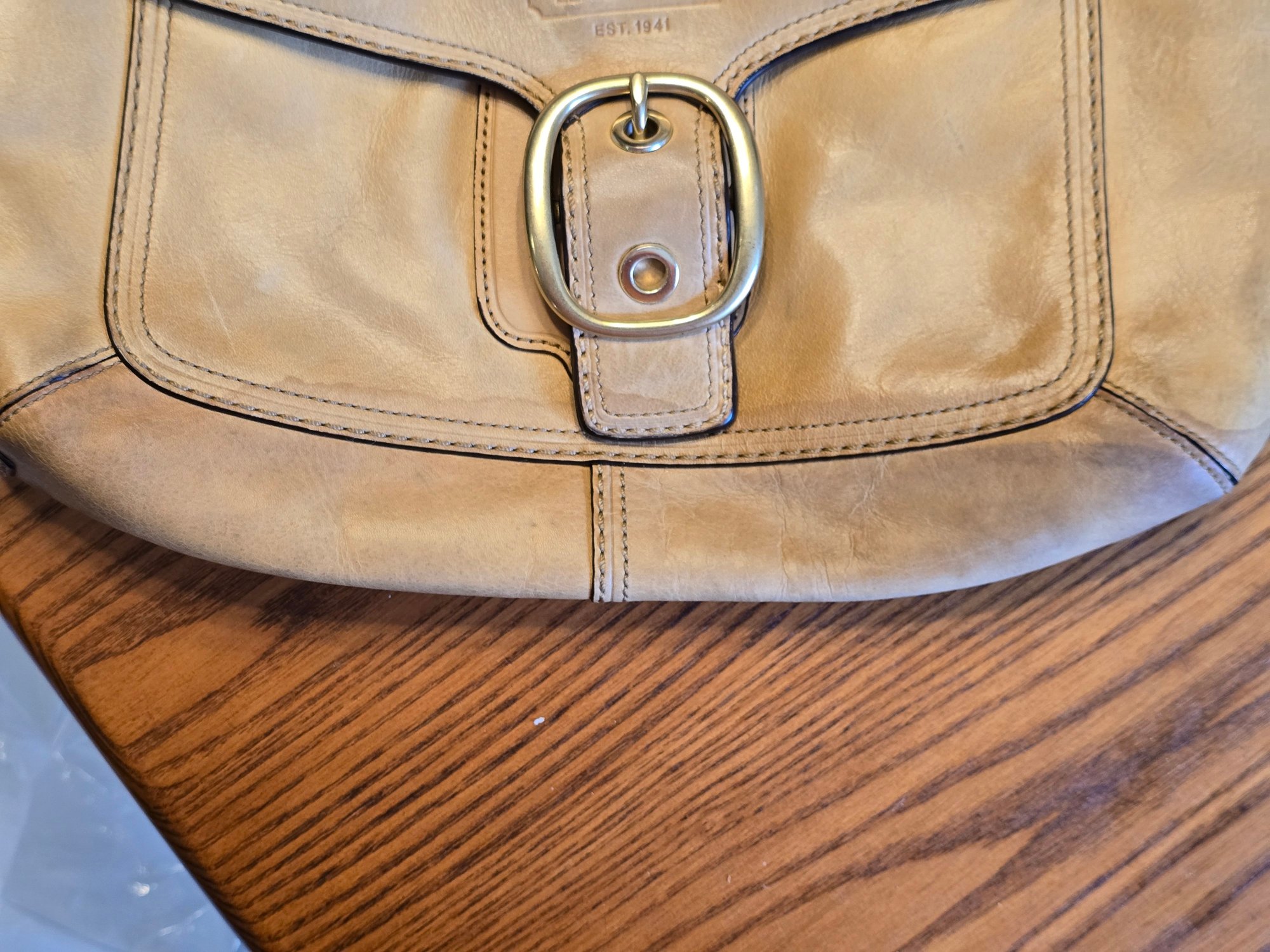 Notes: Coach Leatherware "Est. 1941" debossed logo flap bag in tan/camel leather with gold-tone hardware. Buckle front closure, braided strap detail, satin interior lining. Classic early 2000s Coach style.