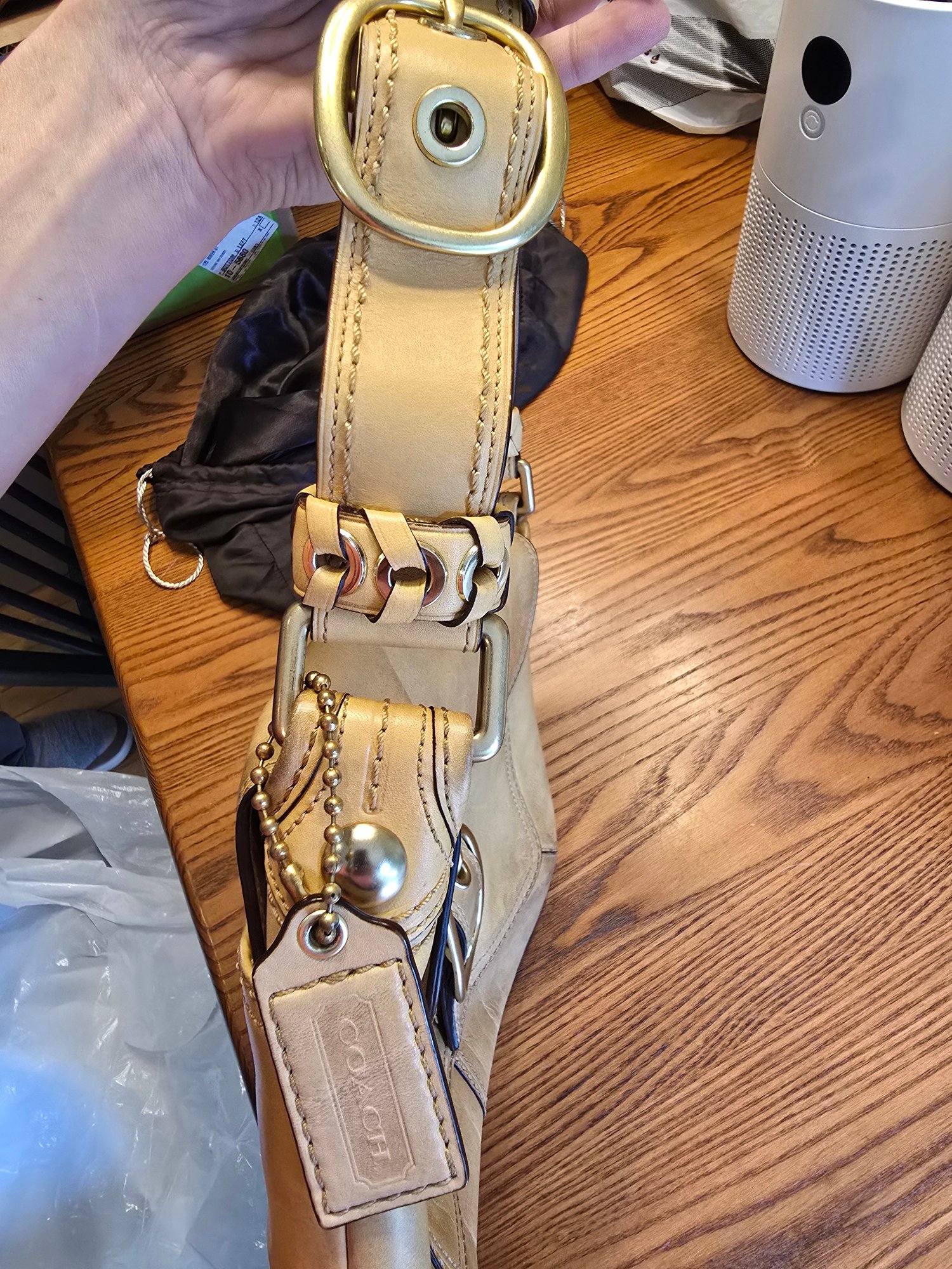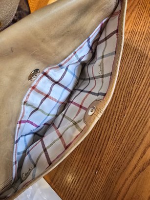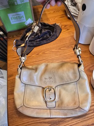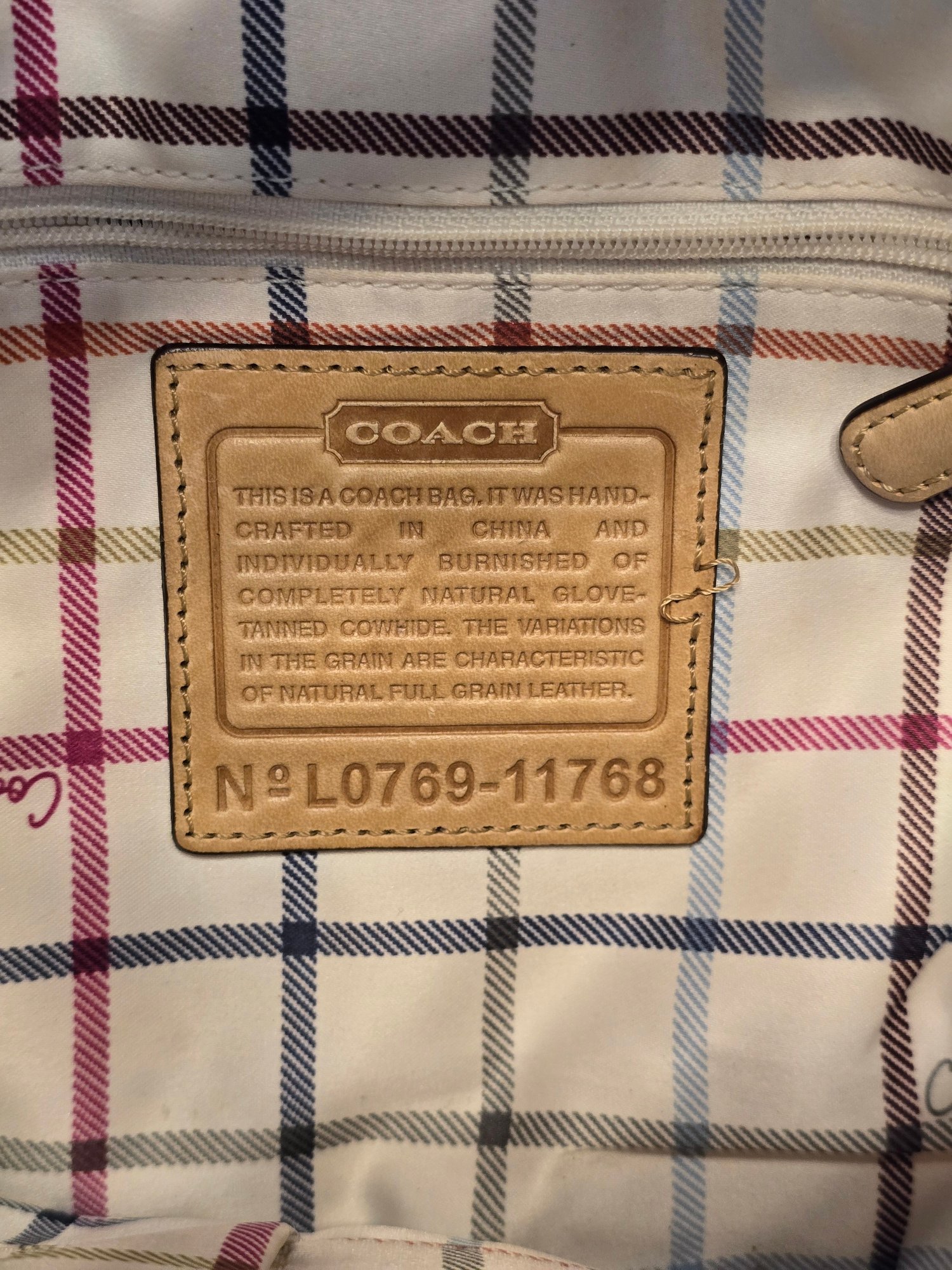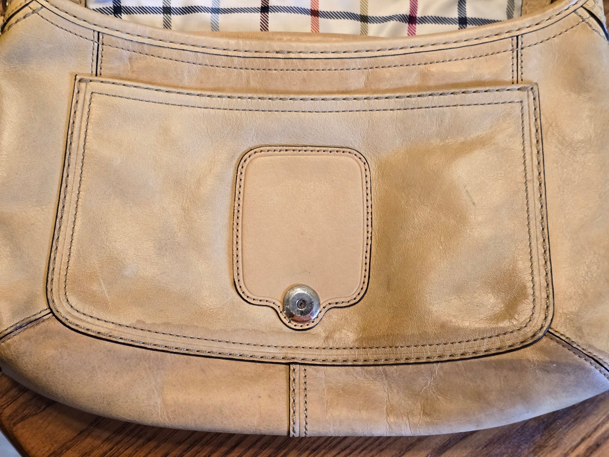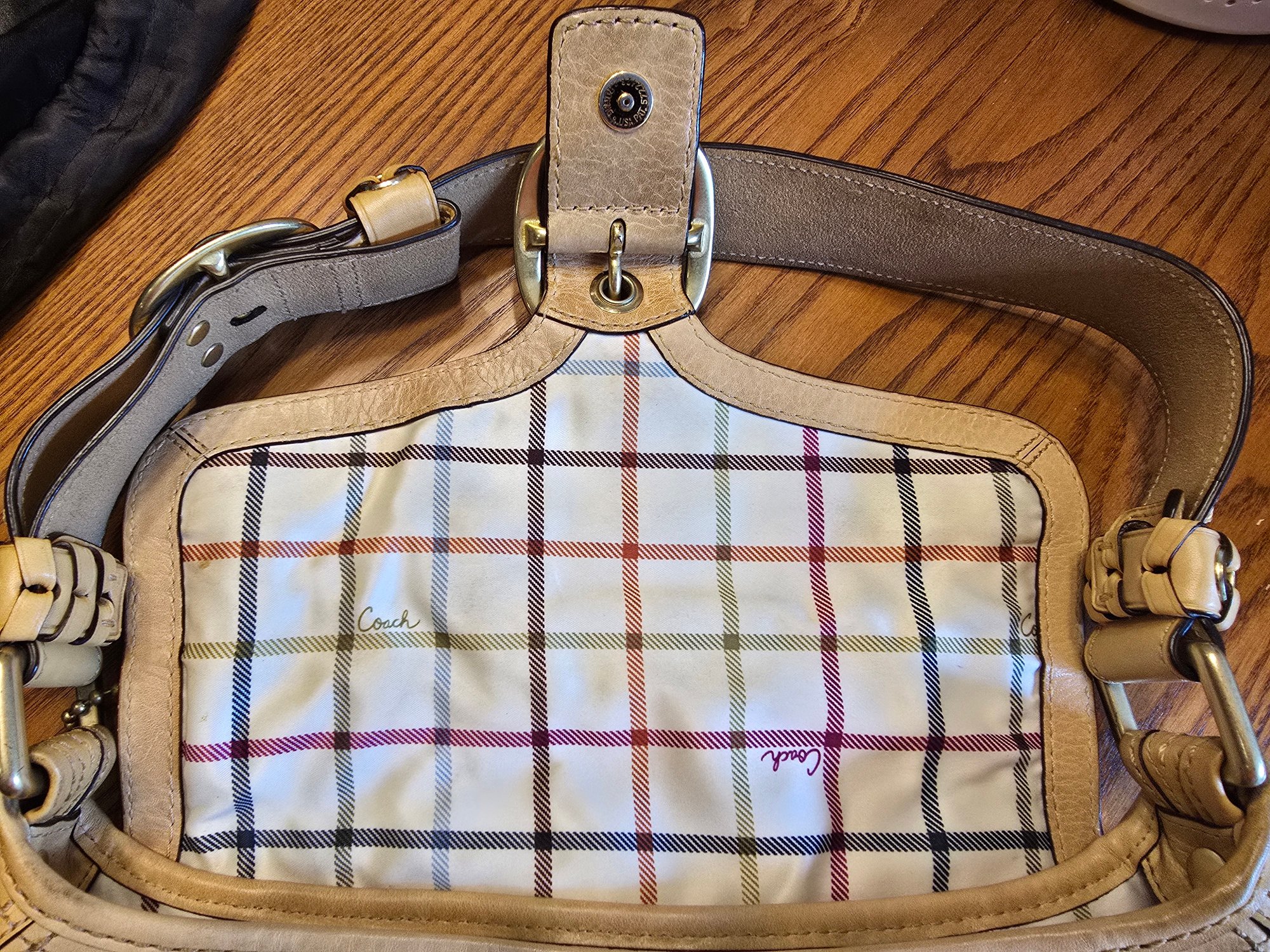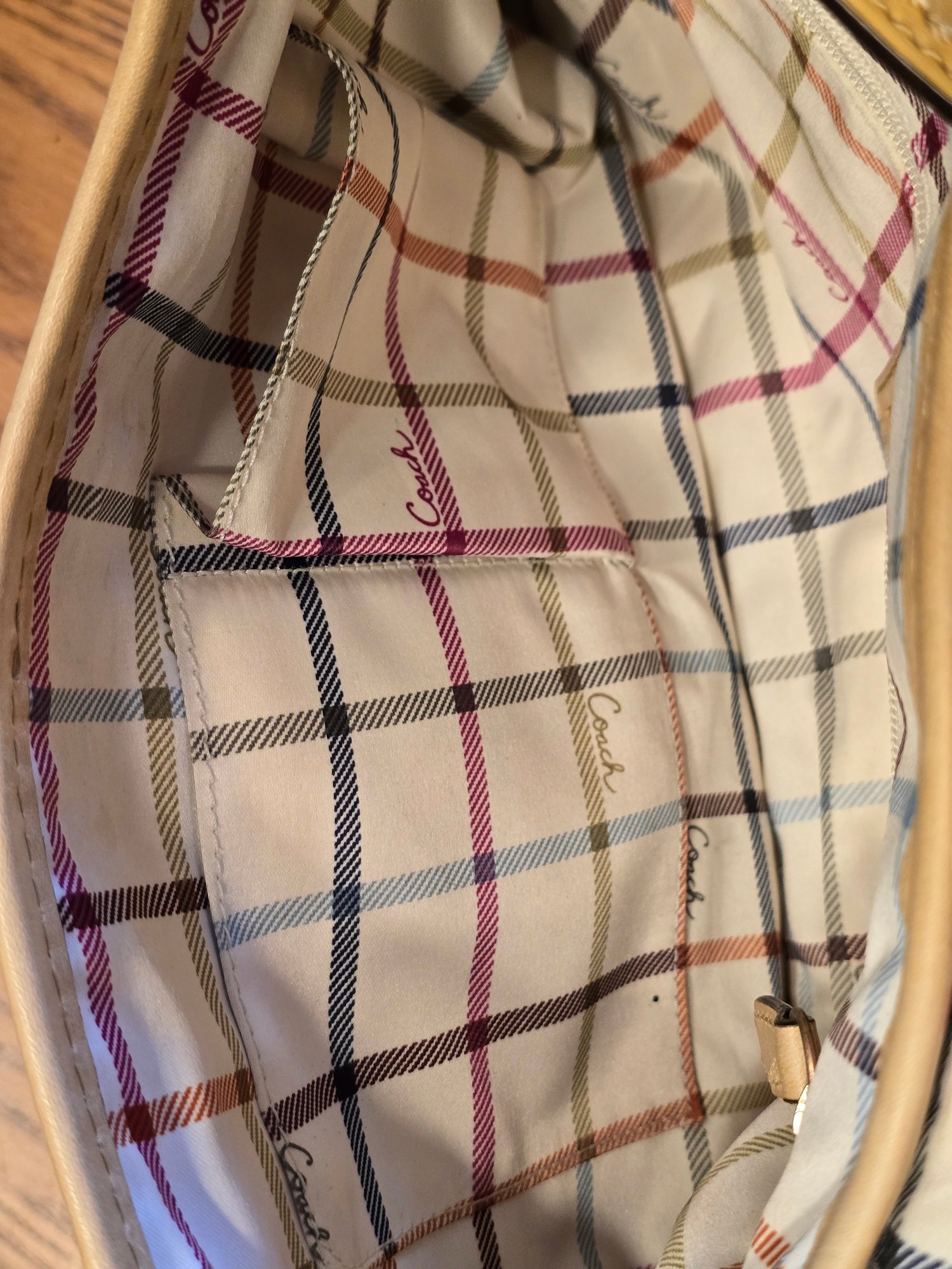 Notes: Coach Leatherware "Est. 1941" debossed logo flap bag in tan/camel leather with gold-tone hardware. Buckle front closure, braided strap detail, satin interior lining. Classic early 2000s Coach style.