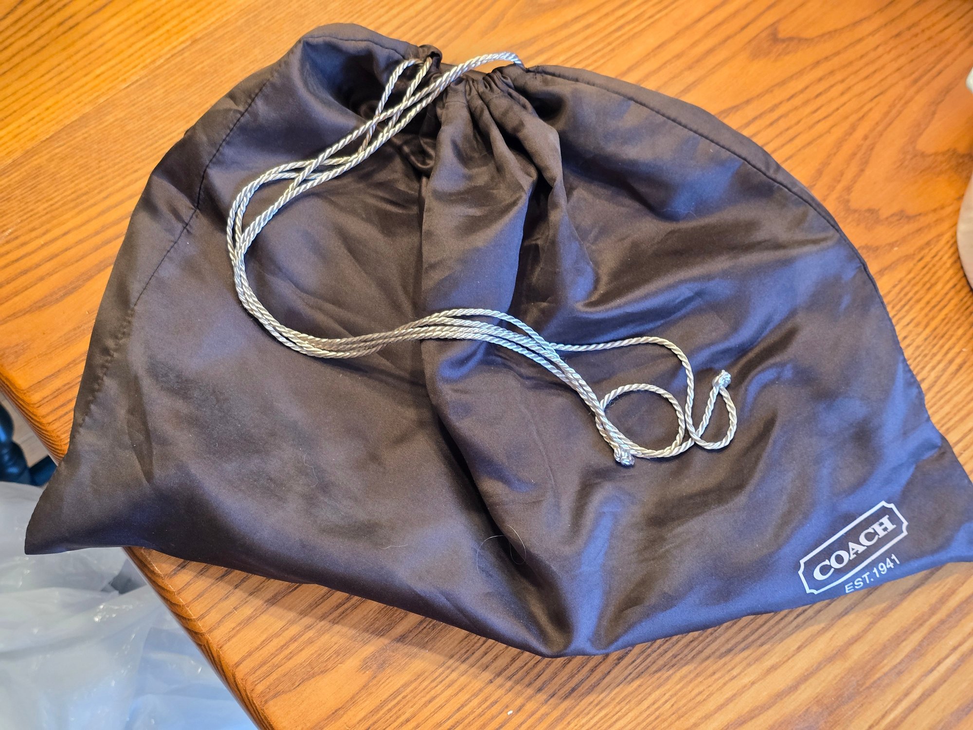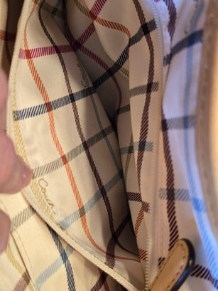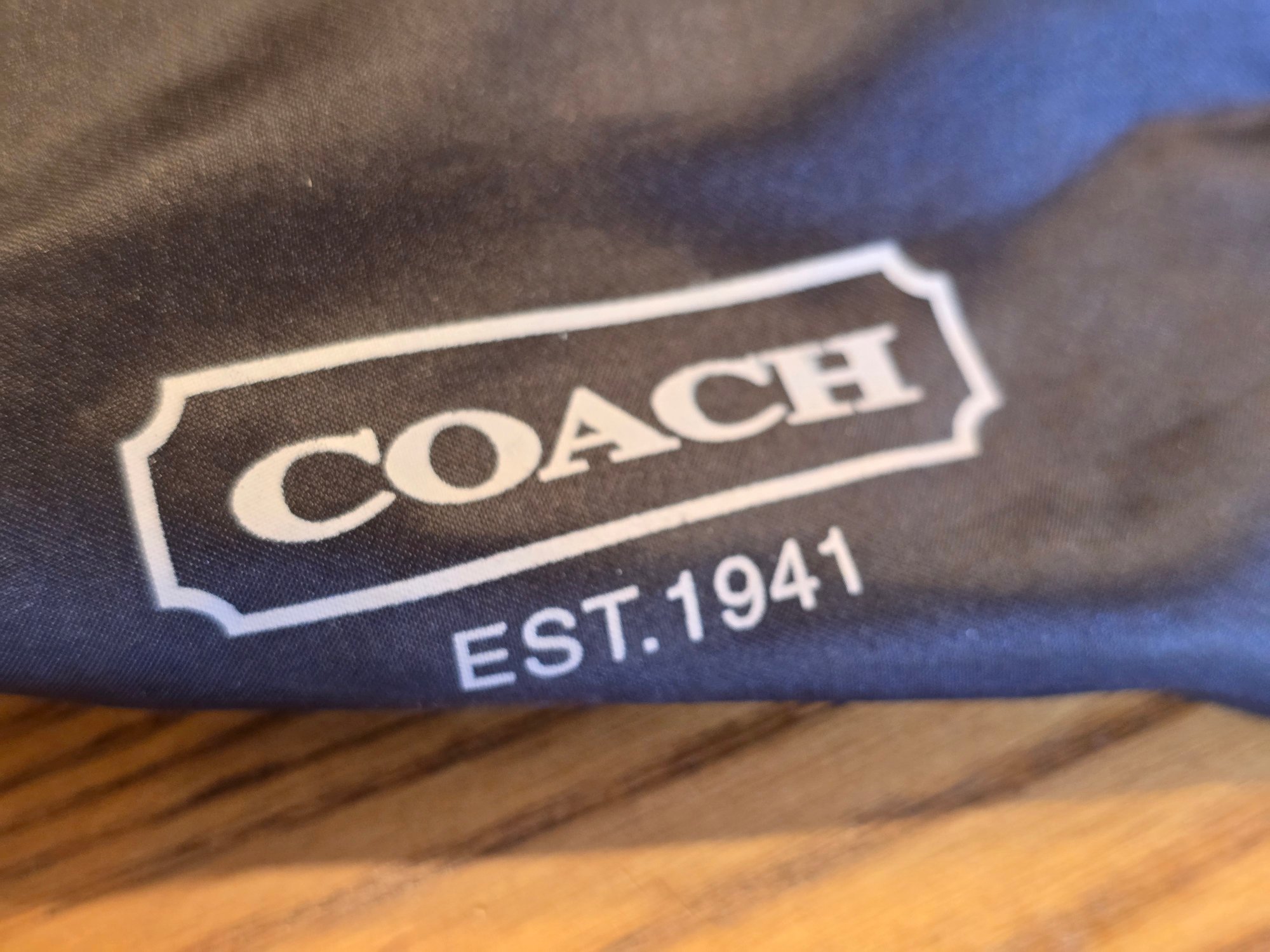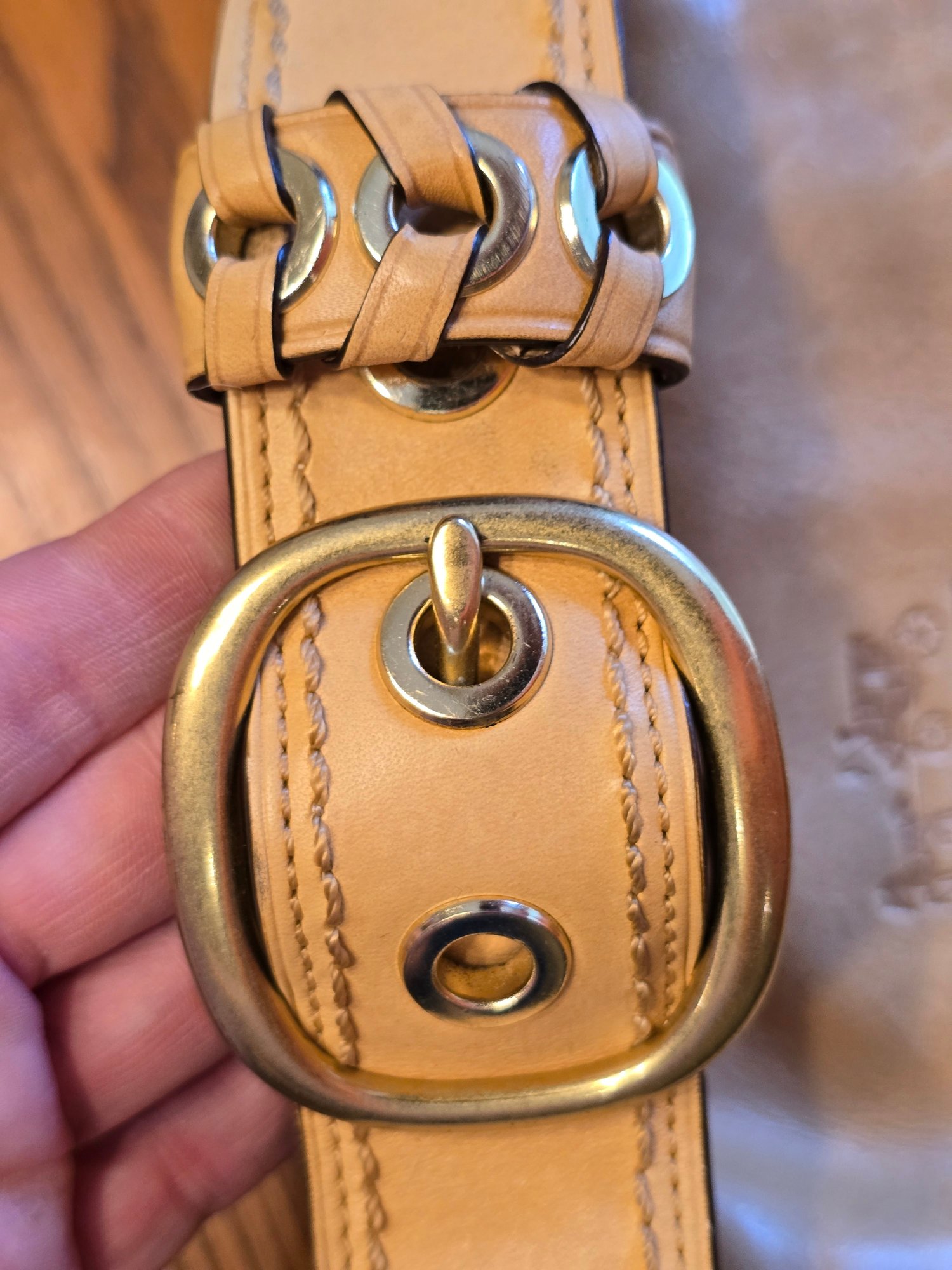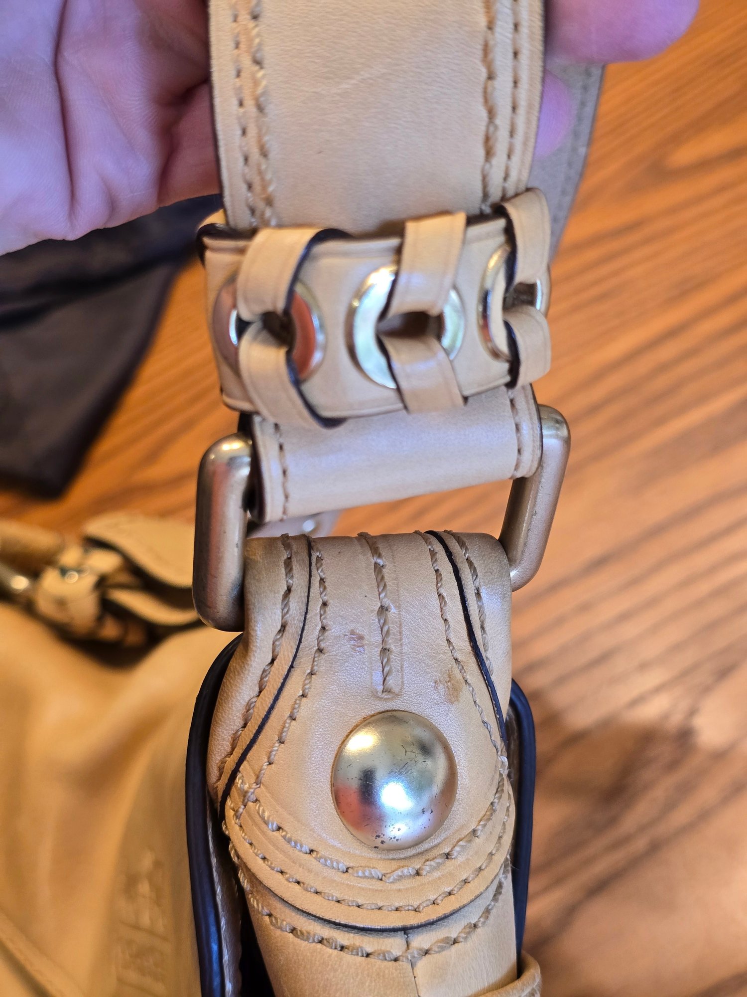 Notes: Coach Leatherware "Est. 1941" debossed logo flap bag in tan/camel leather with gold-tone hardware. Buckle front closure, braided strap detail, satin interior lining. Classic early 2000s Coach style.