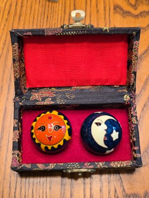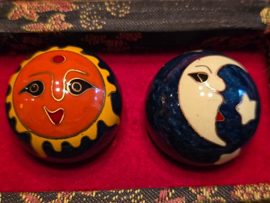 Chinese Baoding Meditation Balls Sun Moon Enamel Chiming Pair In Brocade Box