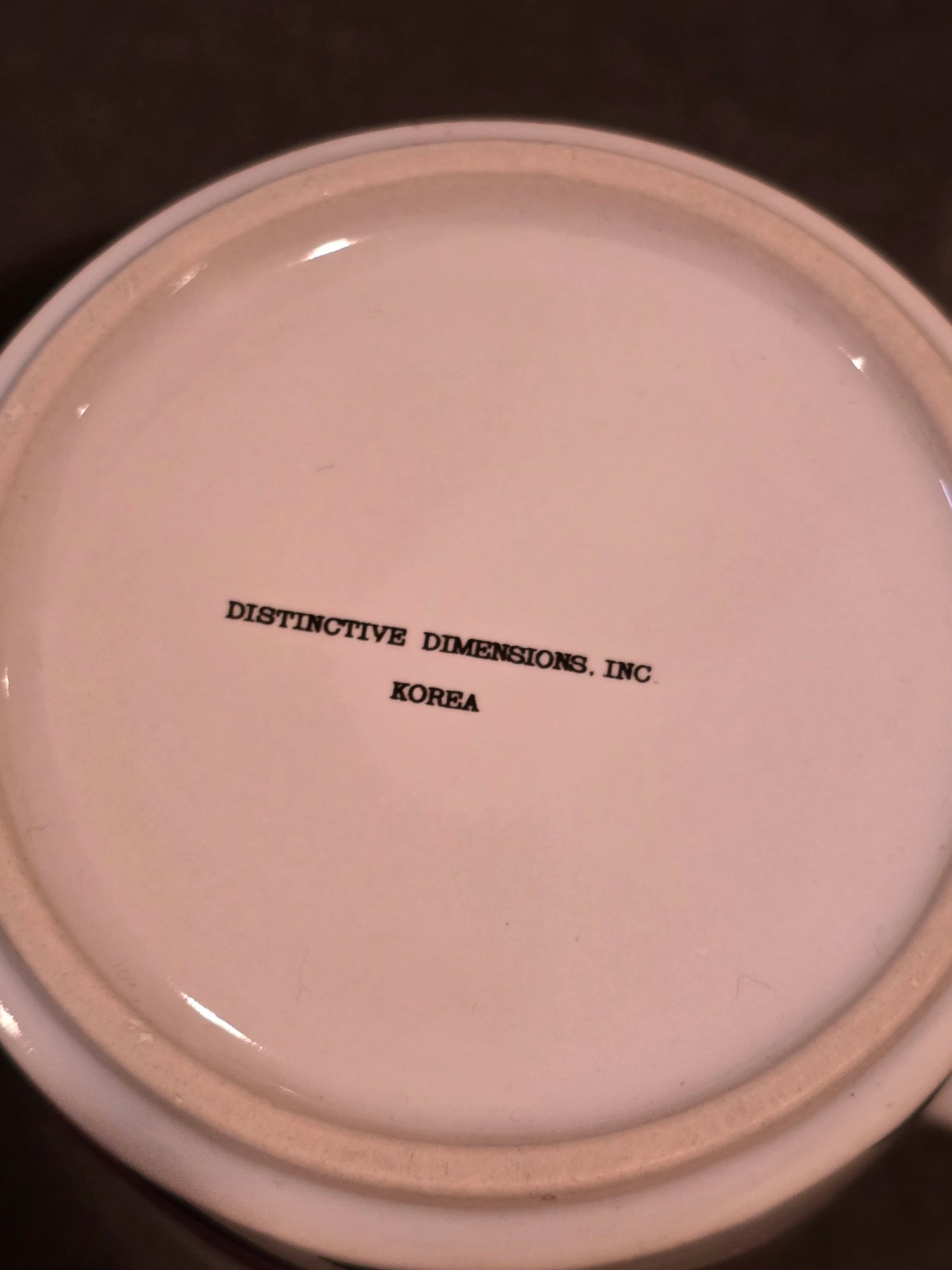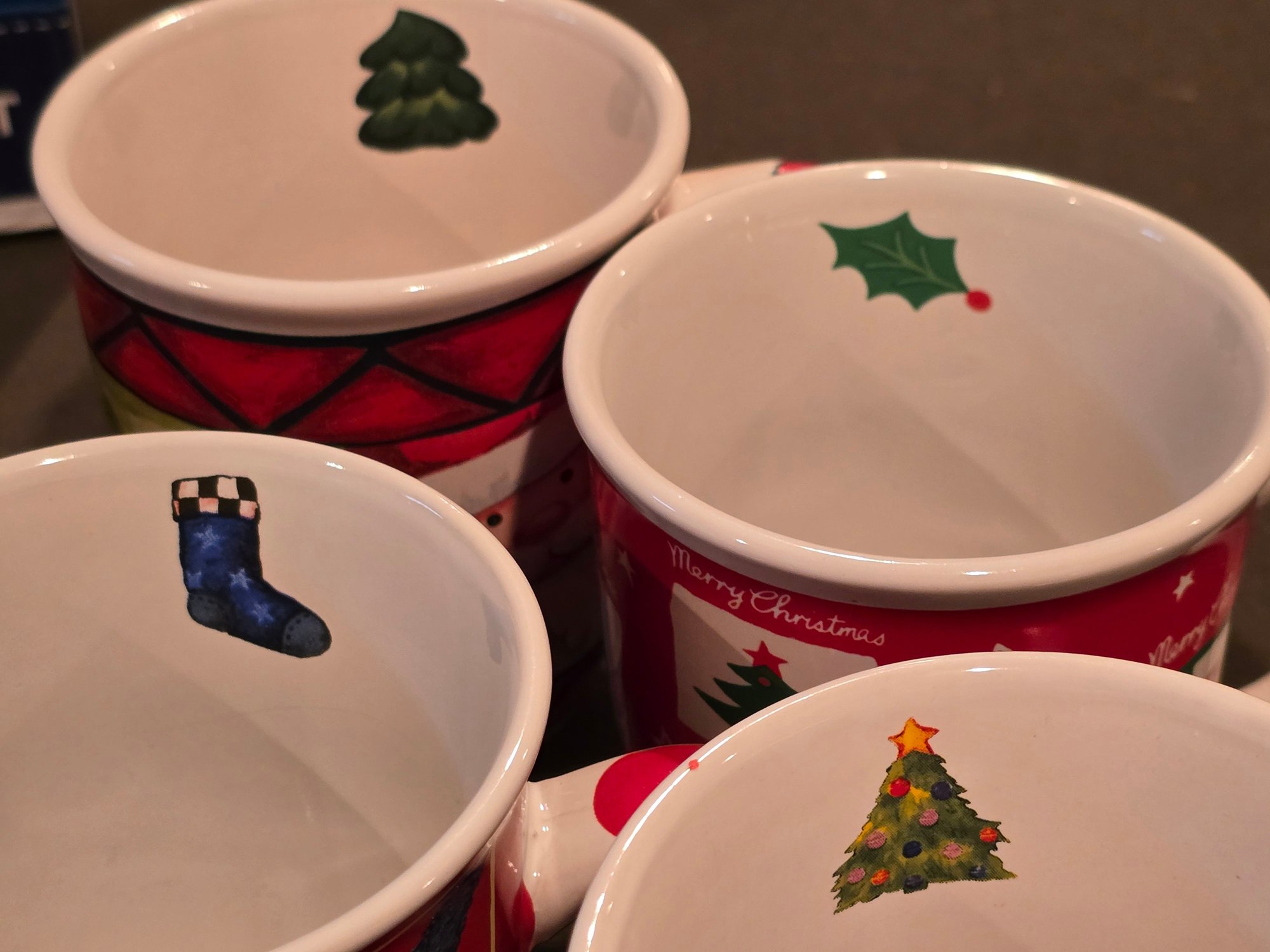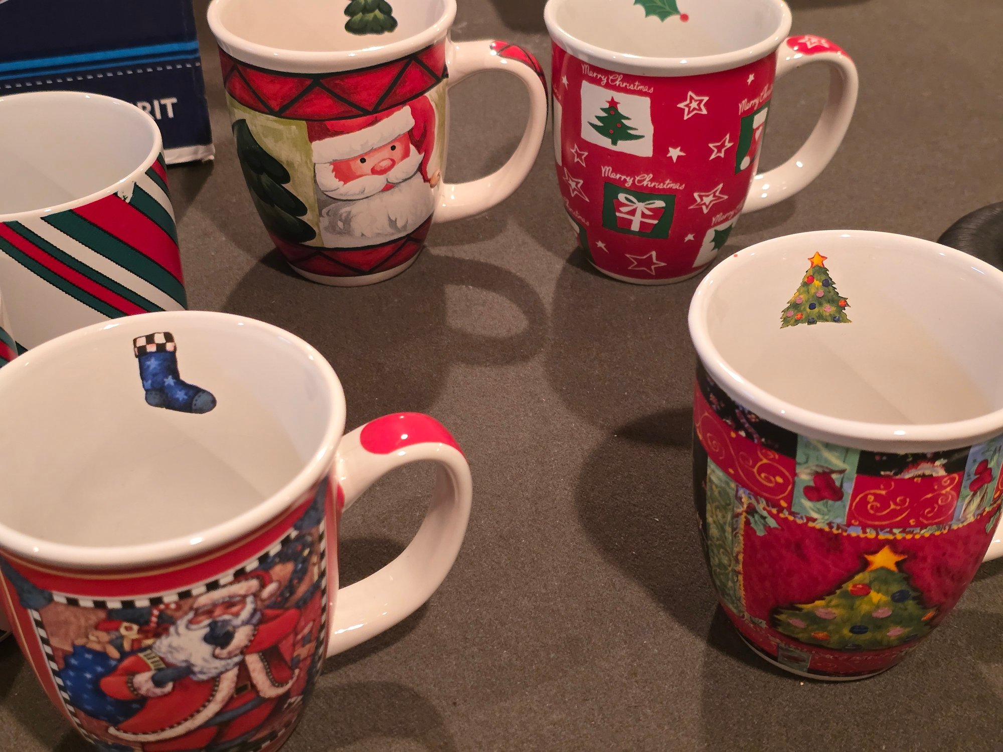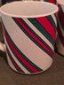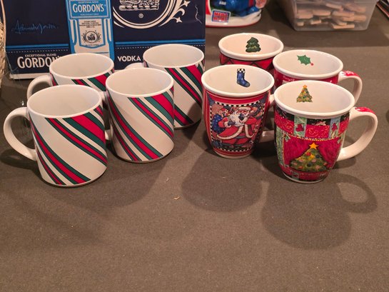 Notes: Eight-mug Christmas lot — four matching candy stripe mugs (Distinctive Dimensions, Korea), and four Christmas/holiday-style mugs.