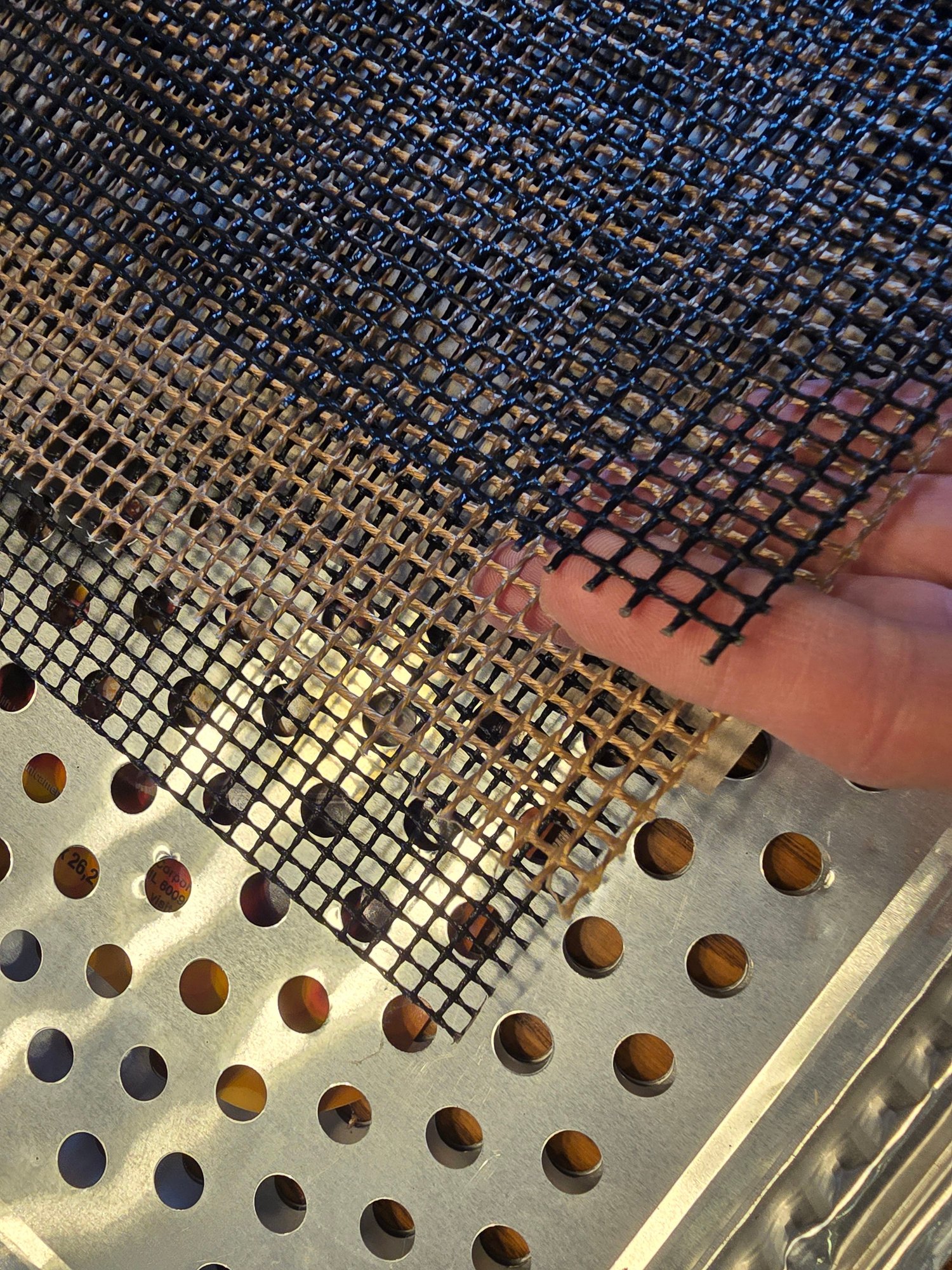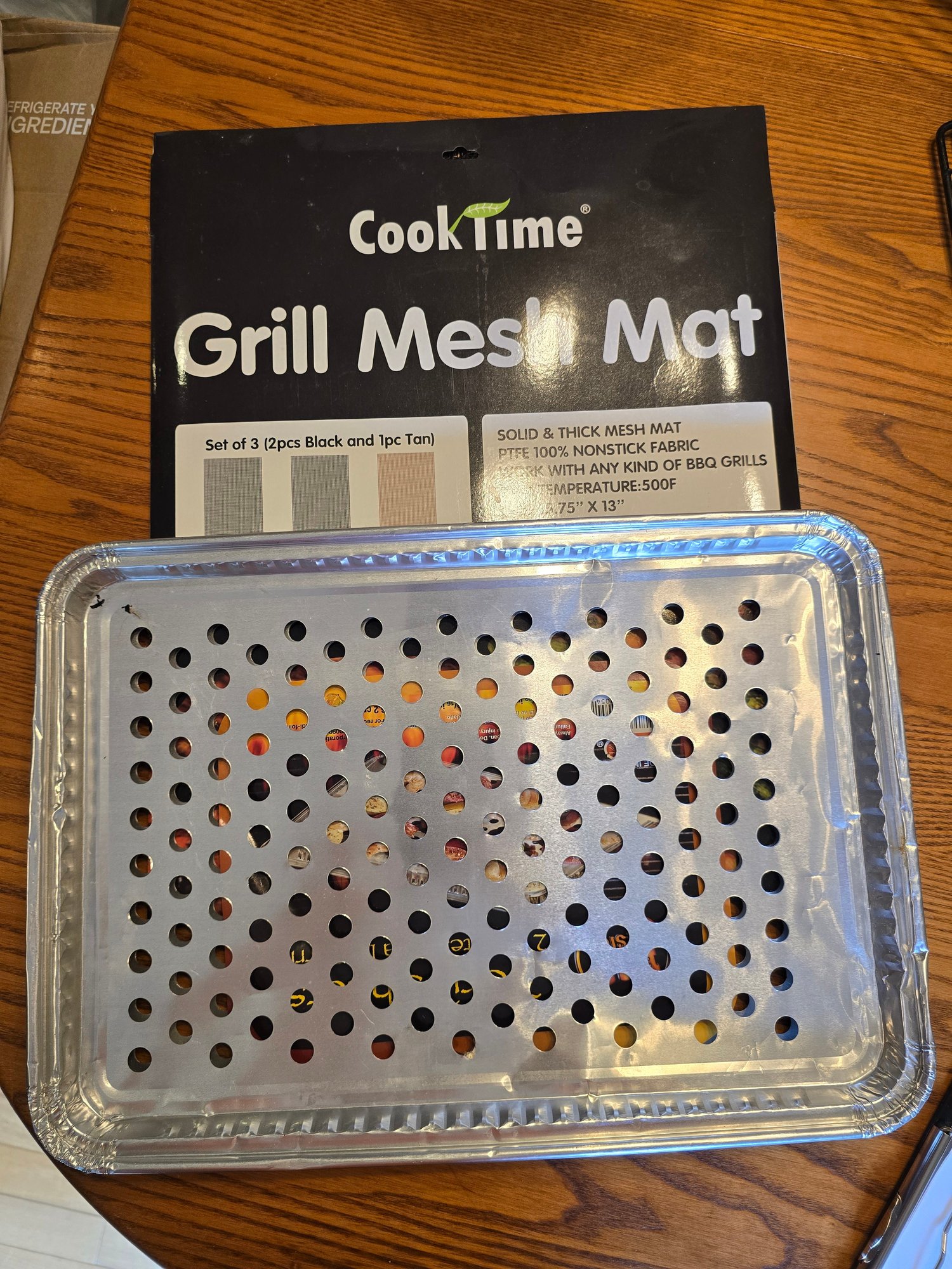 Lot includes CookTime Grill Mesh Mat set of 3 (2 black, 1 tan) — PTFE nonstick, up to 500°F, fits any BBQ grill, 4.75"x13". Also includes 3 disposable perforated aluminum grill pans. New/unused.