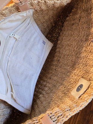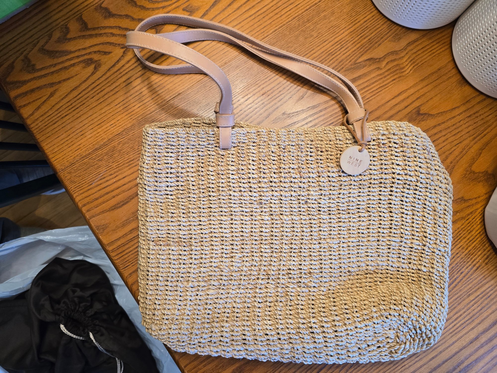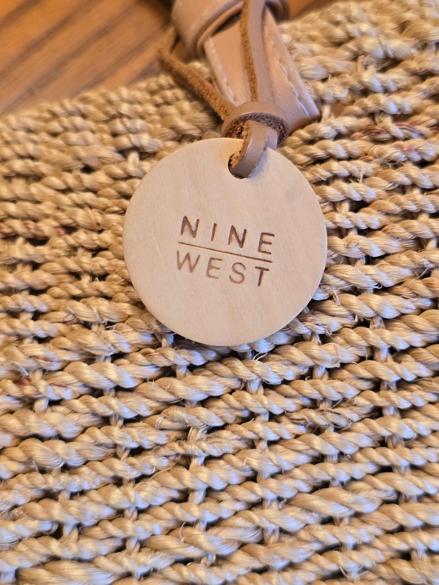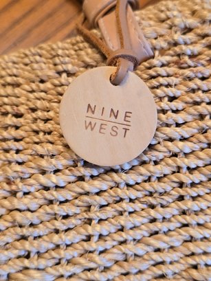 Notes: Nine West woven straw tote with tan faux leather shoulder straps and magnetic snap closure. Natural/cream interior lining with interior zip pocket. Great summer bag — classic market tote style.