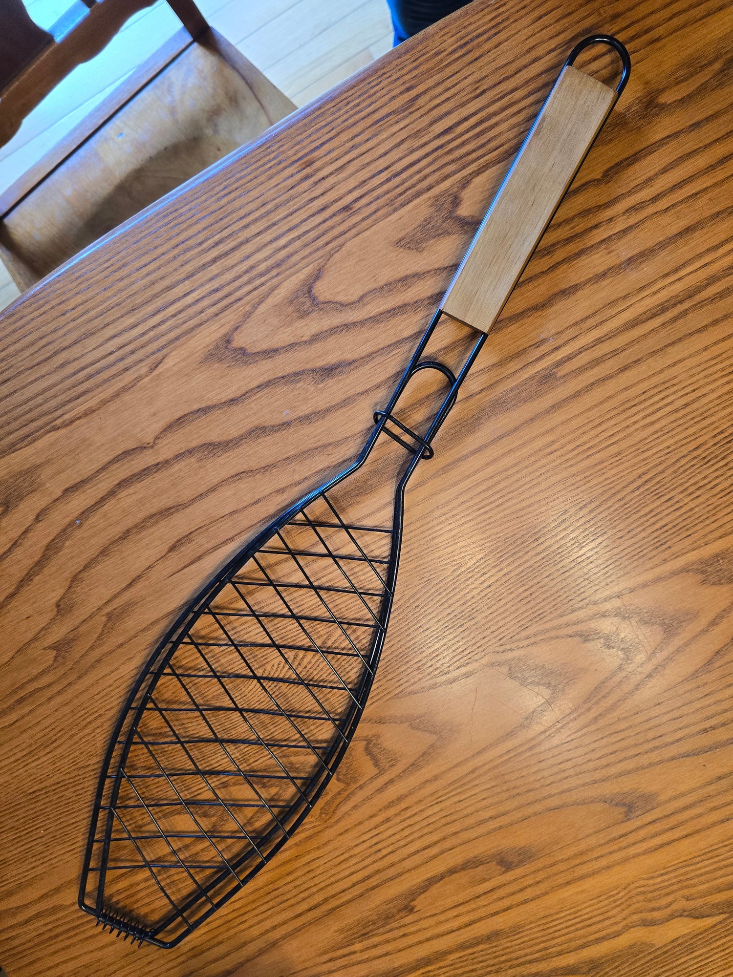 Fish-shaped wire grilling basket with wood handle and hanging loop. Black coated wire, hinged design holds fish securely on the grill. 26"
