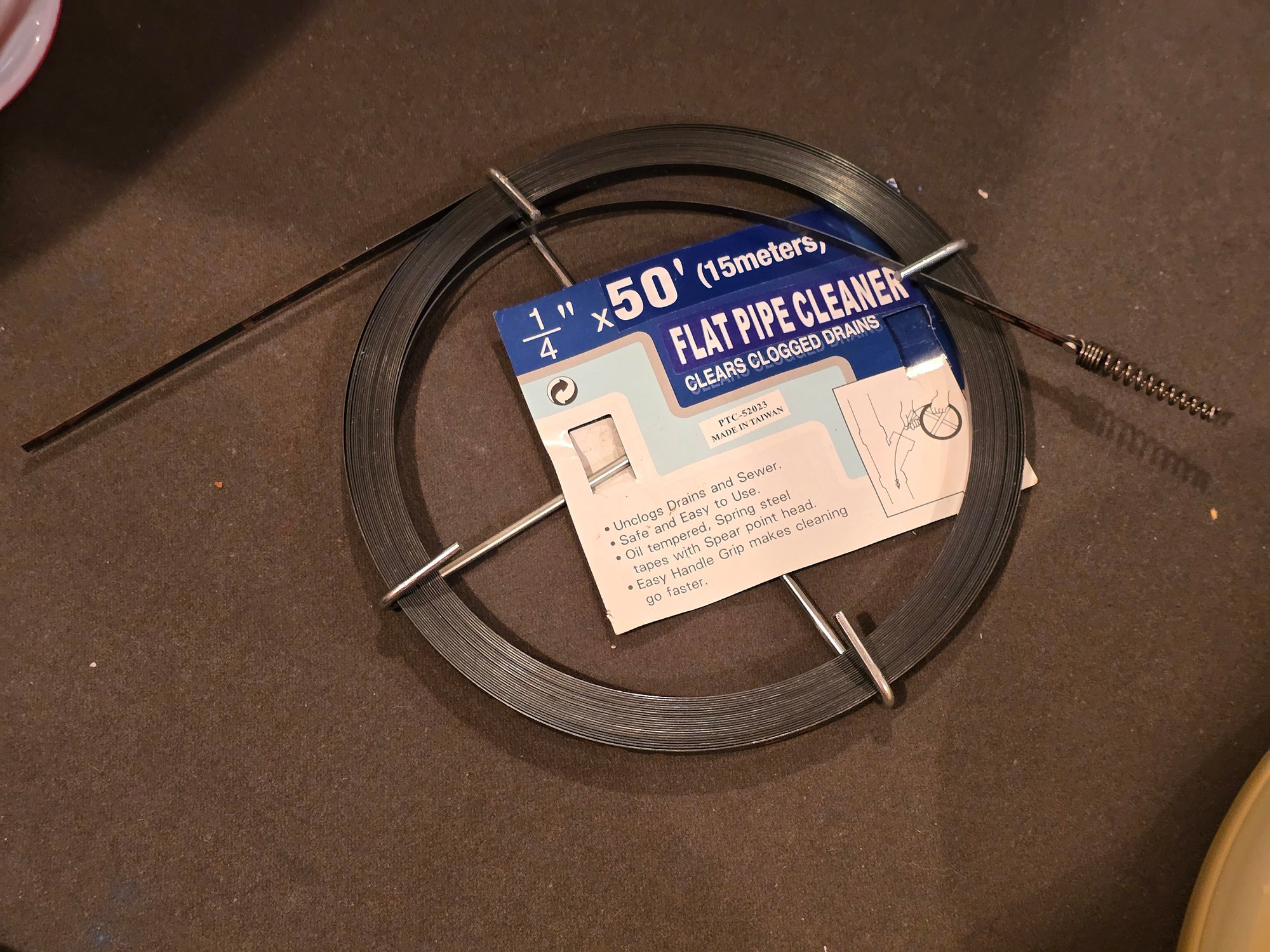 Notes: 1/4" x 50' (15 meter) flat spring steel pipe cleaner/drain snake with spear point head. Clears clogged drains and sewer lines. Oil-tempered steel, easy handle grip. Original label intact.