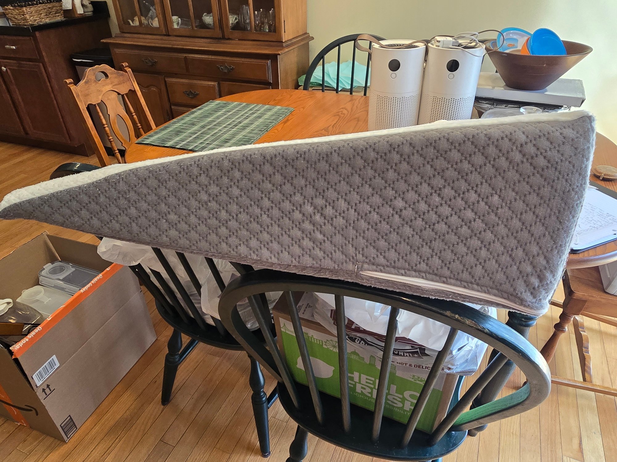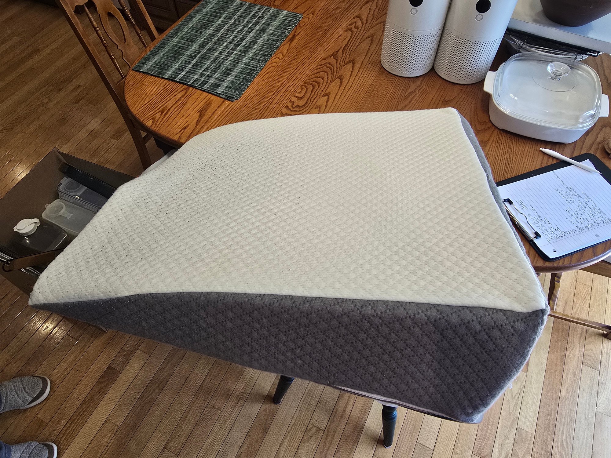 Foam wedge pillow with removable quilted cover — gray underside, cream waffle-knit top.