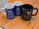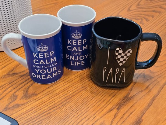 Notes: Three-mug lot — two tall blue "Keep Calm" ceramic mugs (Follow Your Dreams & Enjoy Life) and one black ceramic "I ❤ Papa" mug with checkered heart. Fun gift or novelty lot.