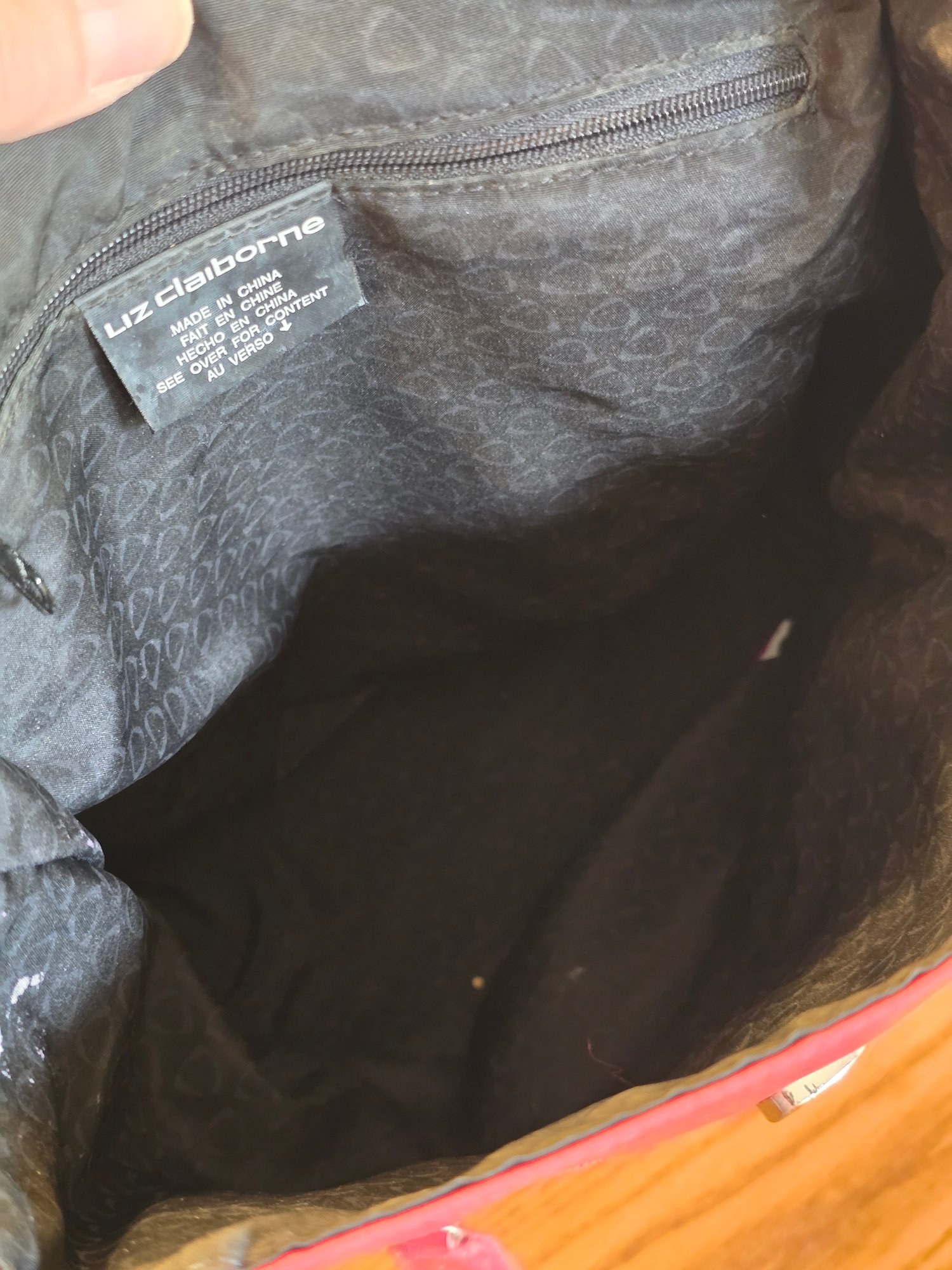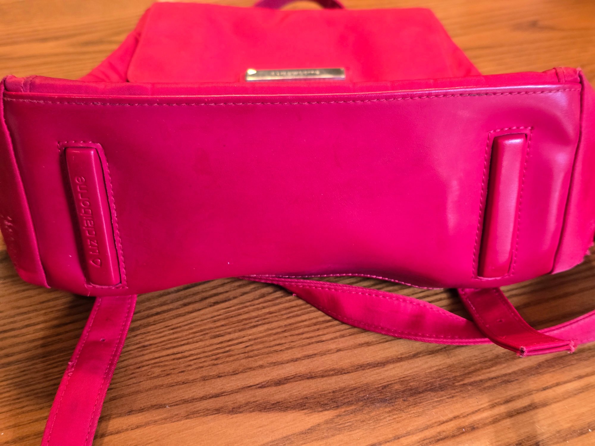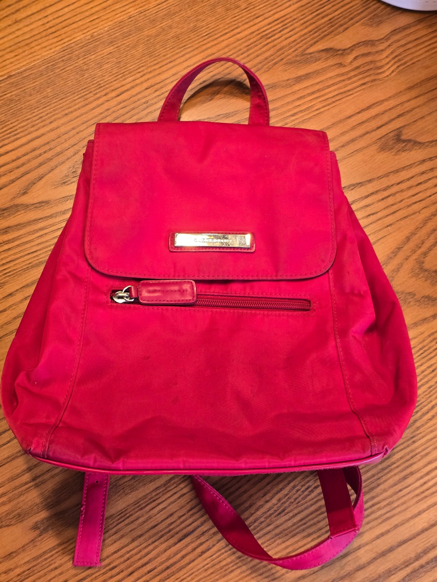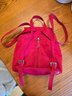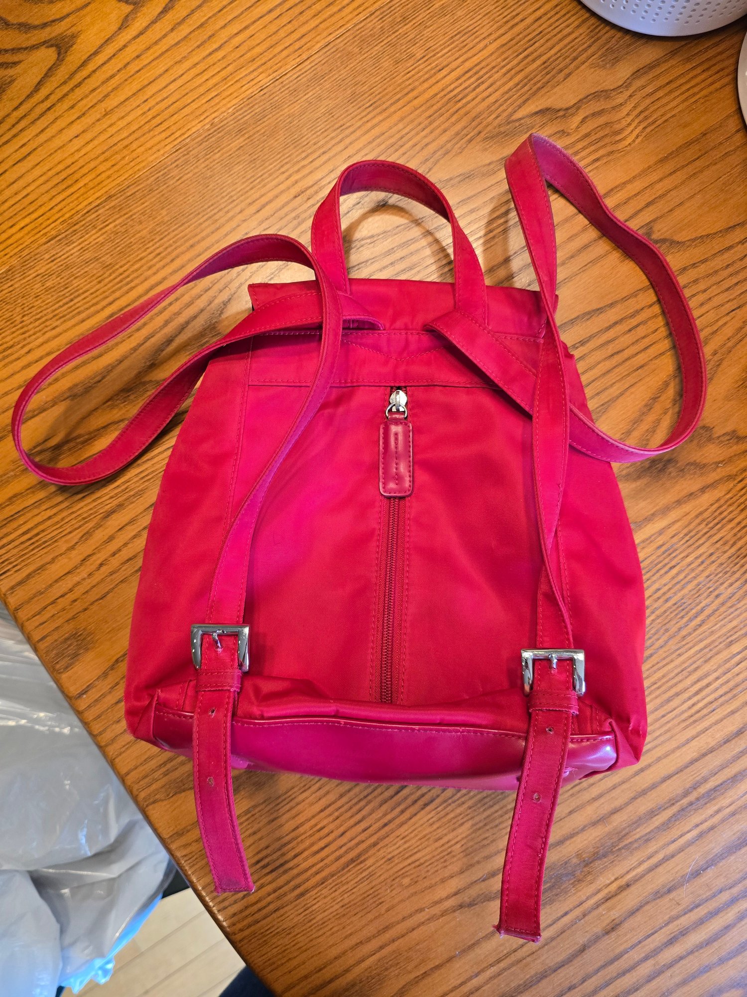 Liz Claiborne red nylon backpack with leather trim and straps. Liz Claiborne nameplate on front flap. Front zip pocket, flap closure with buckle straps, top handle. Red fabric lined interior.