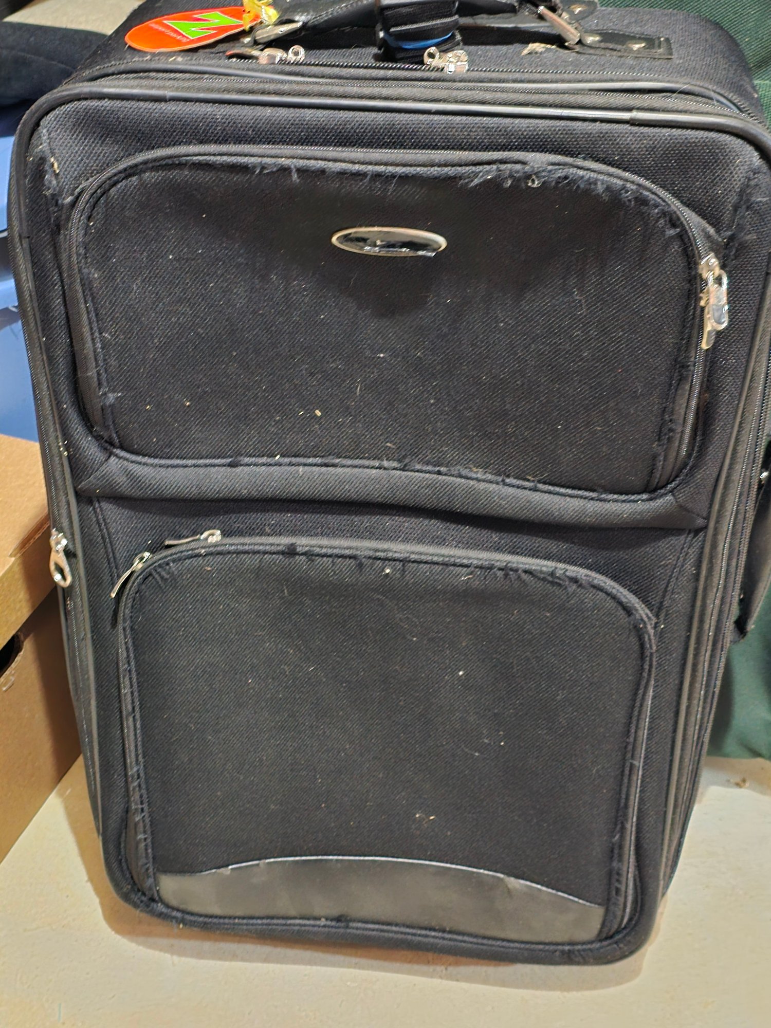 Condition: Well used. Shows wear, fraying on seams, dust on exterior. Zippers and wheels functional. Sold as-is.