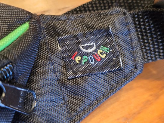 Vintage Dep Pouch fanny pack, copyright 1989, New Creative Ent. Inc., Cincinnati, Ohio. Black nylon with neon green piping, two zip compartments, adjustable waist strap.