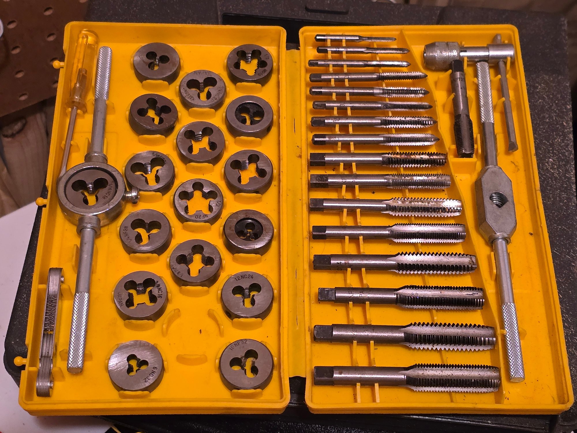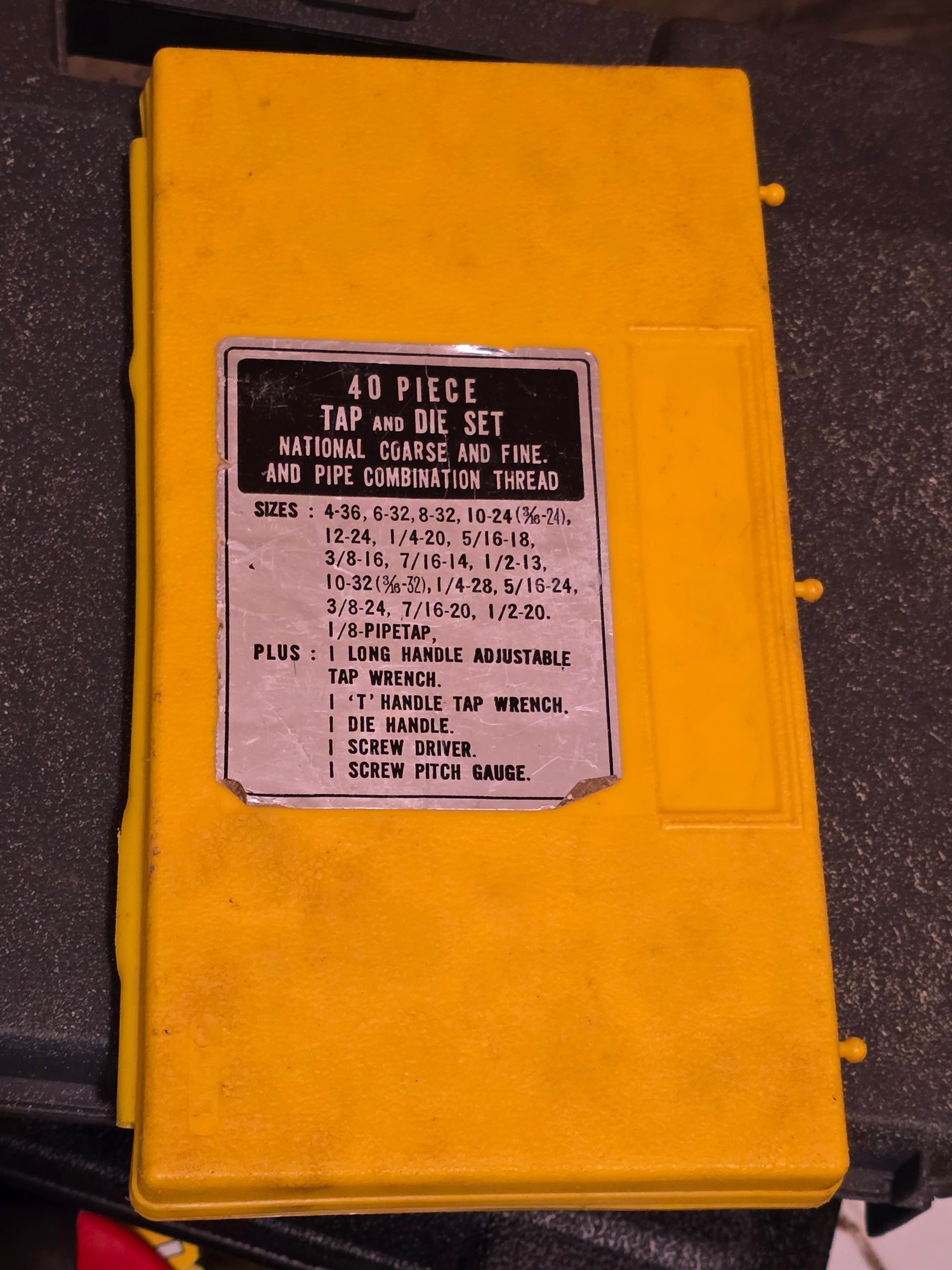 Notes: Vintage 40-piece tap and die set in yellow plastic case — National Coarse, Fine, and Pipe Combination Thread. Sizes 4-36 through 1/2-20 plus 1/8 pipe tap. Includes long handle adjustable tap wrench, T-handle tap wrench, die handle, screwdriver, and screw pitch gauge. Appears complete and well-stocked.