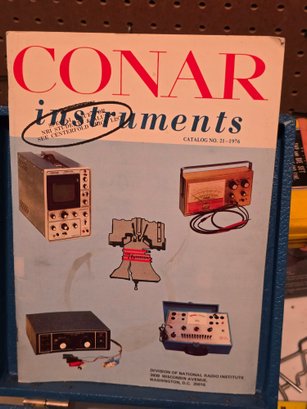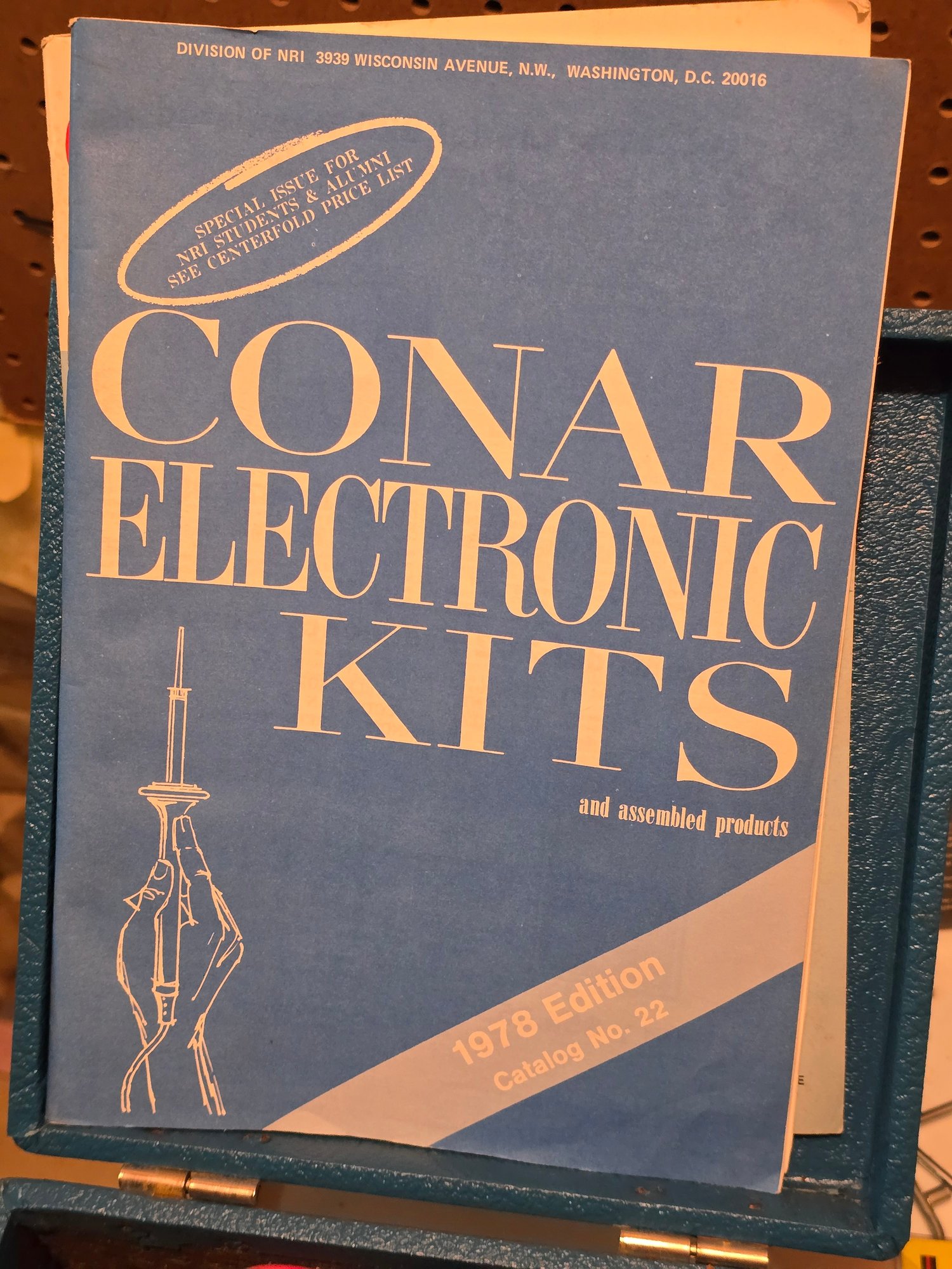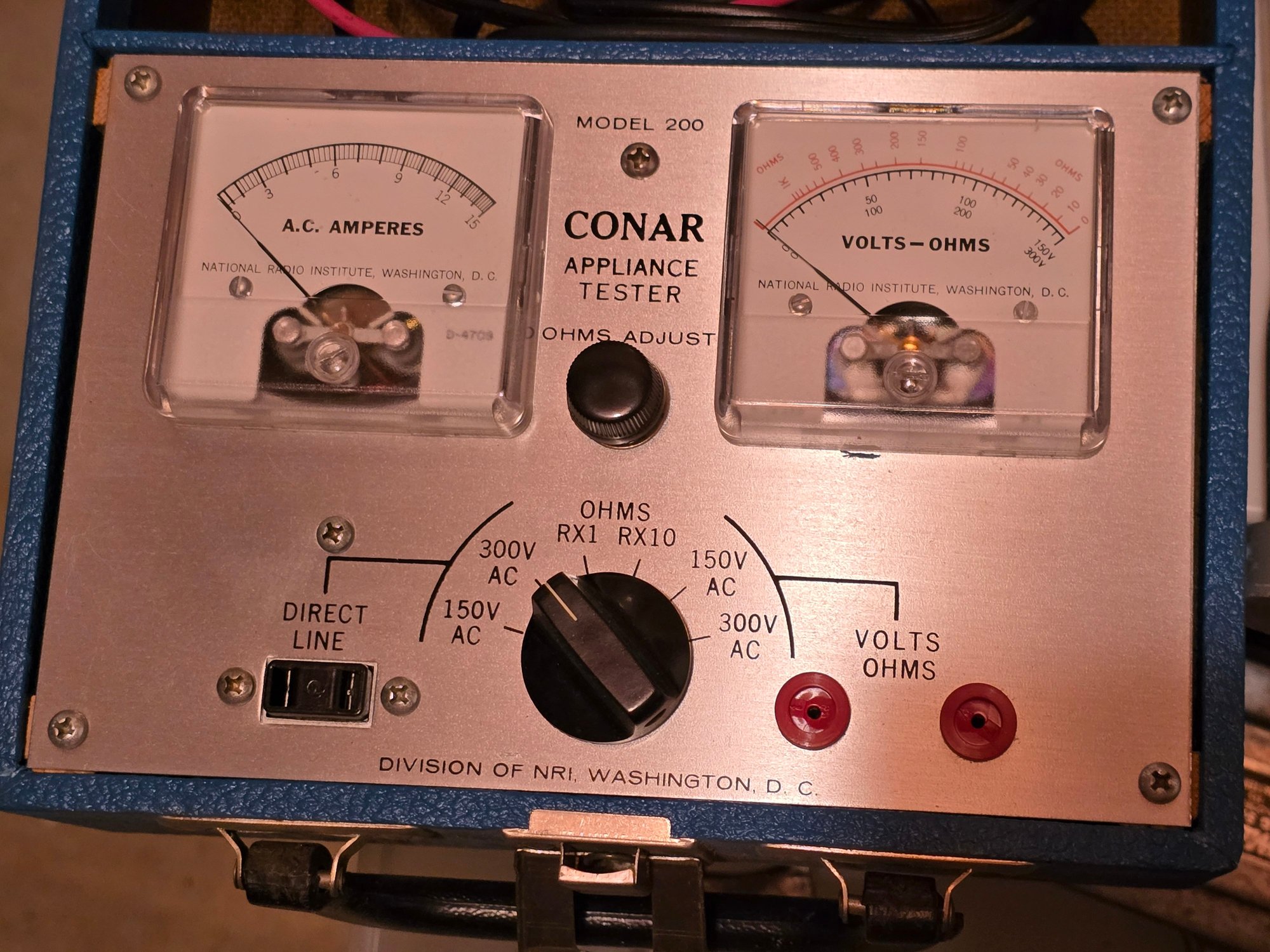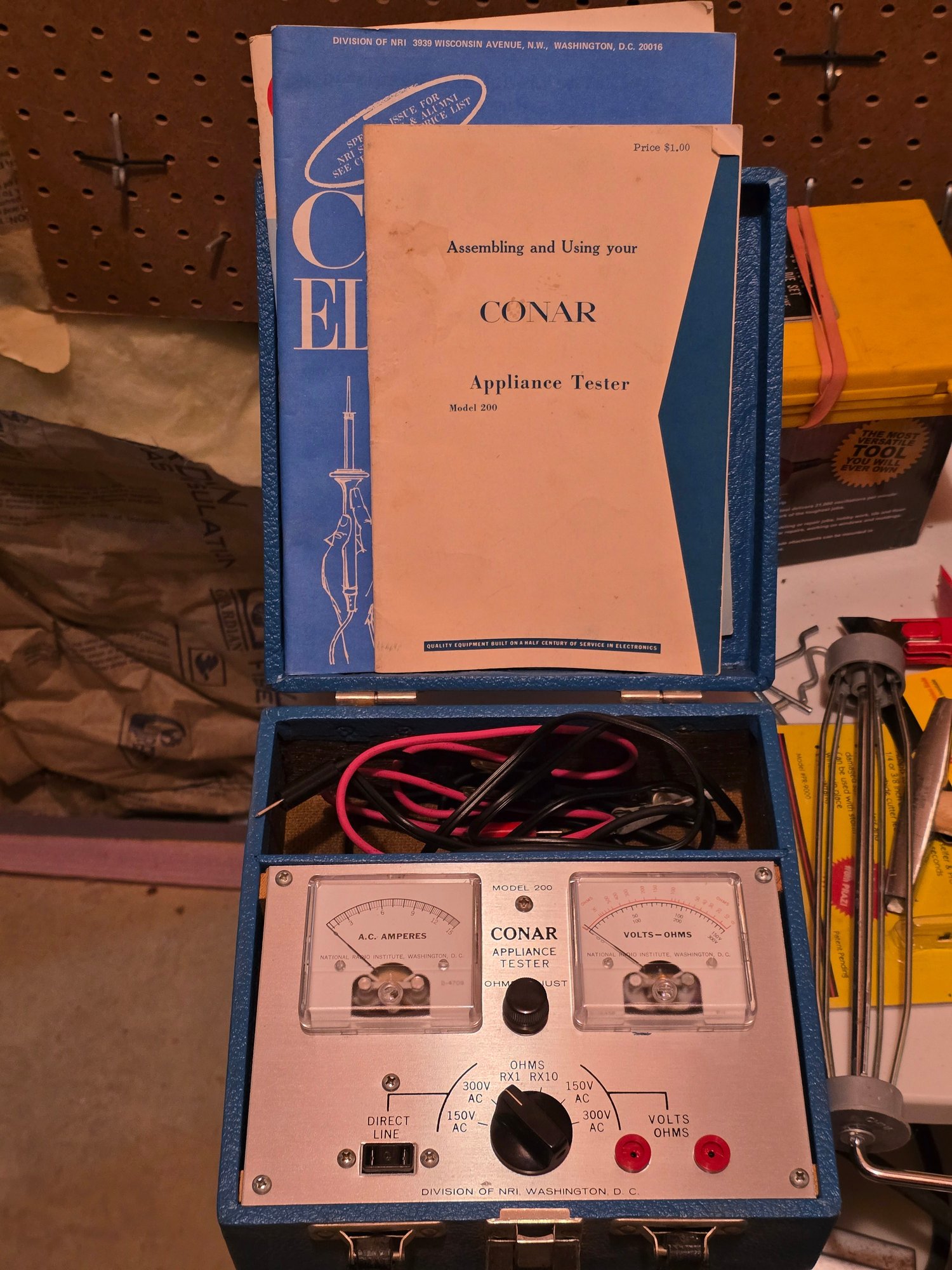 Notes: Vintage Conar Model 200 Appliance Tester by the National Radio Institute (NRI), Washington D.C. Dual analog meter panel — AC Amperes and Volts/Ohms. Rotary selector for 150V/300V AC, Ohms RX1/RX10, and direct line. Blue carry case with leads. Includes original assembly/user manual and two Conar NRI catalogs (1976 Catalog No. 21 and 1978 Electronic Kits Catalog No. 22). Great vintage electronics collectible.