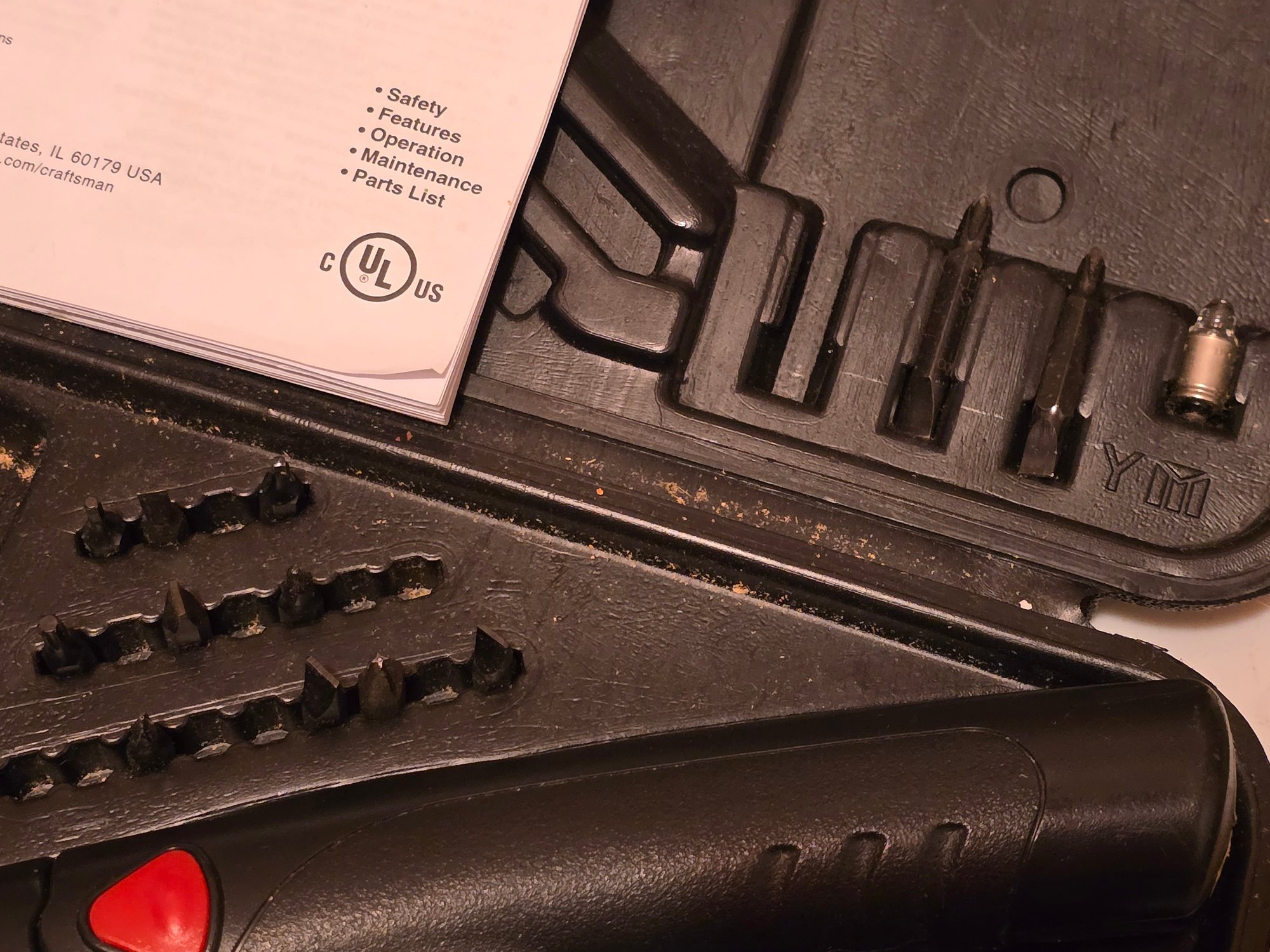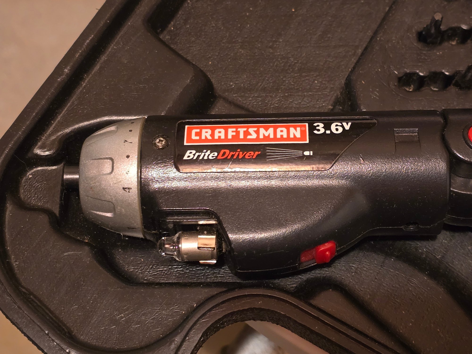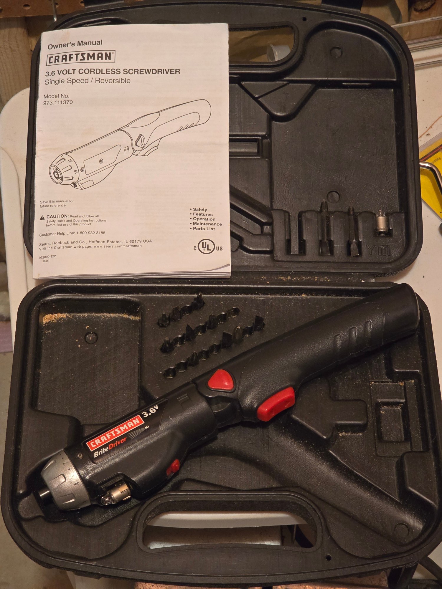 Notes: Craftsman BriteDriver 3.6V cordless screwdriver, single speed/reversible, Model 973.111370. Comes in original hard carry case with assorted bits and original owner's manual. Built-in light. Classic Craftsman quality.