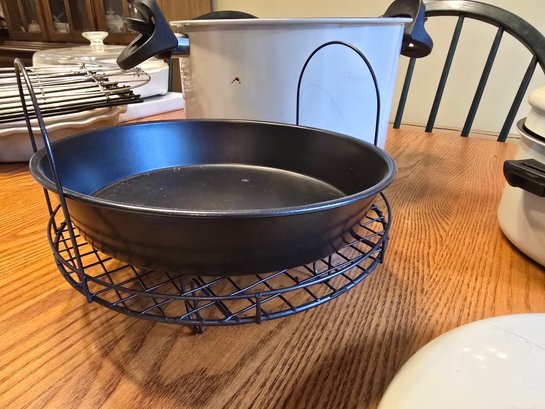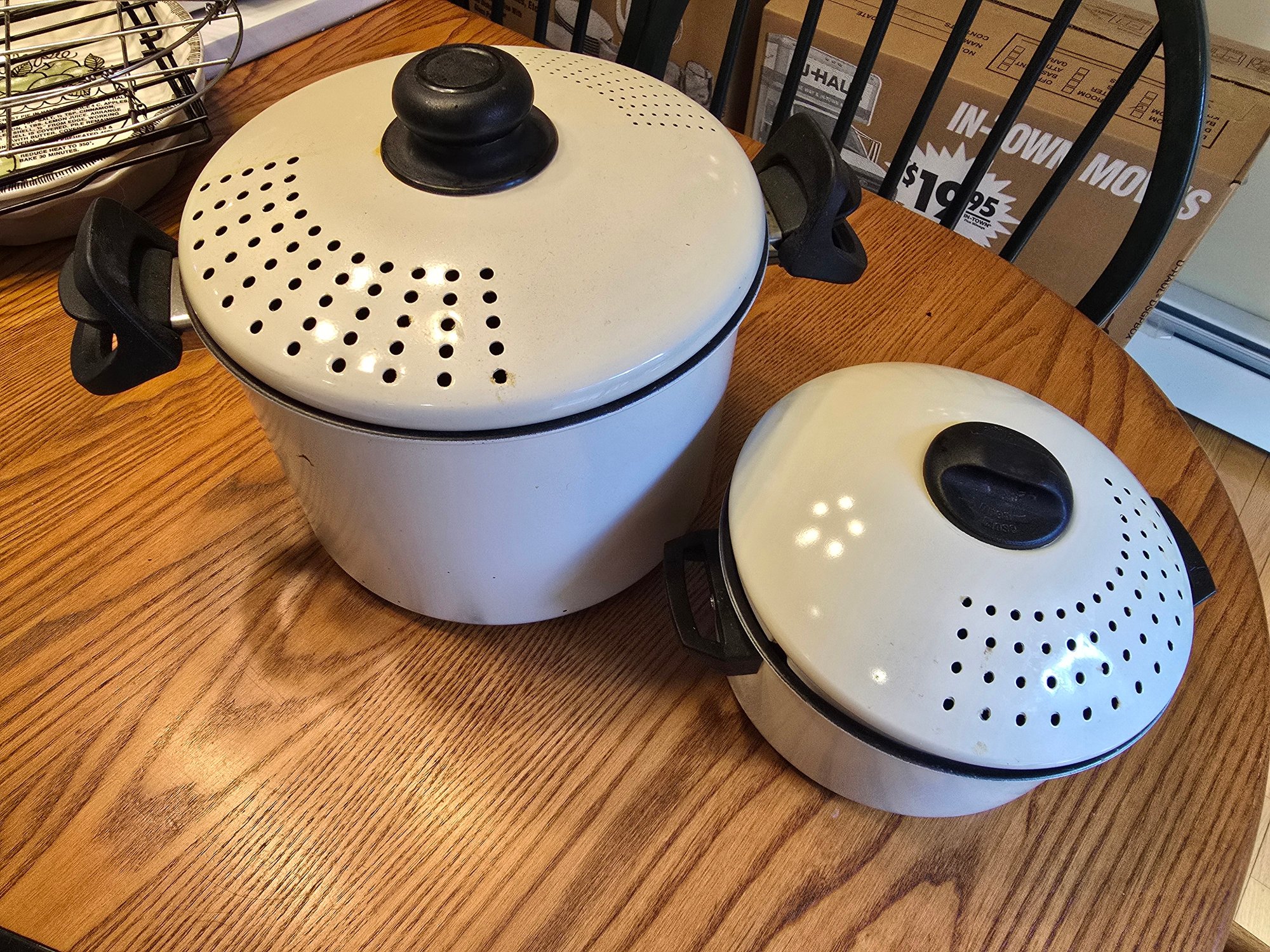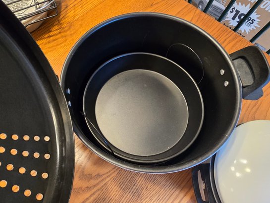 Lot includes: large white enamel pot with perforated strainer lid, nonstick round pan and steamer insert, small white enamel pot with perforated strainer lid. Large and small pots nest together for storage.