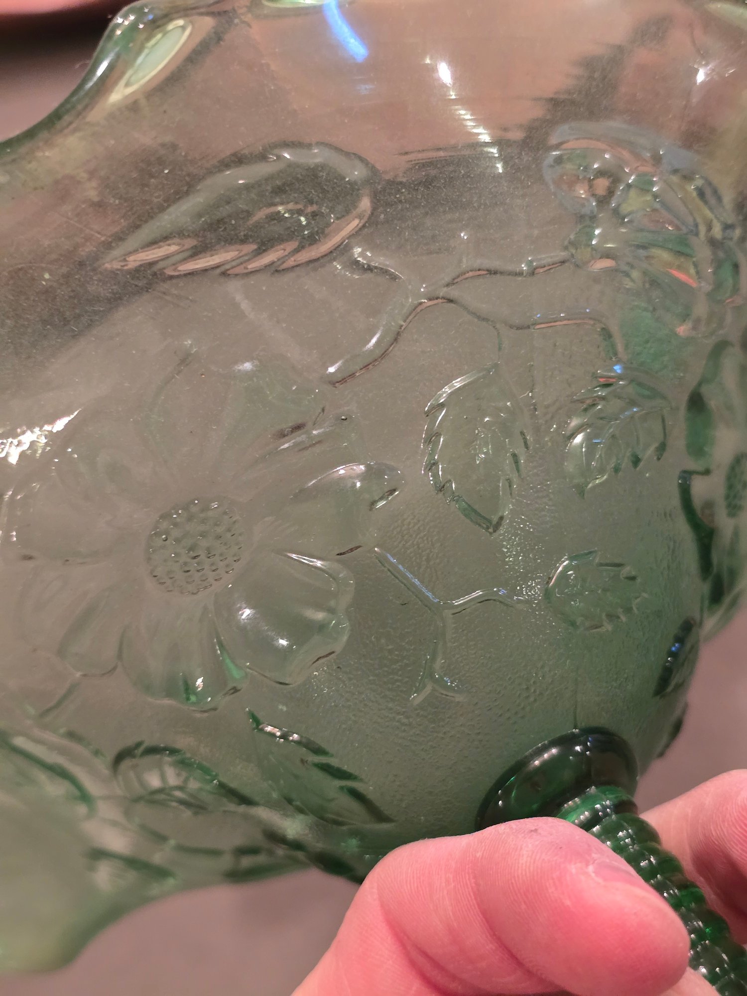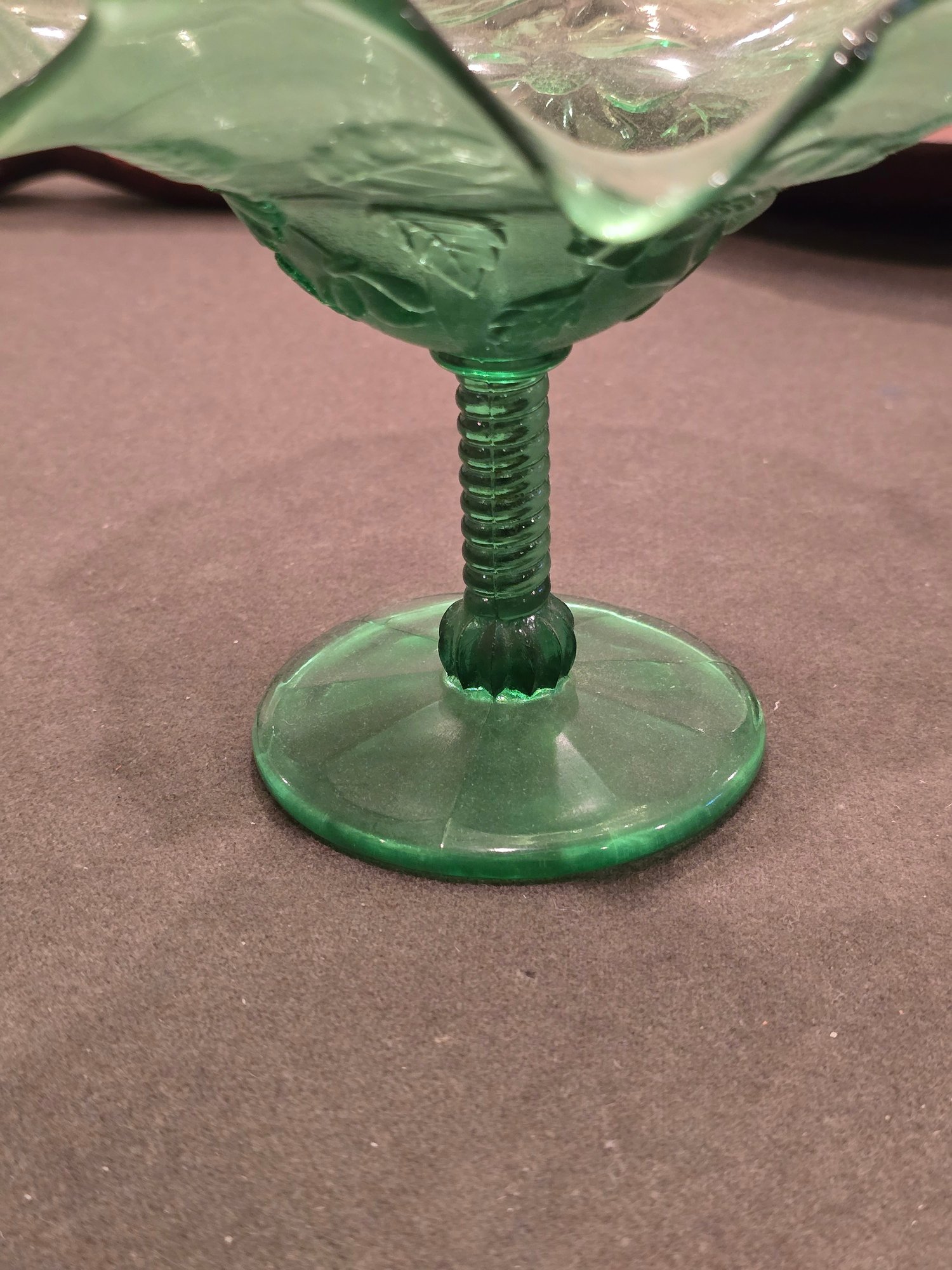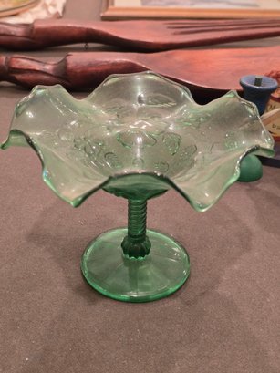 Vintage Green Glass Compote Pedestal Dish Ruffled Edge Embossed Floral Pattern