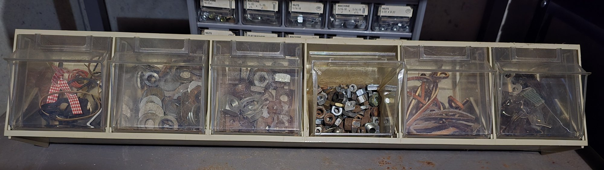 Condition: Used condition. Hardware shows rust/age. Bins intact. Contents as-found. Sold as-is.