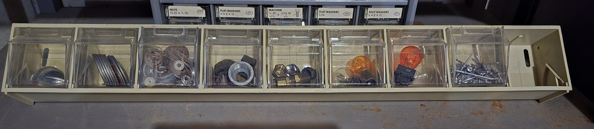 Condition: Good used condition. 8 of 9 bins present, one missing. Contents as-found. Sold as-is.