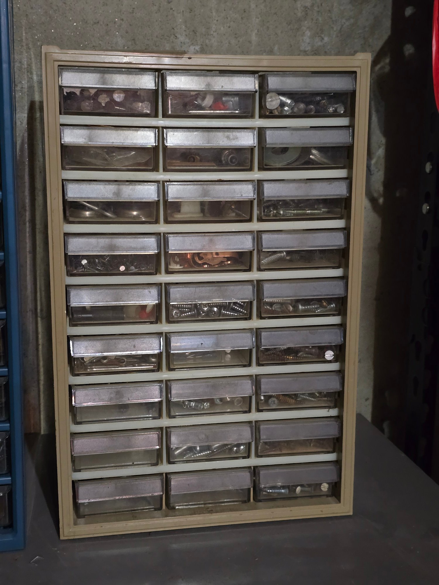 Notes: Tan/cream 27-drawer plastic hardware organizer cabinet with assorted hardware throughout — screws, bolts, nuts, washers, small fasteners and more. Good shop or garage organizer, contents included as-found.