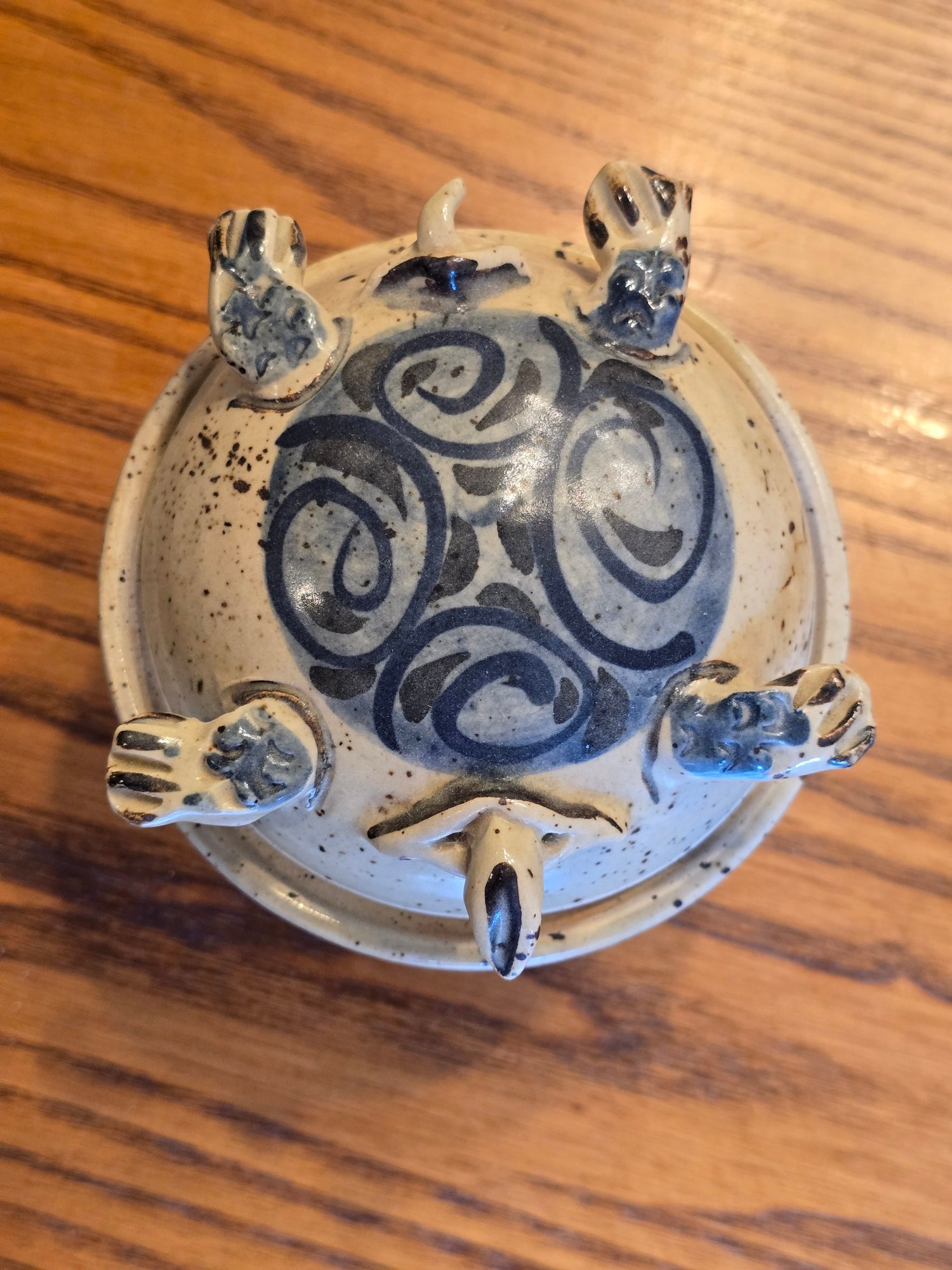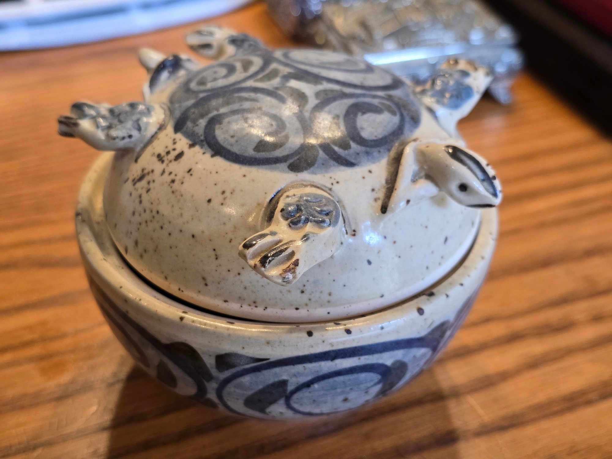 Handmade Mexican stoneware lidded jar in turtle form. Speckled cream glaze with bold cobalt blue spiral and scroll motifs. Four applied legs and tail on lid and base. Stamped "CM VER MEX" on base — Veracruz, Mexico.