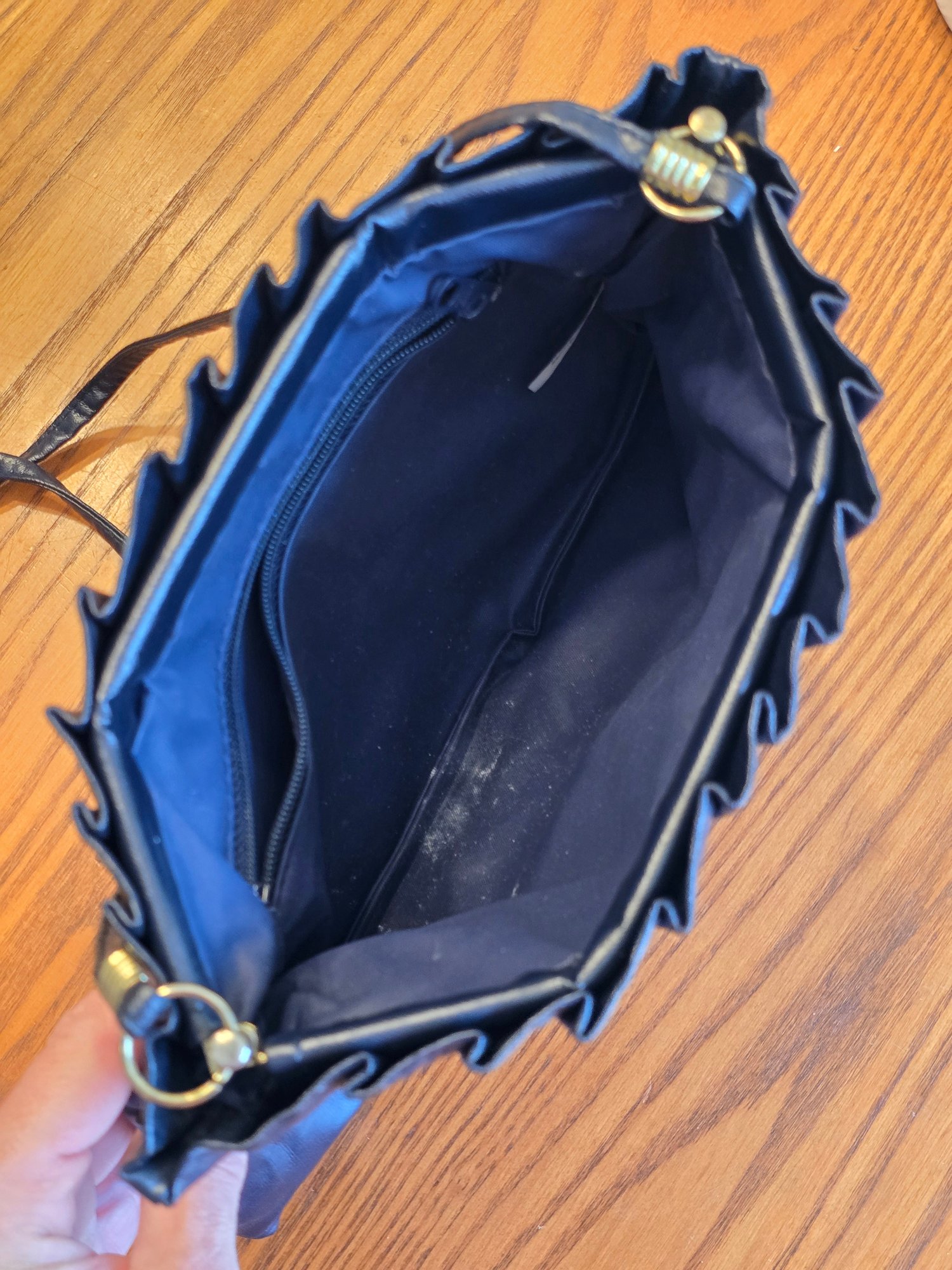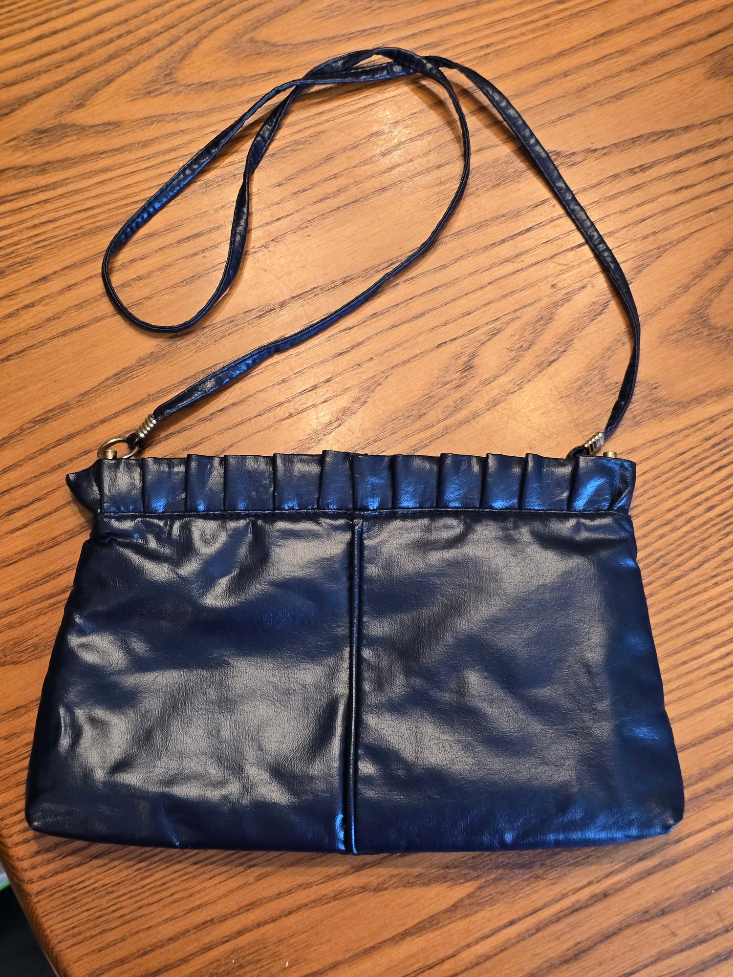 Vintage navy blue leather shoulder bag with ruffled/pleated top edge and gold tone hardware. Removable shoulder strap, open top with interior zip pocket. Navy fabric lining. No brand label found.