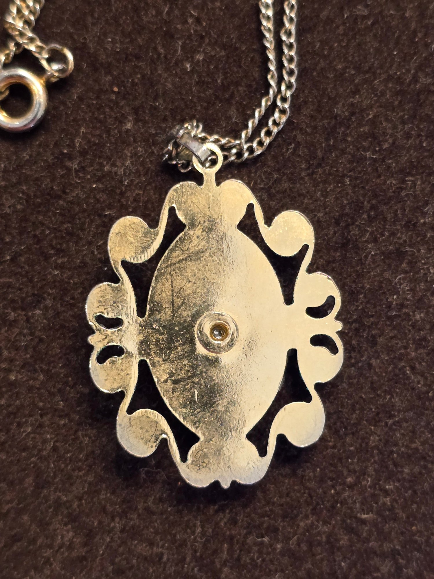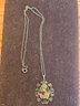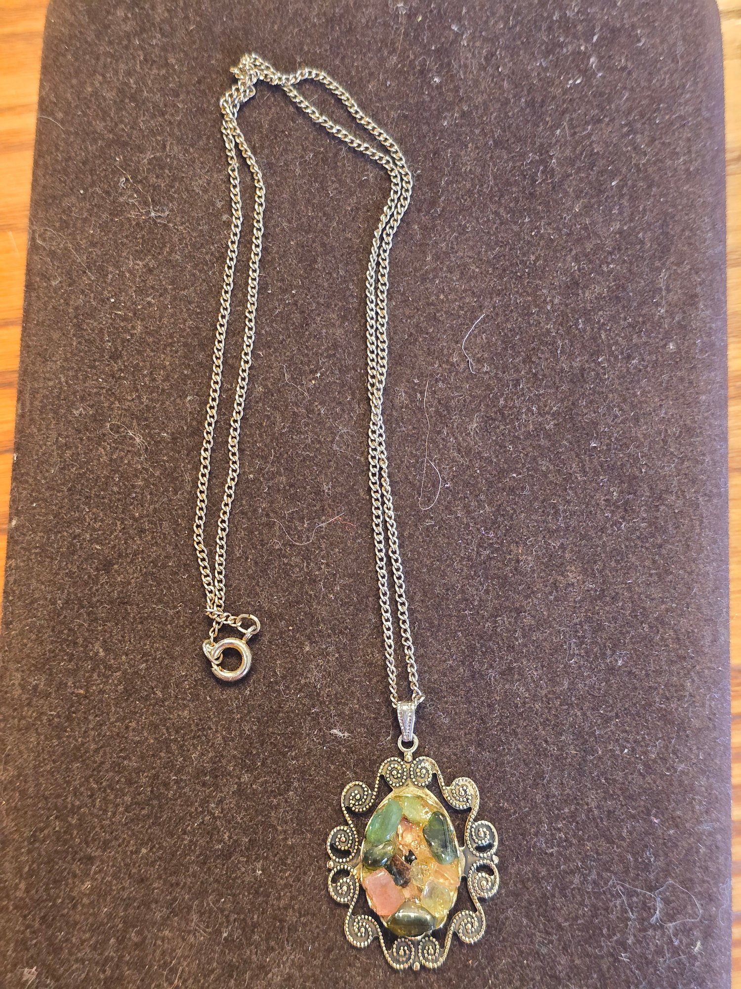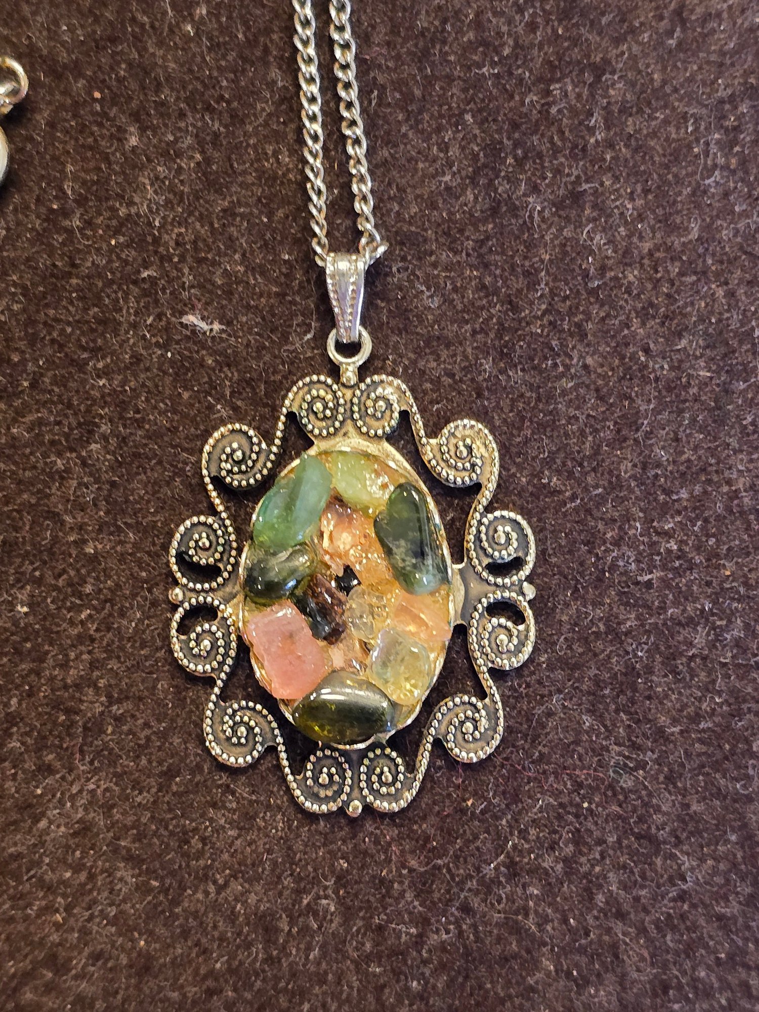 Chain with ornate scrollwork pendant. Mixed tumbled stones — green, pink, and clear — set in resin cabochon. Decorative beaded scroll surround. Spring ring clasp. Chain measures approx. 18".