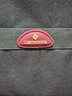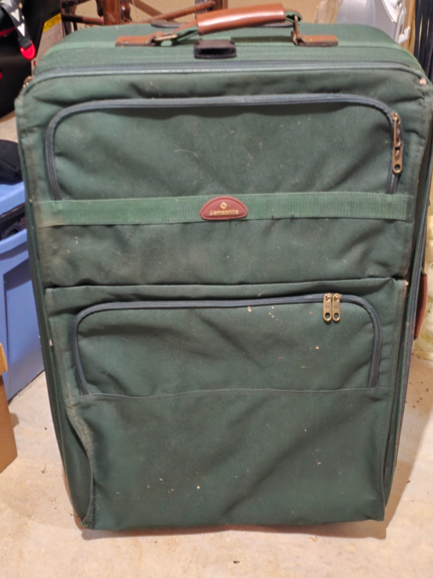 Notes: Vintage Samsonite large softside rolling suitcase in hunter green canvas with leather top handle and brass-tone zippers. Well-built and sturdy. Front zip pockets, expandable main compartment.