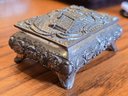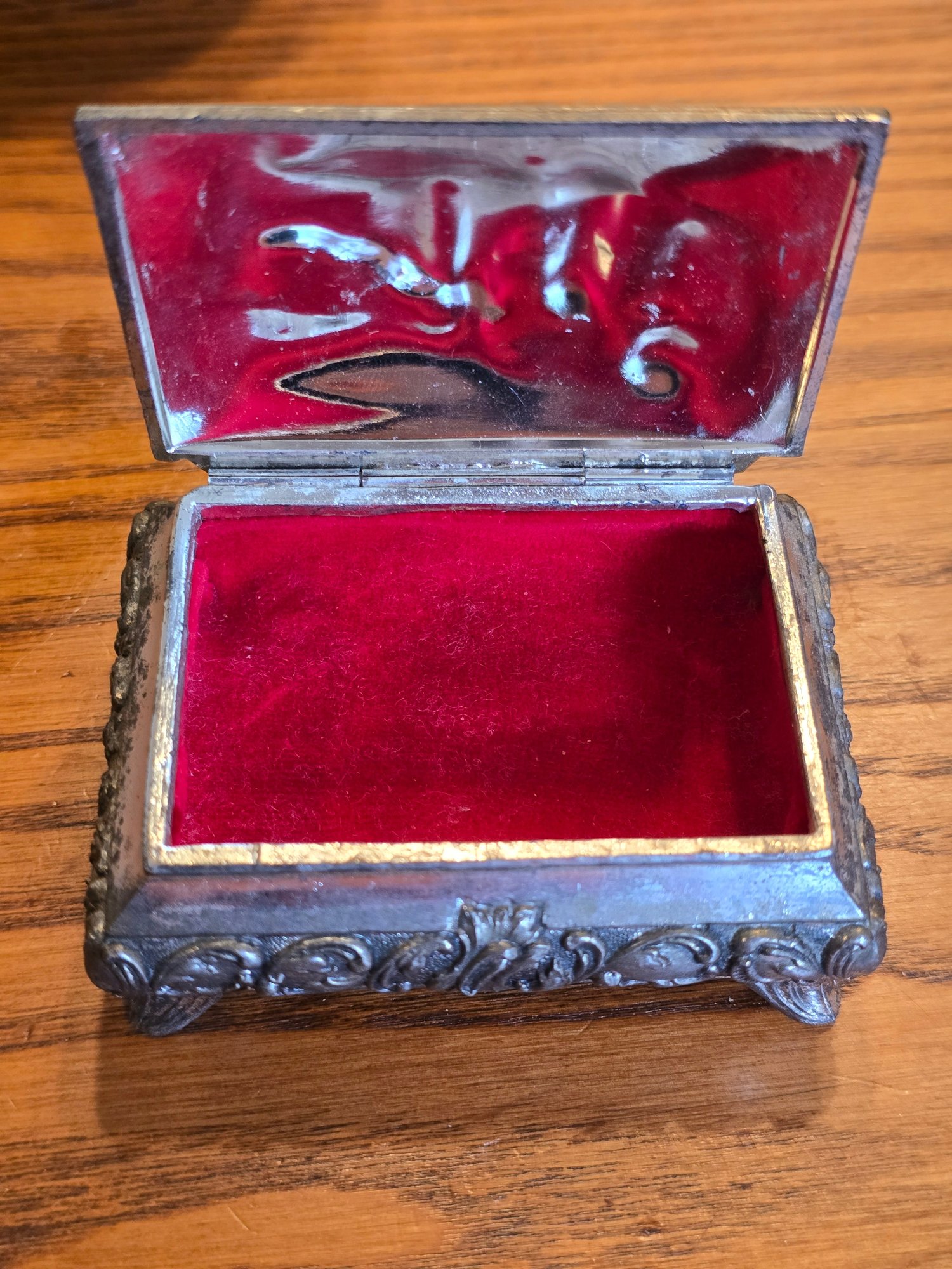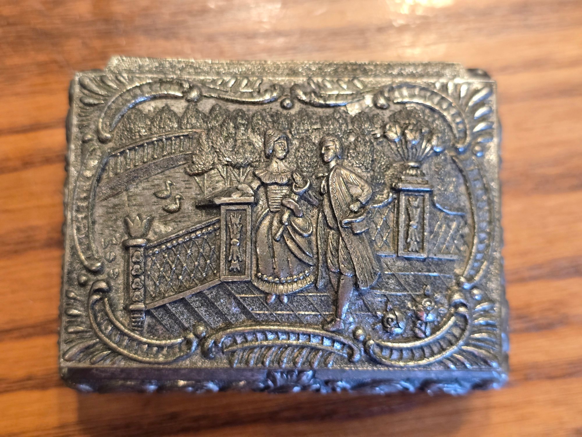 Vintage silver tone hinged trinket box on four ornate feet. Embossed romantic courtship scene on lid. Floral scroll sides. Red velvet lined interior. Approx. 3x2x1.5". Swan maker's mark stamped on base.