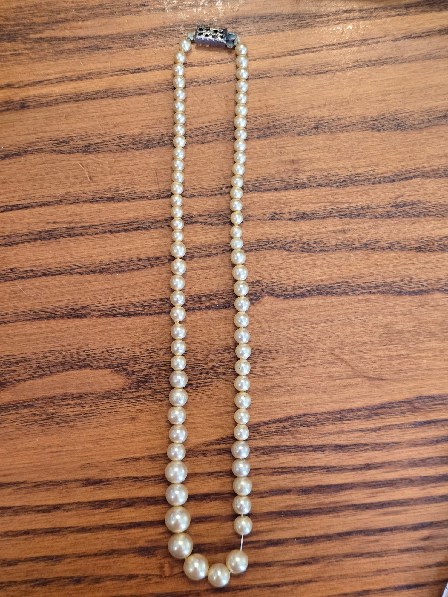 Graduated simulated pearls in cream/ivory, approx. 13". Decorative rhinestone box clasp. Pearls are loose on strand — needs restringing.