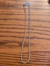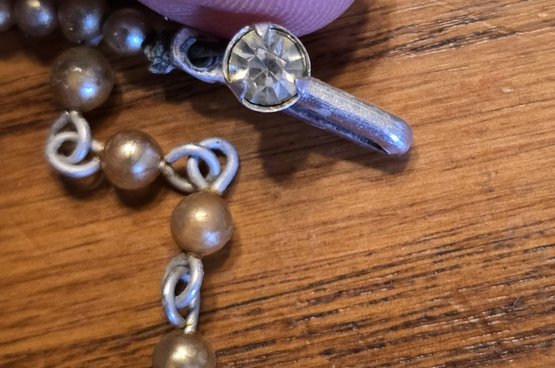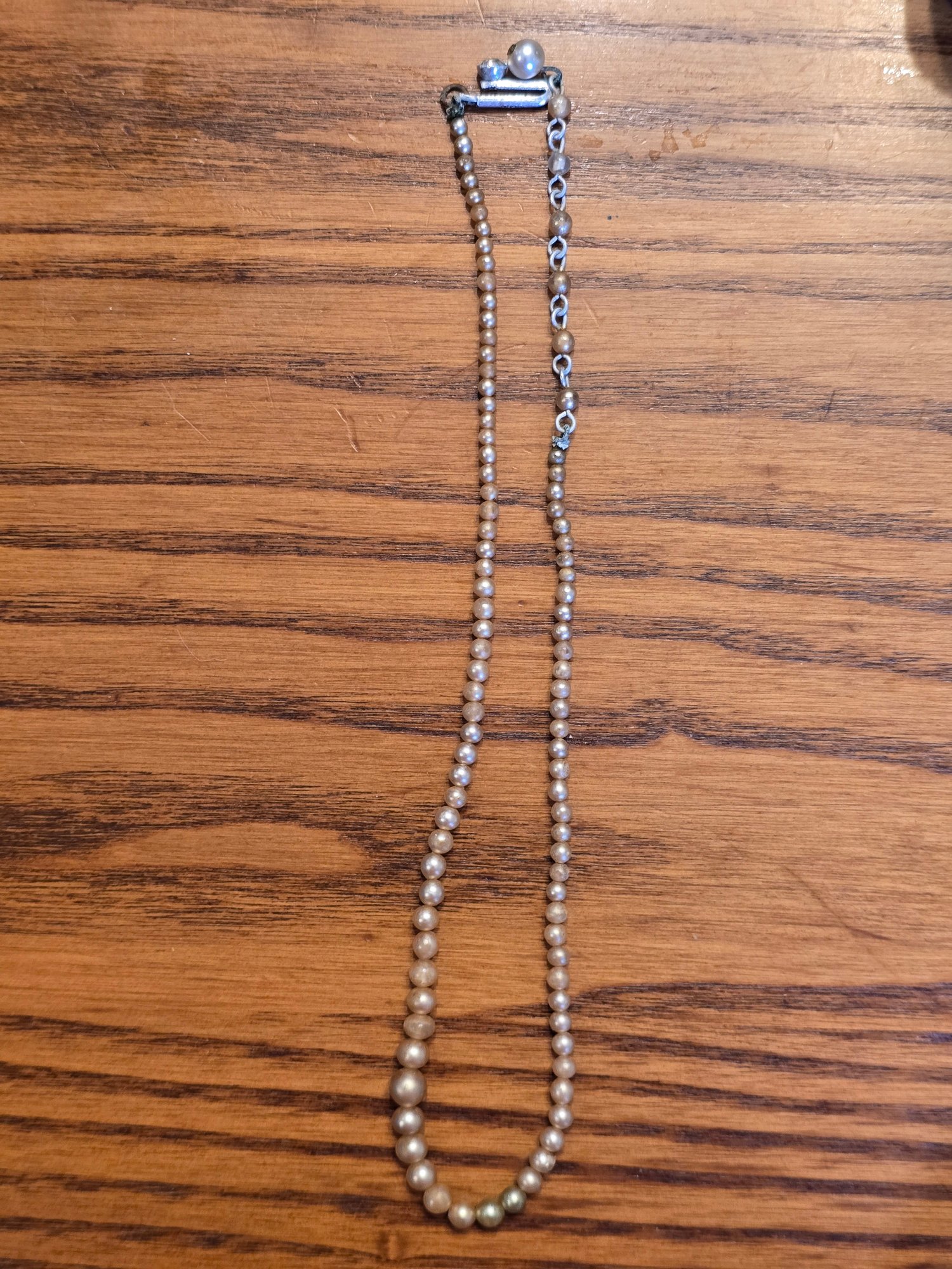 Tiny simulated seed pearls individually wire-linked on silver tone chain. Rhinestone-set barrel clasp. Warm champagne/peach pearls. Approx. 14".