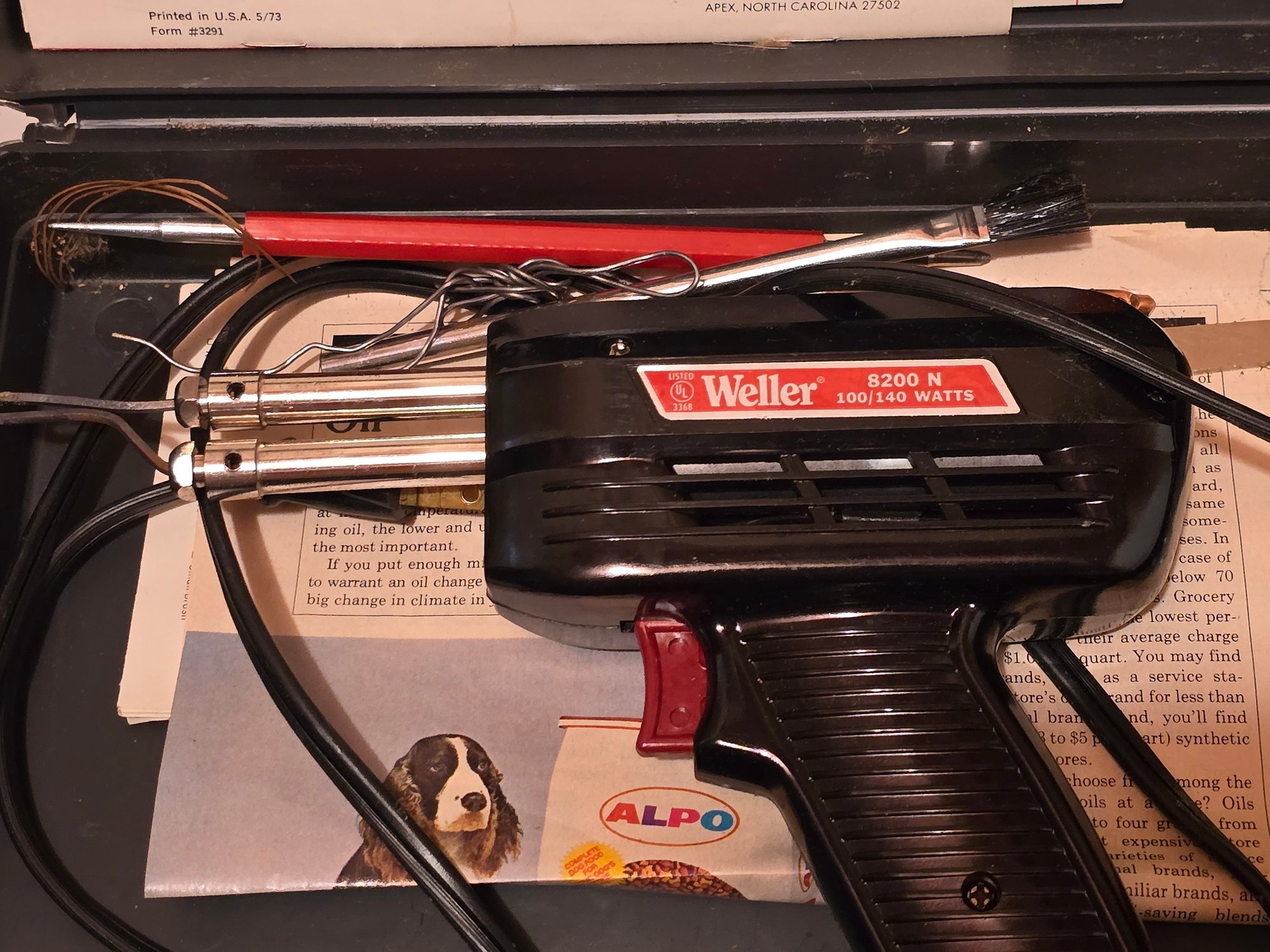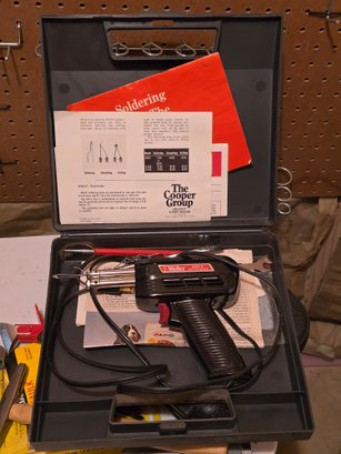 Notes: Vintage Weller Model 8200N soldering gun, 100/140 watts, in original hard carry case. Includes original instruction manual (The Cooper Group/Crescent-Lufkin-Weller, printed 5/73), tip cleaning brush, and extra tips. Classic American-made soldering gun — highly collectible and still very usable.