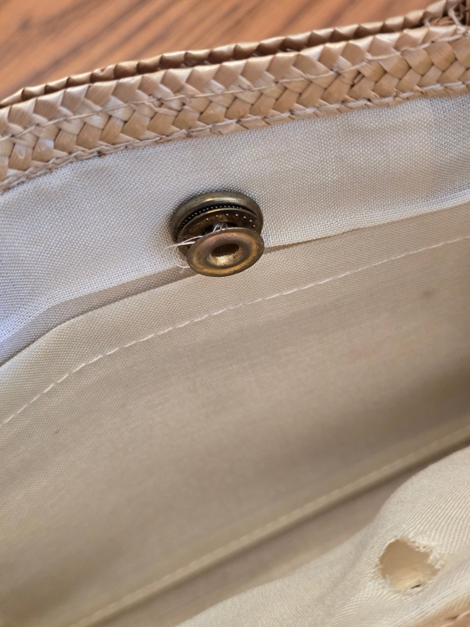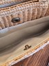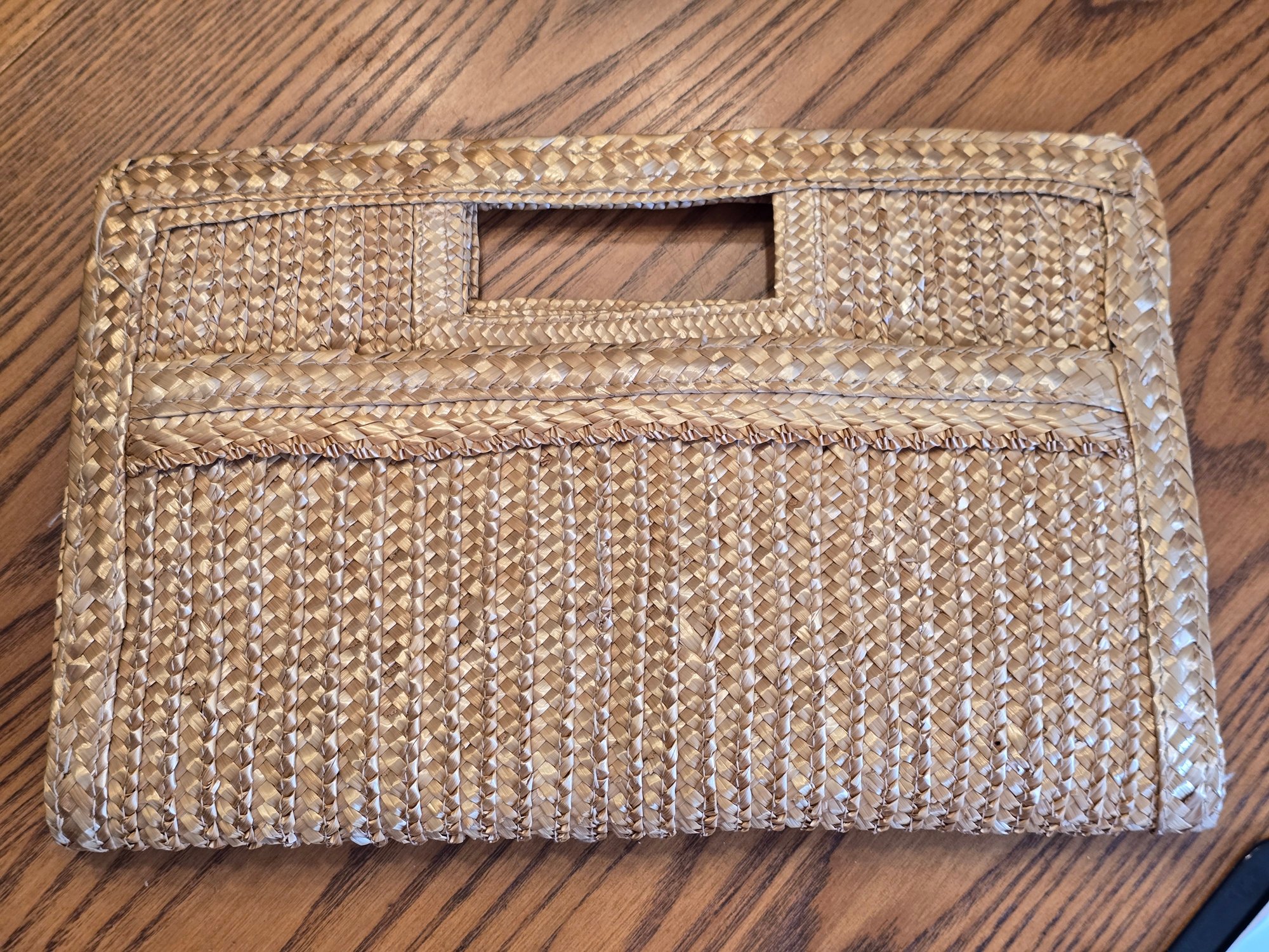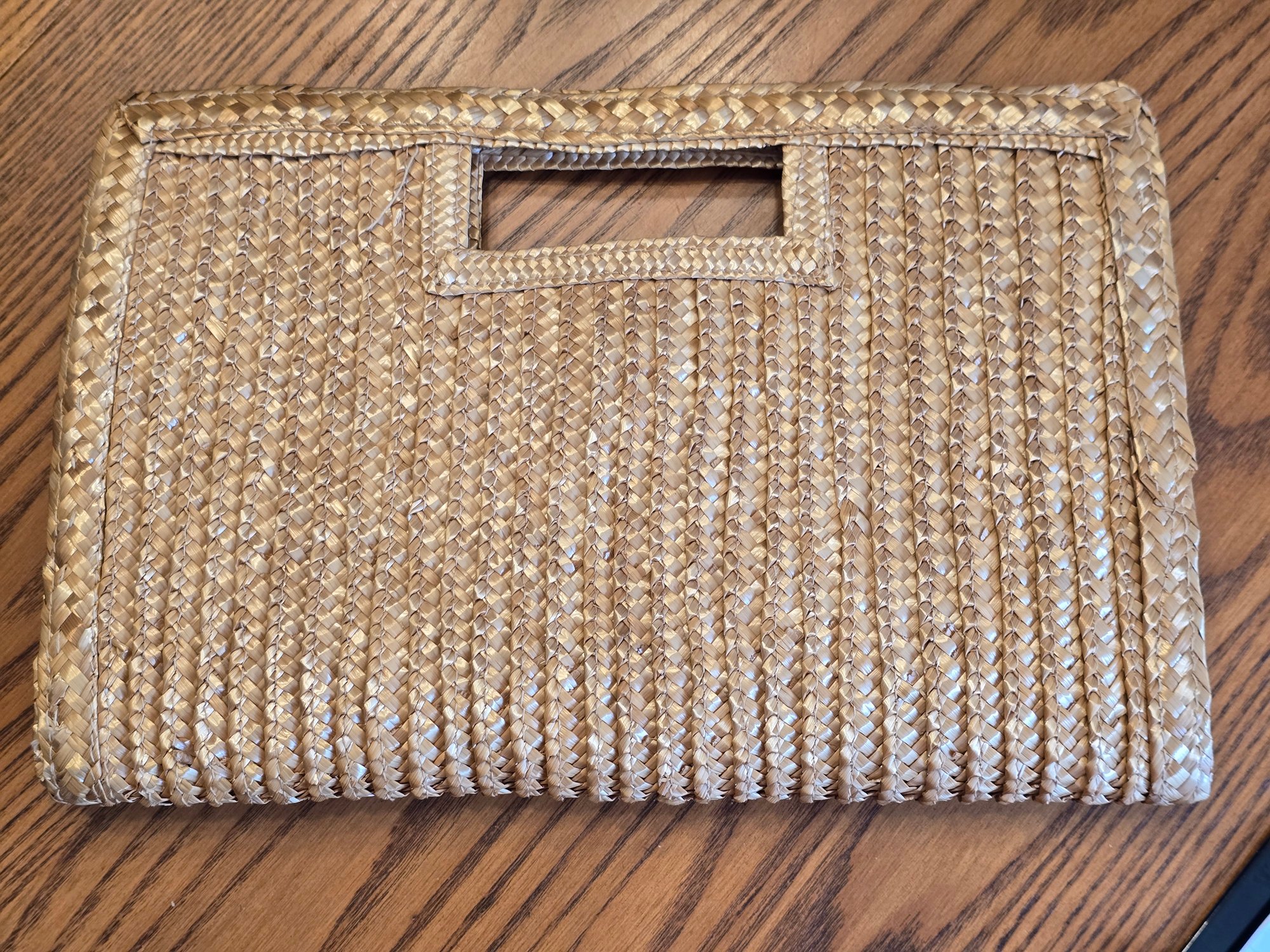 Woven straw/raffia clutch with rectangular cut-out top handle. Tan fabric lined interior with snap closure. No brand label.
