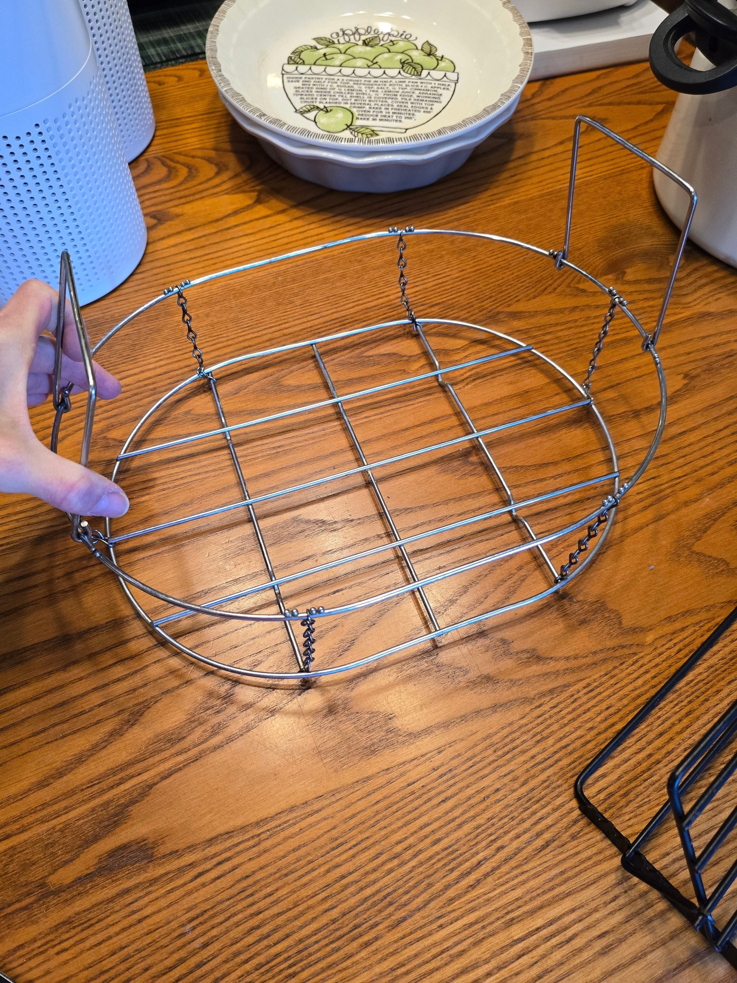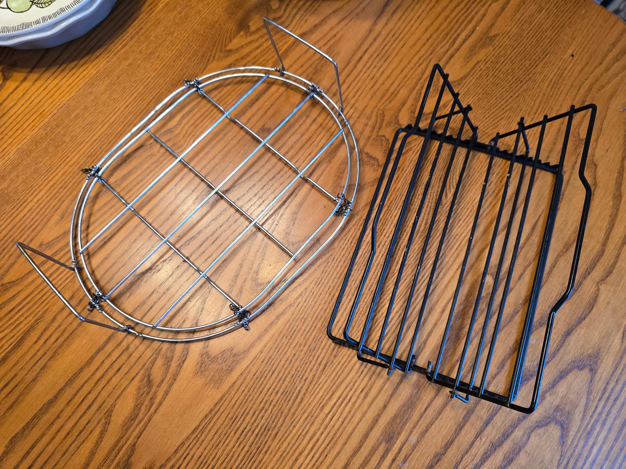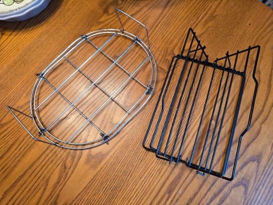Lot of 2 roasting racks: black coated adjustable roasting rack and collapsible chrome rack with chained folding handles. Both functional for roasting meats or poultry.