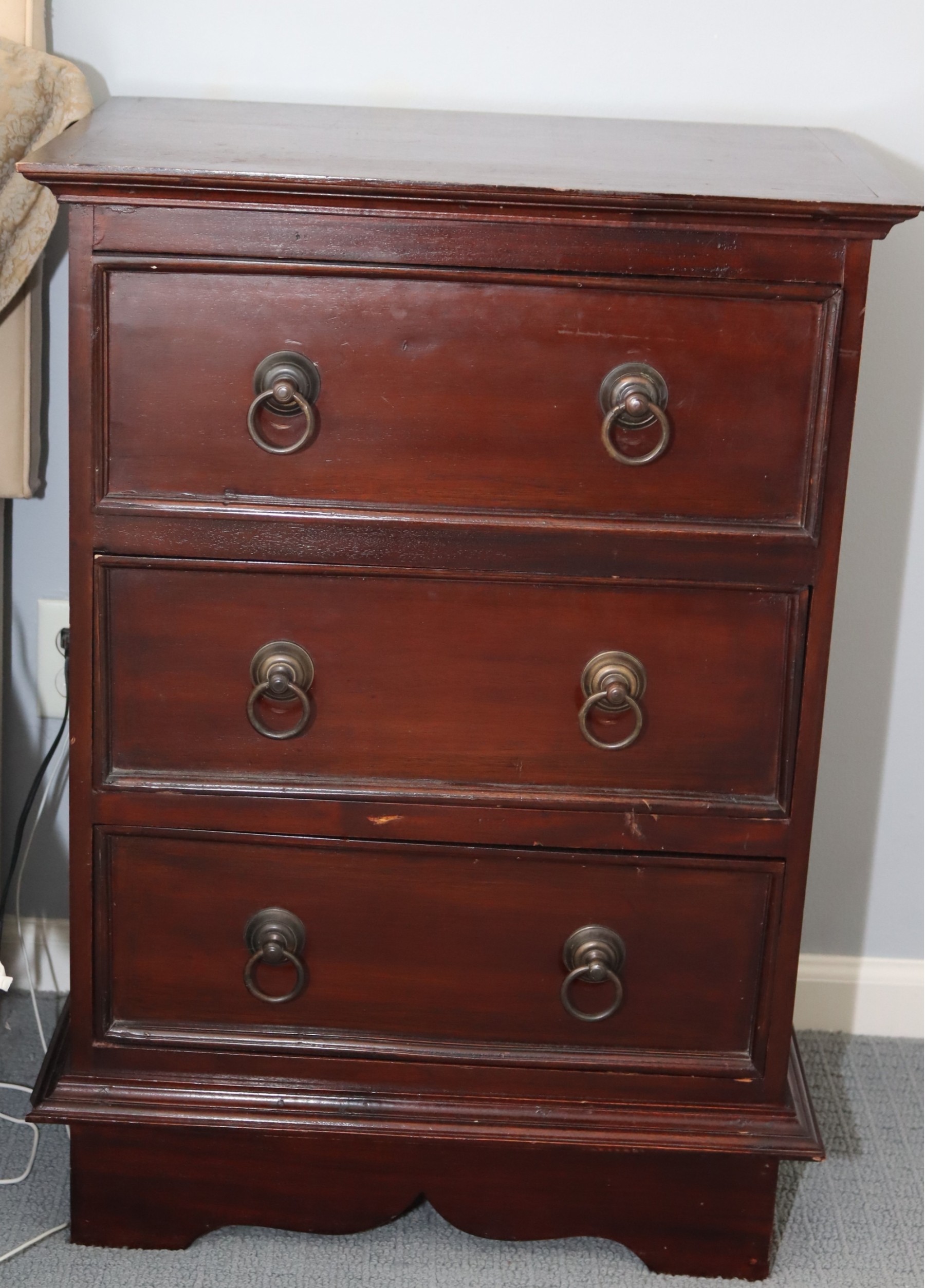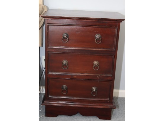 Small Wooden 3 Drawer Dresser End Table Nightstand . Small damage to corner as pictured. It measures 24" x 17"x 33" H