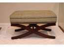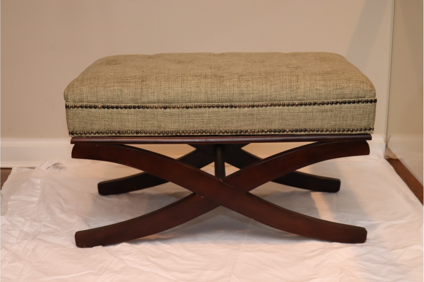 Upholstered Wood Leg Ottoman With Nailhead Trim. It measures 32" x 20" x 19" H