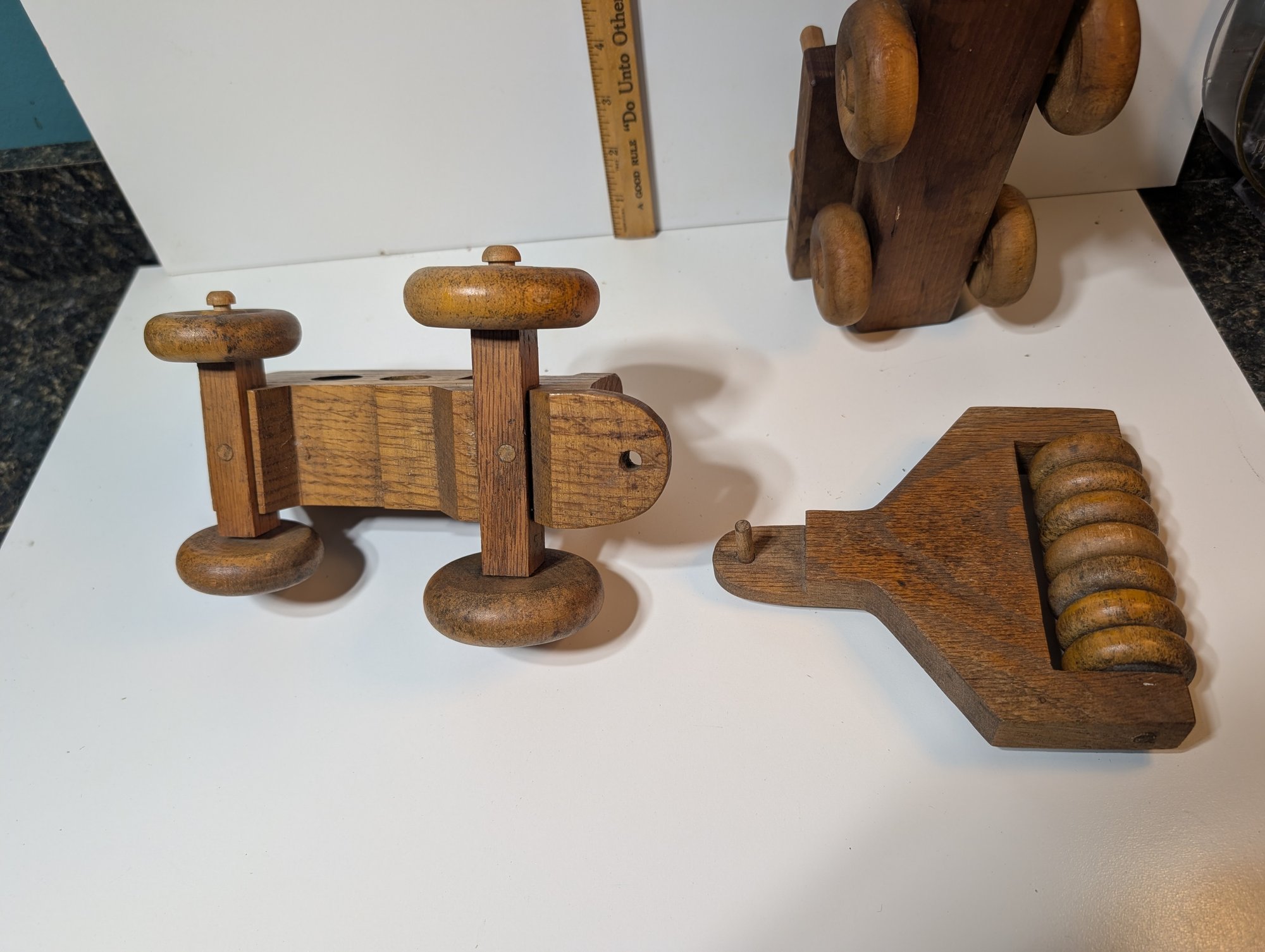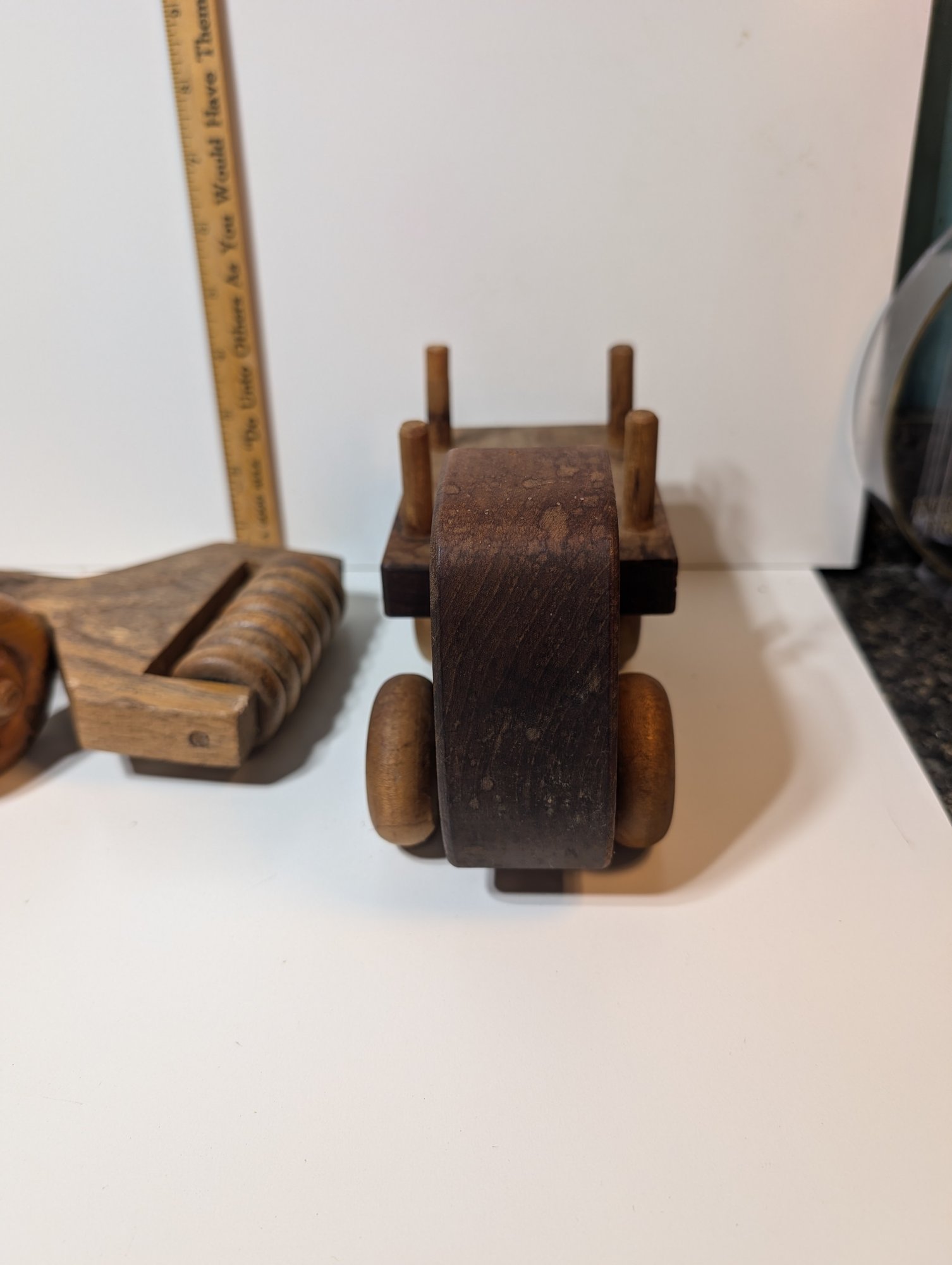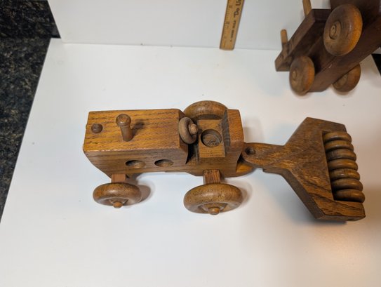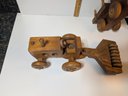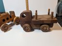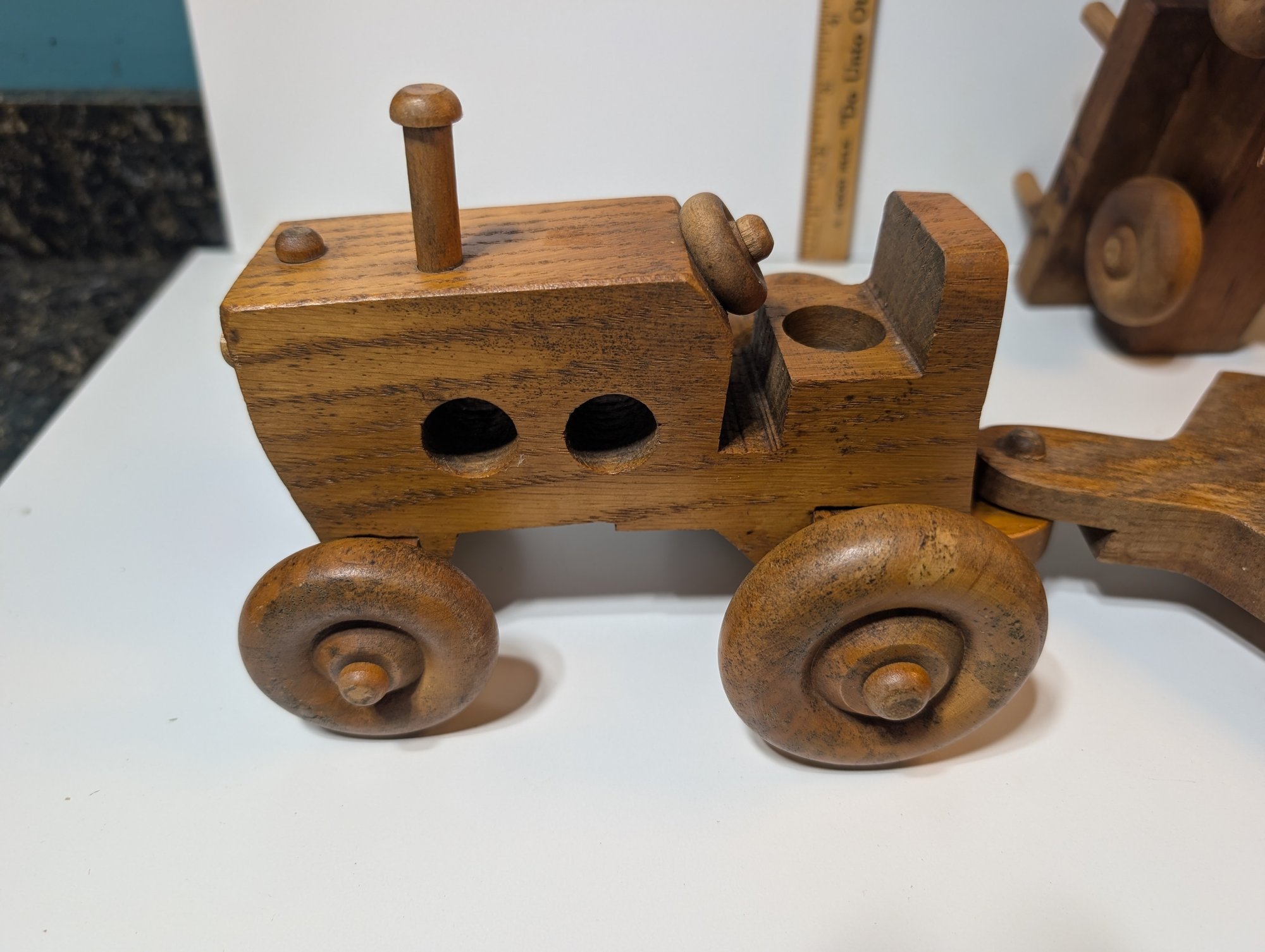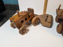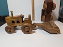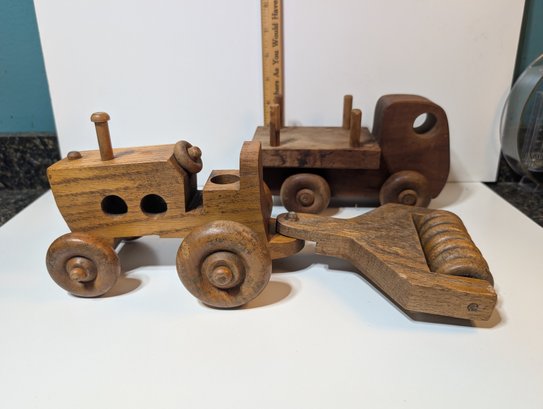 Handcrafted Vintage Folk Art Wooden Tractor With Roller And Flatbed Truck Set