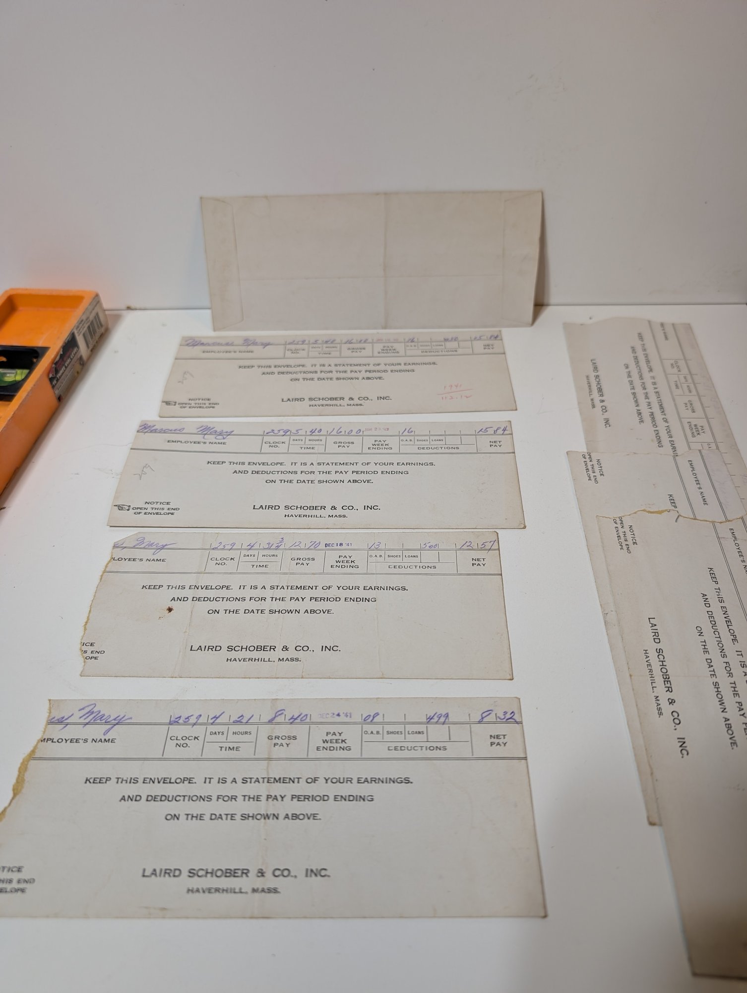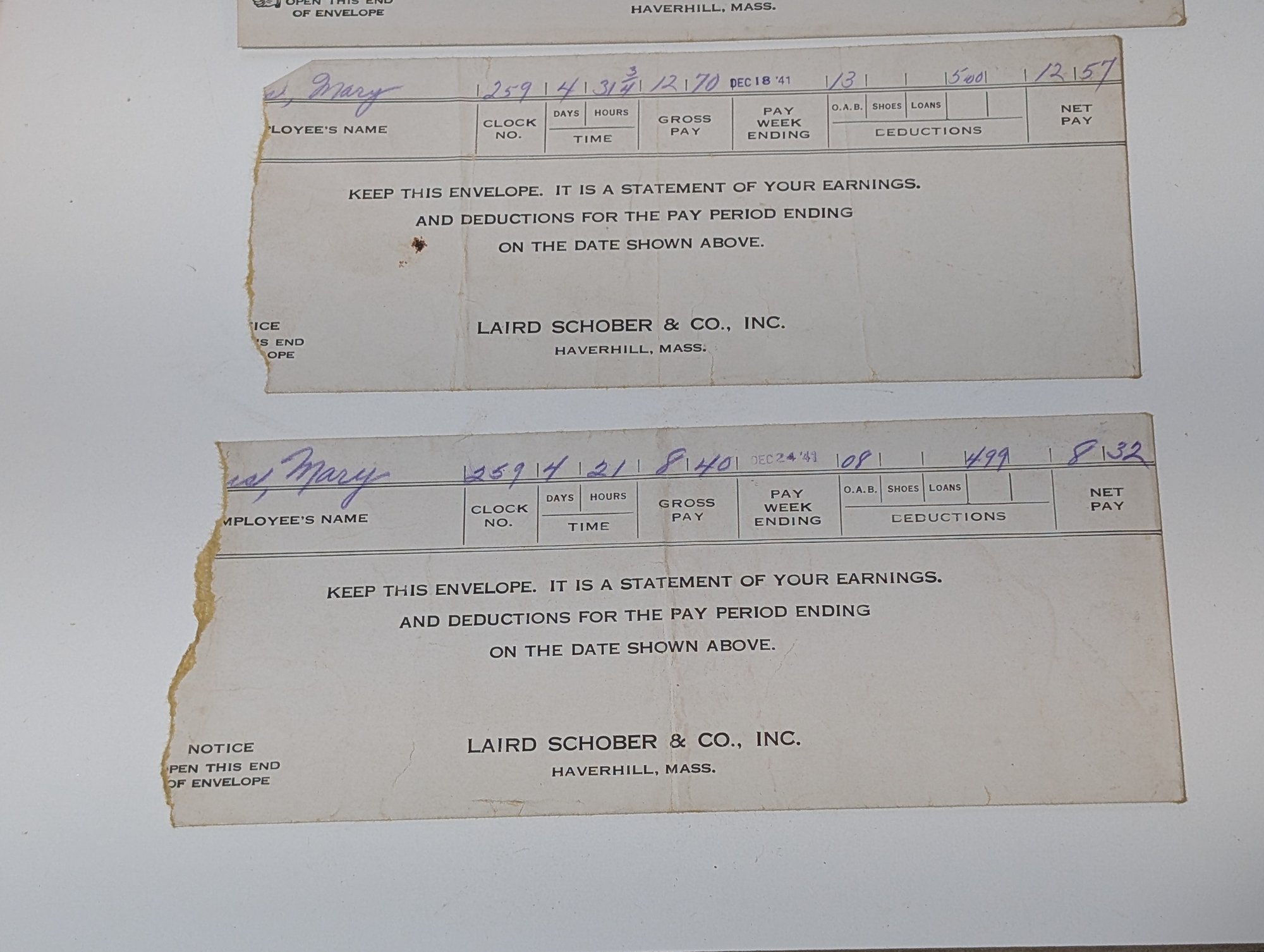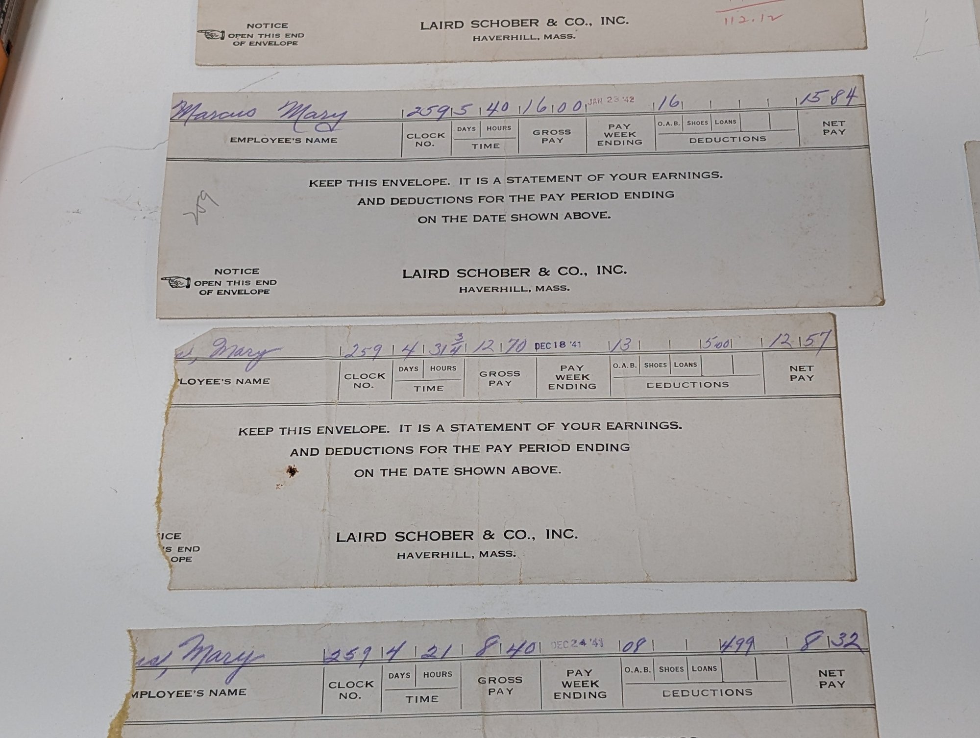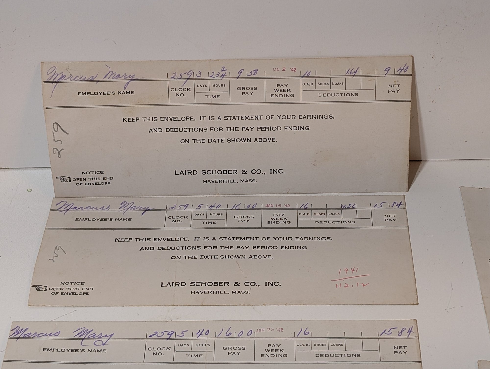 Vintage 1941-1942 Laird Schober & Co. Shoe Factory Pay Stub Envelopes - Haverhill, Mass.