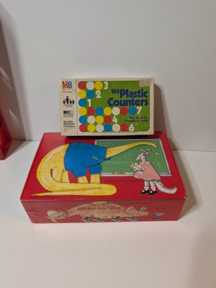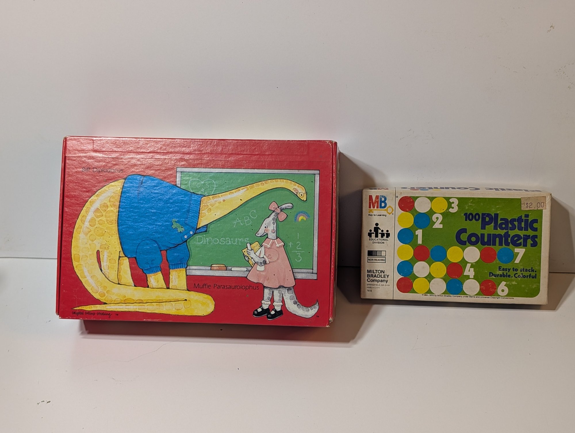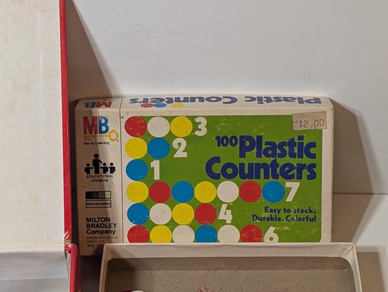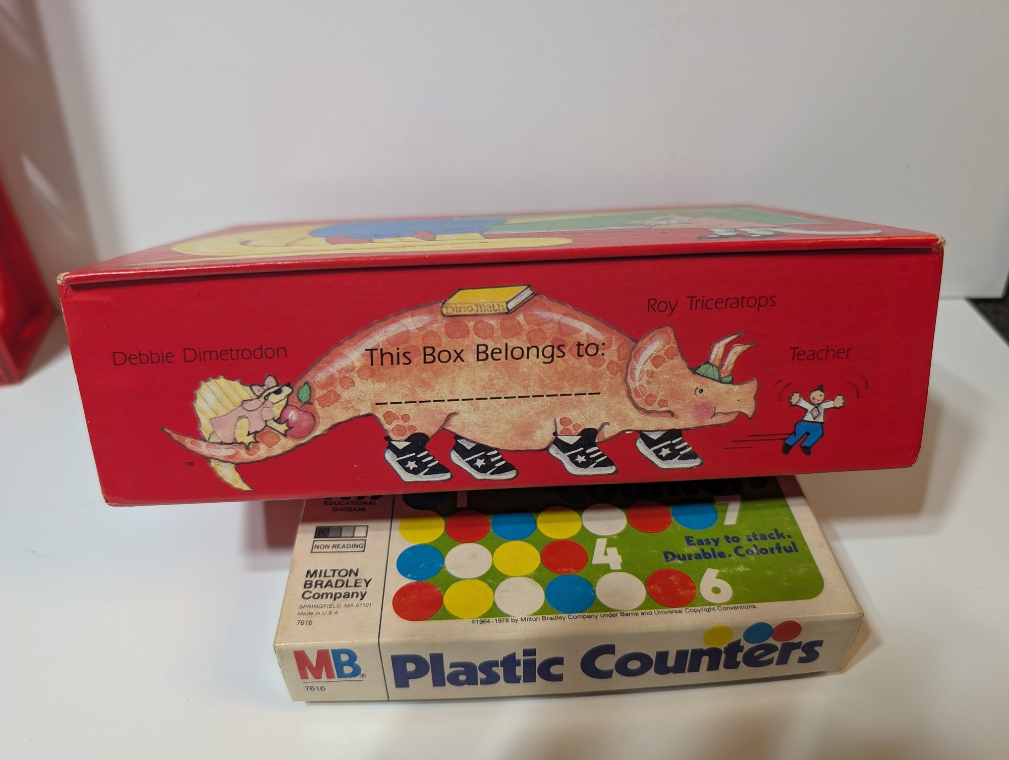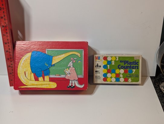 Vintage Milton Bradley 100 Plastic Counters & Crystal Collins-Sterling DinoMath Box Colectibles