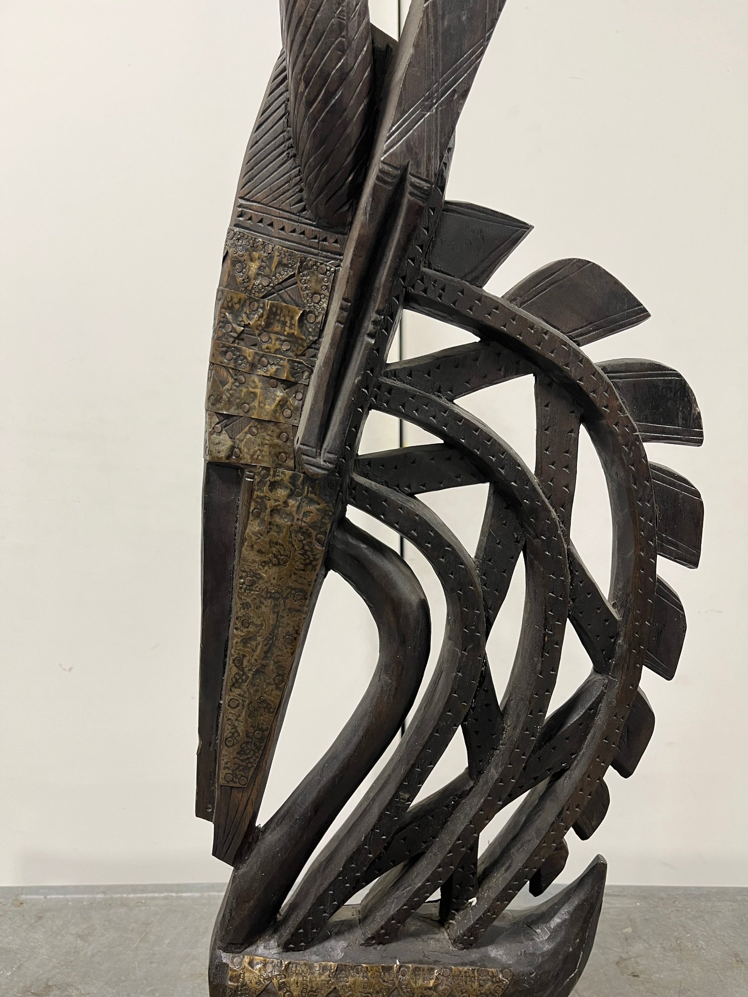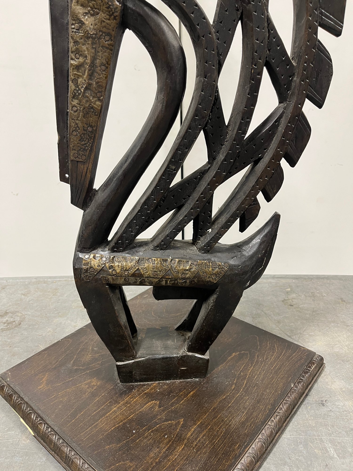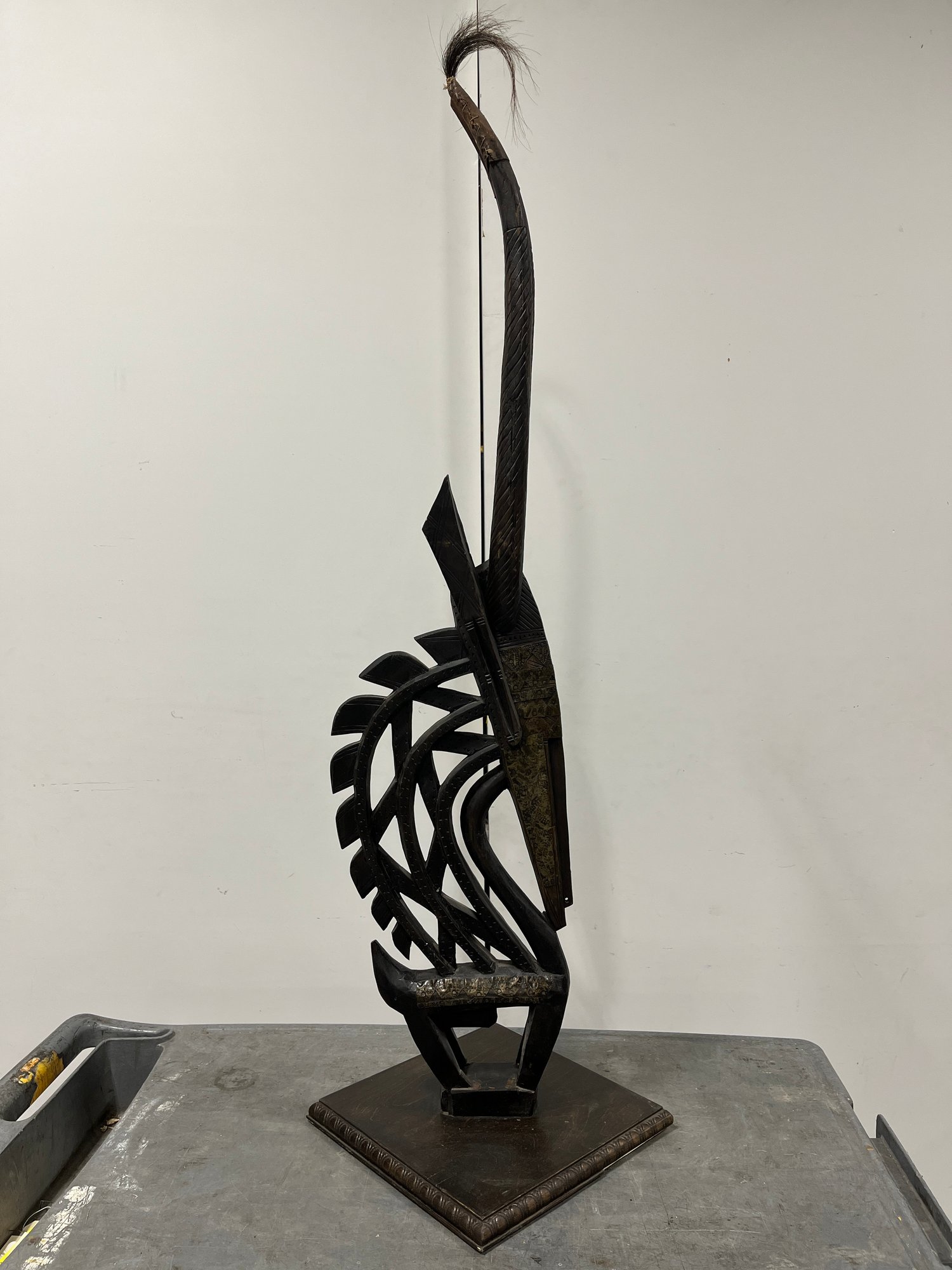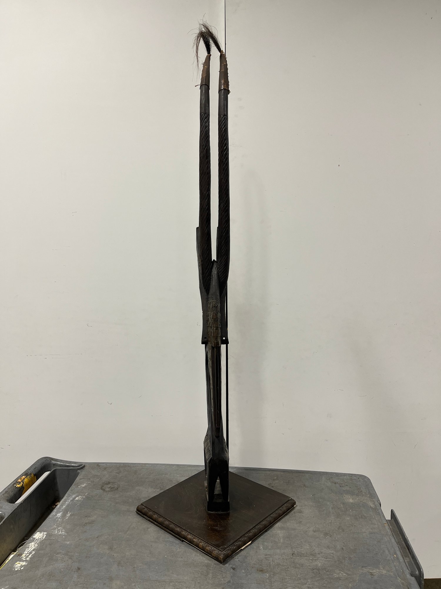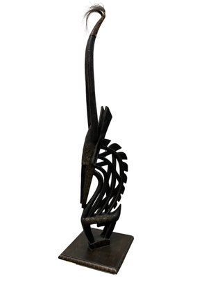 This striking vertical-style scultpure represents the mythical male antelope, Ci Wara. The figure is characterized by its elegant, elongated silhouette and rhythmic negative space. In Bamana culture, the Ci Wara is a "culture hero" who taught humanity the secrets of agriculture.